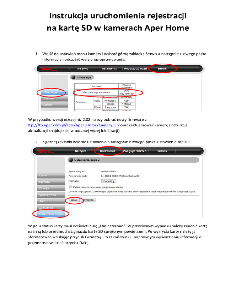Instrukcja uruchomienia rejestracji na kartę SD w kamerach Aper Home 1. Wejść do ustawień menu kamery i wybrać górną zakładkę Serwis a następnie z lewego paska Informacje i odczytać wersję oprogramowania: W przypadku wersji niższej niż 2.02 należy pobrać nowy firmware z ftp://ftp.aper.com.pl/cctv/Aper_Home/Kamery_IP/ oraz zaktualizować kamerę (instrukcja aktualizacji znajduje się w podanej wyżej lokalizacji). 2. Z górnej zakładki wybrać Ustawienia a następnie z lewego paska Ustawienia zapisu: W polu status karty musi wyświetlić się „Umieszczono”. W przeciwnym wypadku należy zmienić kartę na inną lub przedmuchać gniazdo karty SD sprężonym powietrzem. Po wykryciu karty należy ją sformatować wciskając przycisk Formatuj. Po zakończeniu i poprawnym wyświetleniu informacji o pojemności wcisnąć przycisk Dalej. 3. W kolejnym oknie wybieramy jakie zdarzenie ma powodować rejestracje wideo na karcie oraz jak długo po wystąpieniu tego zdarzenia obraz będzie się rejestrował. W poniższym przykładzie kamera nagra jedno minutowy film w momencie wykrycia ruchu w obrazie. Po wybraniu parametrów należy wcisnąć przycisk Zapisz. 4. Ponieważ w poprzednim punkcie wybrano detekcję ruchu jako czynnik rozpoczynający zapis na kartę SD, to należy skonfigurować parametry pracy detekcji ruchu. Analogicznie należało by postąpić w przypadku detekcji dźwięku czy wejść alarmowych. 5. Z paska bocznego wybieramy Zdarzenia a następnie z rozwiniętego drzewa Detekcja Ruchu. Ustawienia polegają na wyborze obszaru detekcji (strefy 0, 1 lub 2) i wrysowaniu tego obszaru w pole podglądu wideo oraz określenia czułości detekcji. Po zakończeniu wciskamy przycisk Zapisz. 6. Poprawność działania zdarzeń możemy zweryfikować wybierając z górnego paska Podgląd zdarzeń. Na liście będą pojawiać się informacje o detekcji ruchu, detekcji dźwięku i zwarciu wejść alarmowych. Jeżeli w tym miejscu lista będzie pusta to nagrania również nie wystąpią. 7. Aby odtworzyć zapisane w ten sposób nagrania należy z bocznej zakładki wybrać Historia zapisu i poczekać na załadowanie plików z karty. Przy pierwszym nagraniu należy odczekać około 1 minuty aż zakończy się rejestracja pierwszego pliku. Pliki w formacie avi można pobrać na dysk komputera lub wcisnąć odtwarzanie (co również sprowadza się do pobrania pliku i automatycznego otworzenia go w systemowym Windows Media Player).