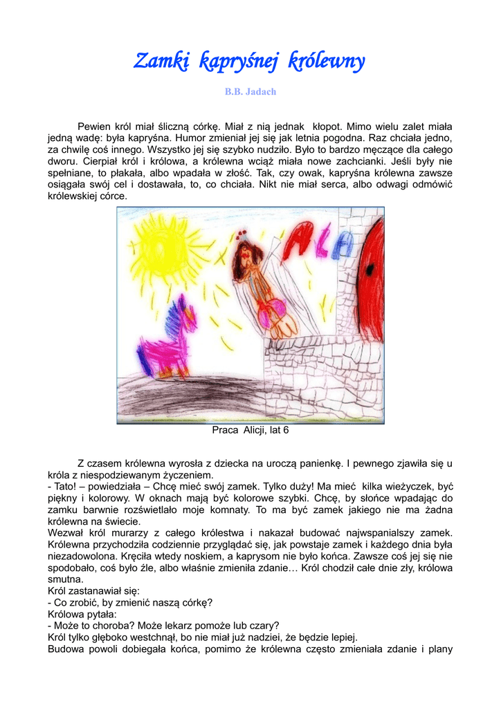 Zamki kapryśnej królewny B.B. Jadach Pewien król miał śliczną córkę. Miał z nią jednak kłopot. Mimo wielu zalet miała jedną wadę: była kapryśna. Humor zmieniał jej się jak letnia pogodna. Raz chciała jedno, za chwilę coś innego. Wszystko jej się szybko nudziło. Było to bardzo męczące dla całego dworu. Cierpiał król i królowa, a królewna wciąż miała nowe zachcianki. Jeśli były nie spełniane, to płakała, albo wpadała w złość. Tak, czy owak, kapryśna królewna zawsze osiągała swój cel i dostawała, to, co chciała. Nikt nie miał serca, albo odwagi odmówić królewskiej córce. Praca Alicji, lat 6 Z czasem królewna wyrosła z dziecka na uroczą panienkę. I pewnego zjawiła się u króla z niespodziewanym życzeniem. - Tato! – powiedziała – Chcę mieć swój zamek. Tylko duży! Ma mieć kilka wieżyczek, być piękny i kolorowy. W oknach mają być kolorowe szybki. Chcę, by słońce wpadając do zamku barwnie rozświetlało moje komnaty. To ma być zamek jakiego nie ma żadna królewna na świecie. Wezwał król murarzy z całego królestwa i nakazał budować najwspanialszy zamek. Królewna przychodziła codziennie przyglądać się, jak powstaje zamek i każdego dnia była niezadowolona. Kręciła wtedy noskiem, a kaprysom nie było końca. Zawsze coś jej się nie spodobało, coś było źle, albo właśnie zmieniła zdanie… Król chodził całe dnie zły, królowa smutna. Król zastanawiał się: - Co zrobić, by zmienić naszą córkę? Królowa pytała: - Może to choroba? Może lekarz pomoże lub czary? Król tylko głęboko westchnął, bo nie miał już nadziei, że będzie lepiej. Budowa powoli dobiegała końca, pomimo że królewna często zmieniała zdanie i plany swego zamku. Wreszcie szczęśliwi budowniczy opuścili teren budowy i powrócili do swoich domów, a królewna wprowadziła się do swojego zamku. Praca Natalki, lat 4 Na początku bardzo się z niego cieszyła, była dumna, że taki wymyśliła. Lecz kiedy w nim jakiś czas pomieszkała, zaczęła jak zwykle zmieniać zdanie. Tym razem wymyśliła, że zamiast wzorów na zewnętrznych ścianach mają być wtopione brylanty, rubiny, szafiry i szmaragdy, by zamek już z daleka mienił się w słońcu. Król, choć zawsze ustępował córce, tym razem bardzo się rozgniewał. - Czy ty wiesz, czego żądasz? – spytał król tak zdenerwowany, że omal nie pękł ze złości. – Masz pojęcie, że to będzie kosztować majątek? - Poza tym murów nie ozdabia się klejnotami…. – wtrąciła królowa. - I nie będziesz czuła się bezpieczna w takim bogatym zamku. - Tak, tak! – poparł król słowa królowej. – Zaraz zbiegną się złodzieje, żeby cię okraść z tych błyskotek. - To postawisz ojcze straże wokół zamku. - Jak to? – przeraził się król na coraz dziwniejsze pomysły córki. – Na dzień i na noc? Król w milczeniu odszedł do swej komnaty, by uniknąć dalszej dyskusji. Bał się nawet pomyśleć, jakie mogą królewnie jeszcze przyjść pomysły do głowy. Zbliżał się wieczór, lecz król mimo zmęczenia nie mógł zasnąć. Postanowił więc przejść się po ogrodzie. Księżyc był w pełni i jasno oświetlał ścieżki i alejki. Król spacerował więc powoli, wdychając chłodne, nocne powietrze. Zawędrował w ten sposób do królewskiego sadu. Dojrzewały tam właśnie słodkie, ciemne winogrona. Król bardzo je lubił. Zatrzymał się więc przy krzewie i zaczął podjadać. Nie wiadomo kiedy i skąd, jakby spod liści, nagle zjawiła się staruszka i spytała: - Też zgłodniałam, czy dostanę kilka słodkich winogron? Król w pierwszej chwili wystraszył się. Zobaczył jednak, że to staruszka i powiedział: - A zrywaj sobie do woli, wystarczy dla nas obu tych winogron i jeszcze zostanie. Jedli w milczeniu, a z każdym zjedzonym winogronem staruszka zaczęła się zmieniać. Król najpierw nie zwrócił na to uwagi. Potem jednak było to coraz bardziej widoczne. - Kim jesteś? – spytał, widząc, jak przemieniła się ze staruszki w młodą dziewczynę. Miała teraz długie, fioletowe włosy i przeźroczyste skrzydełka. Sukienka przypominała liście winogronowe. - Jestem winogronową wróżką. – powiedziała cichutko.- Chciałam sprawdzić, czy masz dobre serce. Król nie wiedział, ale winogrona, które z nią jadł, stawały się magiczne. Po powrocie do zamku dały mu długi i mocny sen. Rano król obudził się radosny i wypoczęty. Królowa była zdziwiona: - Masz dobry humor. Co się stało? – spytała. - Miałem w nocy dziwny sen, ale pomoże on chyba mi rozwiązać problem naszej córki, kapryśnej królewny. Królową bardzo zaciekawił ten sen. Król więc dokładnie wszystko jej opowiedział, łącznie ze spotkaniem z winogronową wróżką. - Tak więc mam wybudować taki zamek dla królewny i to ją odczaruje. – powiedział na zakończenie swojej opowieści. Kiedy wróci za tydzień z podróży, akurat będzie gotowy. Gdy po powrocie królewna usłyszała nowiny, aż krzyknęła i ze złości i tupnęła nogą: - Nie będę mieszkać w czarnym zamku, z jednym oknem ! Chcę z powrotem mój kolorowy, nawet bez kosztownych kamieni. - Nie córko, decyzja zapadła. Za długo kaprysiłaś. Zamek już gotowy. - Jak to? Gotowy? W jeden dzień…. – nie rozumiała królewna. – To kiedy go wybudowano? - To malutki zameczek. Budowa nie trwała długo. Królewna się złościła, krzyczała na wszystkich dworzan po kolei, potem płakała, ale król zdania nie zmienił. Wierzył winogronowej wróżce, że tylko pobyt w czarnym zamku odczaruje i odmieni kapryśną królewnę. Chcąc nie chcąc królewna przeprowadziła się do czarnego zamku. Praca Natalki, lat 4 Mieszkała tam sama, smutno jej było. Dworzanie przychodzili tylko na krótko, by jej usługiwać i wracali na dwór króla. By się nie nudzić królewna zaczęła wyszukiwać sobie różne zajęcia, których do tej pory nie robiła, bo uważa