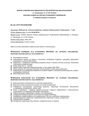 ZESPÓŁ PARKÓW KRAJOBRAZOWYCH WOJEWÓDZTWA MAŁOPOLSKIEGO ul. Vetulaniego 1a, 31-227 Kraków OGŁASZA NABÓR NA WOLNE STANOWISKO URZĘDNICZE w Oddziale Zespołu w Krakowie Nr ref. OT/1101/2/2015/IB Stanowisko: Referent ds. ochrony krajobrazu, wartości historycznych i kulturowych – 1 etat Termin składania ofert: do dnia 22.09.2015 r. Miejsce pracy: Oddział Zespołu Parków Krajobrazowych Województwa Małopolskiego w Krakowie, ul. Vetulaniego 1a, 31-227 Kraków Wymiar czasu pracy: pełny etat Forma zatrudnienia: umowa o pracę Nabór na wolne stanowisko urzędnicze jest otwarty i konkurencyjny. WYMAGANIA NIEZBĘDNE DLA STANOWISKA REFERENT DS. OCHRONY KRAJOBRAZU, WARTOŚCI HISTORYCZNYCH I KULTUROWYCH: 1) Obywatelstwo polskie; 2) Wykształcenie wyższe na jednym z kierunków: architektura krajobrazu, geografia, gospodarka przestrzenna, ochrona dóbr kultury; 3) Znajomość i umiejętność interpretacji przepisów prawa z zakresu ochrony przyrody, środowiska i planowania przestrzennego; 4) Prawo jazdy kat. B – czynne; 5) Bardzo dobra znajomość obsługi komputera, w tym pakietu MS Office; 6) Pełna zdolność do czynności prawnych oraz korzystania z pełni praw publicznych; 7) Niekaralność za przestępstwa popełnione umyślnie ścigane z oskarżenia publicznego lub umyślne przestępstwo skarbowe; 8) Nieposzlakowana opinia. WYMAGANIA DODATKOWE DLA STANOWISKA WARTOŚCI HISTORYCZNYCH I KULTUROWYCH: REFERENT DS. OCHRONY KRAJOBRAZU, 1) Udokumentowane doświadczenie w zakresie projektowania; 2) Znajomość zasad pozyskiwania środków ze źródeł zewnętrznych; 3) Umiejętność precyzyjnego, poprawnego językowo, logicznego formułowania dokumentów o charakterze normatywnym, umów, pism; 4) Praca z przepisami – ustalanie regulacji prawnych mających zastosowanie w dokonywanych czynnościach, ich właściwej interpretacji i stosowania; 5) Znajomość języka angielskiego w stopniu komunikatywnym; 6) Umiejętność obsługi programu Corel Draw lub Adobe Photoshop; 7) Umiejętność obsługi programu do projektowania CAD lub o podobnym zastosowaniu; 8) Odpowiedzialność, staranność, systematyczność, odporność na stres, kreatywność; 9) Wysoka kultura osobista; 10) Umiejętność organizacji pracy własnej i umiejętność pracy w zespole. ZAKRES ZADAŃ WYKONYWANYCH NA STANOWISKU REFERENT DS. OCHRONY KRAJOBRAZU, WARTOŚCI HISTORYCZNYCH I KULTUROWYCH: 1) Realizacja zadań z zakresu ochrony przyrody zgodnie z założeniami statutowymi Zespołu Parków Krajobrazowych Województwa Małopolskiego; 2) Opiniowanie zamierzeń inwestycyjnych pod kątem zgodności z obowiązującymi planami ochrony oraz obowiązującymi ustaleniami urbanistyczno-architektonicznymi dla gmin; 3) Przygotowywanie materiałów do sporządzenia planów ochrony parków; 4) Opiniowanie studium uwarunkowań i kierunków przestrzennego zagospodarowania gmin w zakresie ochrony krajobrazu; 5) Opiniowanie miejscowych planów dla gmin; 6) Udział w opracowaniu wytycznych i wdrażanie form budownictwa nawiązującego do tradycji Regionu; 7) Współpraca z gminami w zakresie urbanistyki, architektury i planowania przestrzennego; 8) Promocja ochrony krajobrazu i form budownictwa nawiązujących do tradycji Regionu; 9) Wizje terenowe dotyczące lokalizacji opiniowanych inwestycji oraz uzgodnień do planów miejscowych zagospodarowania gmin; 10) Udział w opracowaniu koncepcji ścieżek dydaktycznych, opracowanie projektów technicznych oznakowania, urządzeń i małej architektury; 11) Prowadzenie sprawozdawczości w zakresie prowadzonych spraw; 12) Informowanie społeczeństwa o przepisach o ochronie przyrody; 13) Dbałość o systematyczne gromadzenie dokumentacji i katalogowanie materiałów archiwalnych; 14) Informowanie bezpośredniego przełożonego o przebiegu realizacji zadań oraz o dostrzeżonych nieprawidłowościach; 15) Przestrzeganie przepisów prawa oraz bieżący monitoring zmian legislacyjnych z zakresu ochrony przyrody; 16) Zapewnienie właściwego obiegu dokumentów; 17) Wykonywanie innych zadań zleconych przez Kierownika Oddziału i Dyrektora Zespołu. INFORMACJA O WARUNKACH PRACY NA STANOWISKU: Praca w budynku Oddziału ZPKWM w Krakowie (ul. Vetulaniego 1a, 31-227 Kraków) i w terenie. Budynek nie posiada windy i podjazdu. Praca przy monitorze ekranowym powyżej 4 godzin dziennie przy naturalnym i sztucznym oświetleniu, obsługa urządzeń biurowych. WYMAGANE DOKUMENTY FORMALNE: 1) Życiorys (CV); 2) List motywacyjny; 3) Kserokopie dokumentów poświadczających wykształcenie (dyplom lub zaświadczenie o stanie odbytych studiów) oraz staż pracy; 4) Kwestionariusz osobowy dla osoby ubiegającej się o zatrudnienie; 5) Oświadczenie kandydata, o niekaralności za umyślne przestępstwo ścigane z oskarżenia publicznego lub umyślne przestępstwo skarbowe; 6) Oświadczenie kandydata, że posiada pełną zdolność do czynności prawnych oraz korzysta z pełni praw publicznych; 7) Oświadczenie o nieposzlakowanej opinii; 8) Inne dodatkowe dokumenty o posiadanych kwalifikacjach i umiejętnościach. Dokumenty aplikacyjne: list motywacyjny i szczegółowe CV powinny być opatrzone własnoręcznie podpisaną klauzulą: „Wyrażam zgodę na przetwarzanie moich danych osobowych zawartych w ofercie pracy dla potrzeb niezbędnych do realizacji procesu rekrutacji zgodnie z Ustawą z dnia 29 sierpnia 1997 r. o ochronie danych osobowych (Dz. U. z 2002 r. Nr 101, poz. 926 ze zm.) oraz ustawą z dn. 21.11.2008 o pracownikach samorządowych (Dz. U. z 2008 r. Nr 223, poz. 1458 ze zm.)”. Mile widziane oferty osób posiadających orzeczenie o niepełnosprawności, jednakże ze względu na mobilny charakter wykonywanych czynności oraz wzmożone kontakty interpersonalne, stopień niepełnosprawności nie może stanowić przeszkody w realizacji zadań. Dostęp do miejsca pracy jest utrudniony ze względu na uwarunkowania architektoniczne budynku. Zgłoszenia kandydatów złożone po terminie, w inny sposób n