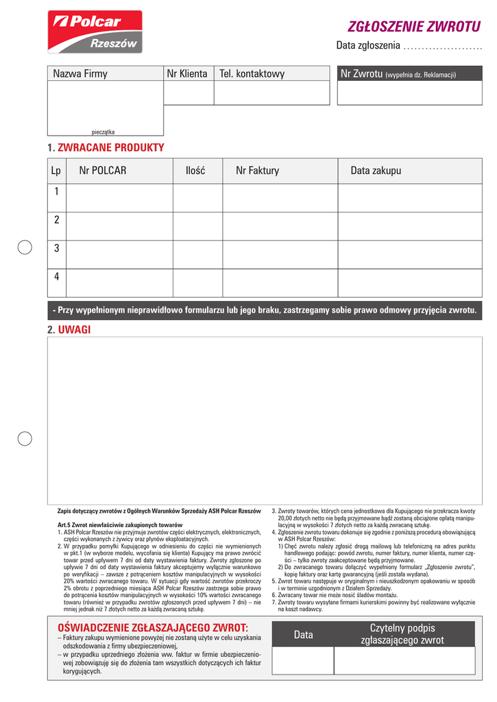 ZGŁOSZENIE ZWROTU Data zgłoszenia …………………. Nazwa Firmy Nr Klienta Tel. kontaktowy Nr Zwrotu (wypełnia dz. Reklamacji) pieczątka 1. ZWRACANE PRODUKTY Lp Nr POLCAR Ilość Nr Faktury Data zakupu 1 2 3 4 - Przy wypełnionym nieprawidłowo formularzu lub jego braku, zastrzegamy sobie prawo odmowy przyjęcia zwrotu. 2. UWAGI Zapis dotyczący zwrotów z Ogólnych Warunków Sprzedaży ASH Polcar Rzeszów Art.5 Zwrot niewłaściwie zakupionych towarów 1. ASH Polcar Rzeszów nie przyjmuje zwrotów części elektrycznych, elektronicznych, części wykonanych z żywicy oraz płynów eksploatacyjnych. 2. W przypadku pomyłki Kupującego w odniesieniu do części nie wymienionych w pkt.1 (w wyborze modelu, wycofania się klienta) Kupujący ma prawo zwrócić towar przed upływem 7 dni od daty wystawienia faktury. Zwroty zgłoszone po upływie 7 dni od daty wystawienia faktury akceptujemy wyłącznie warunkowo po weryfikacji – zawsze z potrąceniem kosztów manipulacyjnych w wysokości 20% wartości zwracanego towaru. W sytuacji gdy wartość zwrotów przekroczy 2% obrotu z poprzedniego miesiąca ASH Polcar Rzeszów zastrzega sobie prawo do potrącenia kosztów manipulacyjnych w wysokości 10% wartości zwracanego towaru (również w przypadku zwrotów zgłoszonych przed upływem 7 dni) – nie mniej jednak niż 7 złotych netto za każdą zwracaną sztukę. OŚWIADCZENIE ZGŁASZAJĄCEGO ZWROT: – Faktury zakupu wymienione powyżej nie zostaną użyte w celu uzyskania odszkodowania z firmy ubezpieczeniowej, – w przypadku uprzedniego złożenia ww. faktur w firmie ubezpieczeniowej zobowiązuję się do złożenia tam wszystkich dotyczących ich faktur korygujących. 3. Z wroty towarów, których cena jednostkowa dla Kupującego nie przekracza kwoty 20,00 złotych netto nie będą przyjmowane bądź zostaną obciążone opłatą manipulacyjną w wysokości 7 złotych netto za każdą zwracaną sztukę. 4. Z głoszenie zwrotu towaru dokonuje się zgodnie z poniższą procedurą obowiązującą w ASH Polcar Rzeszów: 1) C hęć zwrotu należy zgłosić drogą mailową lub telefoniczną na adres punktu handlowego podając: powód zwrotu, numer faktury, numer klienta, numer części – tylko zwroty zaakceptowane będą przyjmowane. 2) D o zwracanego towaru dołączyć wypełniony formularz „Zgłoszenie zwrotu”, kopię faktury oraz kartę gwarancyjną (jeśli została wydana). 5. Z wrot towaru następuje w oryginalnym i nieuszkodzonym opakowaniu w sposób i w terminie uzgodnionym z Działem Sprzedaży. 6. Zwracany towar nie może nosić śladów montażu. 7. Z wroty towaru wysyłane firmami kurierskimi powinny być realizowane wyłącznie na koszt nadawcy. Data Czytelny podpis zgłaszającego zwrot