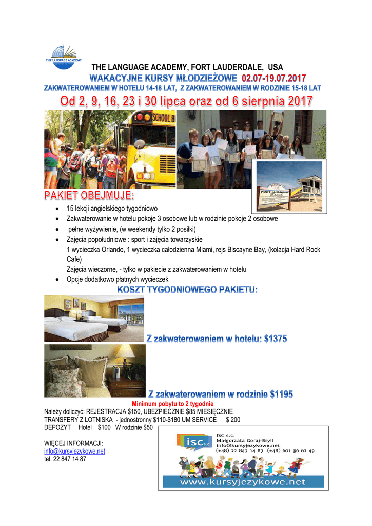 THE LANGUAGE ACADEMY, FORT LAUDERDALE, USA 15 lekcji angielskiego tygodniowo Zakwaterowanie w hotelu pokoje 3 osobowe lub w rodzinie pokoje 2 osobowe pełne wyżywienie, (w weekendy tylko 2 posiłki) Zajęcia popołudniowe : sport i zajęcia towarzyskie 1 wycieczka Orlando, 1 wycieczka całodzienna Miami, rejs Biscayne Bay, (kolacja Hard Rock Cafe) Zajęcia wieczorne, - tylko w pakiecie z zakwaterowaniem w hotelu Opcje dodatkowo płatnych wycieczek Minimum pobytu to 2 tygodnie Należy doliczyć: REJESTRACJA $150, UBEZPIECZNIE $85 MIESIĘCZNIE TRANSFERY Z LOTNISKA - jednostronny $110-$180 UM SERVICE $ 200 DEPOZYT Hotel $100 W rodzinie $50 WIĘCEJ INFORMACJI: [email protected] tel: 22 847 14 87
