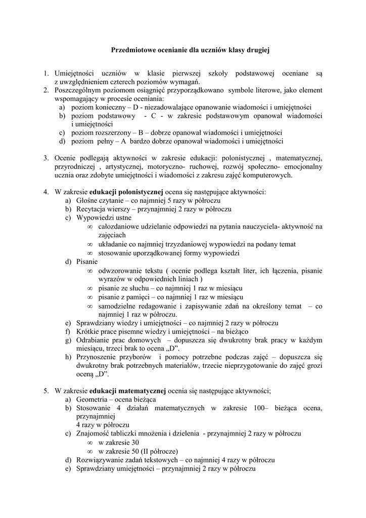 Przedmiotowe ocenianie dla uczniów klasy drugiej 1. Umiejętności uczniów w klasie pierwszej szkoły podstawowej oceniane są z uwzględnieniem czterech poziomów wymagań. 2. Poszczególnym poziomom osiągnięć przyporządkowano symbole literowe, jako element wspomagający w procesie oceniania: a) poziom konieczny – D - niezadowalające opanowanie wiadomości i umiejętności b) poziom podstawowy - C - w zakresie podstawowym opanował wiadomości i umiejętności c) poziom rozszerzony – B – dobrze opanował wiadomości i umiejętności d) poziom pełny – A bardzo dobrze opanował wiadomości i umiejętności 3. Ocenie podlegają aktywności w zakresie edukacji: polonistycznej , matematycznej, przyrodniczej , artystycznej, motoryczno- ruchowej, rozwój społeczno- emocjonalny ucznia oraz zdobyte umiejętności i wiadomości z zakresu zajęć komputerowych. 4. W zakresie edukacji polonistycznej ocena się następujące aktywności: a) Głośne czytanie – co najmniej 5 razy w półroczu b) Recytacja wierszy – przynajmniej 2 razy w półroczu c) Wypowiedzi ustne • całozdaniowe udzielanie odpowiedzi na pytania nauczyciela- aktywność na zajęciach • układanie co najmniej trzyzdaniowej wypowiedzi na podany temat • stosowanie uporządkowanej formy wypowiedzi d) Pisanie • odwzorowanie tekstu ( ocenie podlega kształt liter, ich łączenia, pisanie wyrazów w odpowiednich liniach ) • pisanie ze słuchu – co najmniej 1 raz w miesiącu • pisanie z pamięci – co najmniej 1 raz w miesiącu • samodzielne redagowanie i zapisywanie zdań na określony temat – co najmniej 1 raz w półroczu. e) Sprawdziany wiedzy i umiejętności – co najmniej 2 razy w półroczu f) Krótkie prace pisemne wiedzy i umiejętności – na bieżąco g) Odrabianie prac domowych – dopuszcza się dwukrotny brak pracy w każdym miesiącu, trzeci brak to ocena „D”. h) Przynoszenie przyborów i pomocy potrzebne podczas zajęć – dopuszcza się dwukrotny brak potrzebnych materiałów, trzecie nieprzygotowanie do zajęć grozi oceną „D”. 5. W zakresie edukacji matematycznej ocenia się następujące aktywności; a) Geometria – ocena bieżąca b) Stosowanie 4 działań matematycznych w zakresie 100– bieżąca ocena, przynajmniej 4 razy w półroczu c) Znajomość tabliczki mnożenia i dzielenia - przynajmniej 2 razy w półroczu • w zakresie 30 • w zakresie 50 (II półrocze) d) Rozwiązywanie zadań tekstowych – co najmniej 4 razy w półroczu e) Sprawdziany umiejętności – przynajmniej 2 razy w półroczu f) Krótkie prace pisemne – na bieżąco g) Przynoszenie przyborów i pomocy potrzebnych podczas zajęć – dopuszcza się dwukrotny brak potrzebnych materiałów, trzecie nieprzygotownie do zajęć grozi oceną „D” h) Odrabianie prac domowych – dopuszcza się dwukrotny brak pracy w każdym miesiącu, trzeci brak to ocena „D” 6. W zakresie edukacji przyrodniczej ocenia się następujące umiejętności w zależności od opracowywanych treści; a) Sprawdziany umiejętności – przynajmniej raz w półroczu b) Krótkie prace sprawdzające oraz wypowiedzi ustne – na bieżąco Elementy edukacji przyrodniczej zawarte są sprawdzianach umiejętności z edukacji polonistycznej i matematycznej – oceny dokonuje się co najmniej 2 razy w roku szkolnym; 7. W zakresie edukacji artystycznej ocenia się następujące umiejętności w zależności od opracowywanych treści; a) wysiłek i zaangażowanie w wykonanie pracy ; b) umiejętność śpiewania piosenek; c) uczeń jest zobowiązany do wykonania każdej pracy plastyczno-technicznej; w przypadku nie oddania pracy otrzymuje ocenę niedostateczną ( wyjątek stanowi usprawiedliwiona nieobecność na zajęciach), d) dopuszcza się dwukrotny brak potrzebnych materiałów na zajęciach ; e) uczeń otrzymuje pozytywną ocenę w przypadku wykonania dodatkowej pracy konkursowej; 8. W zakresie edukacji motoryczno-ruchowej ocenie podlegają następujące umiejętności: a) wysiłek i zaangażowanie w wykonanie poszczególnych ćwiczeń b) poprawność wykonania ćwiczeń gimnastycznych- co najmniej 3 razy w półroczu; c) sprawność motoryczną ( lekkoatletyka) – przynajmniej 2 razy w półroczu; d) znajomość zasad gier i zabaw ruchowych – przynajmniej 1 raz w półroczu; e) dokładność wykonywania ćwiczeń wstępnych, tzw. rozgrzewki- przynajmniej 1 raz w półroczu; f) uczeń jest oceniony z aktywny udział w zawodach sportowych; g) uczeń jest zwolniony z ćwiczeń po uprzednim pisemnym usprawiedliwieniu rodziców( opiekunów) 9. W zakresie zajęć komputerowych ocenie podlegają następujące umiejętności a) posługiwanie się narzędziami programu graficznego Paint zgodnie z poleceniem nauczyciela- co najmniej 3 razy w półroczu; b) posługiwania się narzędziami edytora pisma MSWord podczas wykonywania poszczególnych prac –co najmniej 2 razy w półroczu; c) estetyczne prowadzenie zeszytu – co najmniej 1 raz w półroczu; d) dopuszcza się ocenę aktywności ucznia na zajęciach – zgłaszanie się do odpowiedzi, sprawne wykonywanie ćwiczeń podczas zajęć, współpracę w grupie; e) uczeń otrzymuje pozytywną ocenę w przypadku wykonania dodatkowej pracy konkursowej; Przewiduje się krótkie sprawdziany wiedzy i umiejętności z zakresu zajęć komputerowych. 10. W zakresie rozwoju społeczno- emocjonalnego ocenie podlega: a) b) c) d) Zaangażowanie w codzienne sprawy klasy i szkoły Wrażliwość na potrzeby innych Aktywność na zajęciach edukacyjnych Umiejętność współpracy w grupie 4. Dopuszcza się stosowanie testów kompetencji dla uczniów klasy drugiej, mających na celu ocenę poziomu umiejętności z poszczególnych edukacji. 5. Każdy nauczyciel powinien podczas formułowania oceny opisowej (rocznej) wziąć pod uwagę postępy, jakie poczyniło dziecko w danym roku szkolnym z zakresu danej edukacji oraz uwzględnić wskazówki do pracy w przyszłym roku szkolnym.