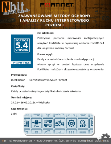 ZAAWANSOWANE METODY OCHRONY I ANALIZY RUCHU INTERNETOWEGO POZIOM I Cel szkolenia: Praktyczne poznanie możliwości konfiguracyjnych urządzeń FortiGate w najnowszej odsłonie FortiOS 5.4 dla urządzeń z rodziny Fortinet Forma zajęć: Każdy z uczestników szkolenia ma do dyspozycji własny sprzęt w postaci laptopa oraz urządzenie FortiGate, na którym aktywnie uczestniczy w szkoleniu Prowadzący: Jacek Baron — Certyfikowany inżynier Fortinet Certyfikaty: Każdy uczestnik otrzymuje certyfikat ukończenia szkolenia Termin i miejsce: 24.02—26.02.2016r.—Wieliczka Czas trwania: 3 dni PROGRAM PROGRAMSZKOLENIA SZKOLENIA Wprowadzenie do szkolenia I DZIEŃ Prezentacja nowości Fortinet Omówienie najnowszej wersji Firmware Aktualizacja urządzeń do wersji 5.4 Dashboard CLI Console, Interface History, System Resources FortiView Sources, Destinations, Policies, Device Topology, All Sessions Network Interfaces, DNS, DNS Servers II DZIEŃ System Administrators, Admin Profiles, Settings, Replacement Messages, FortiGuard, Policy & Objects IPv4 Policy, Addresses, Services, Schedules, Virtual Ips, Traffic Shapers Security Profiles AntiVirus, Web Filter, DNS Filter, Application Control, III DZIEŃ Cloud Access Security, Inspection,,Intrusion Protection, Anti-Spam, Data Leak Prevention, VoIP, ICAP, Web Application Firewall, FortiClient Profiles, Proxy Options, SSL Inspection, Log & Report Forward Traffic, Security Log, Log Settings