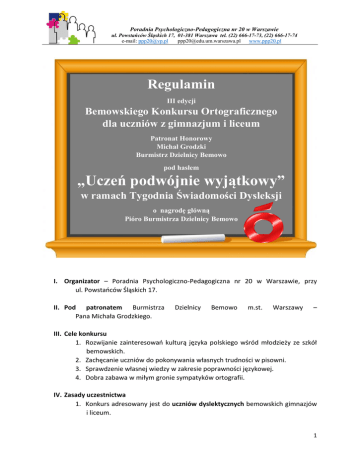 Poradnia Psychologiczno-Pedagogiczna nr 20 w Warszawie ul. Powstańców Śląskich 17, 01-381 Warszawa tel. (22) 666-17-73, (22) 666-17-74 e-mail: [email protected] [email protected] www.ppp20.pl Regulamin III edycji Bemowskiego Konkursu Ortograficznego dla uczniów z gimnazjum i liceum Patronat Honorowy Michał Grodzki Burmistrz Dzielnicy Bemowo pod hasłem „Uczeń podwójnie wyjątkowy” w ramach Tygodnia Świadomości Dysleksji o nagrodę główną Pióro Burmistrza Dzielnicy Bemowo I. Organizator – Poradnia Psychologiczno-Pedagogiczna nr 20 w Warszawie, przy ul. Powstańców Śląskich 17. II. Pod patronatem Burmistrza Pana Michała Grodzkiego. Dzielnicy Bemowo m.st. Warszawy – III. Cele konkursu 1. Rozwijanie zainteresowań kulturą języka polskiego wśród młodzieży ze szkół bemowskich. 2. Zachęcanie uczniów do pokonywania własnych trudności w pisowni. 3. Sprawdzenie własnej wiedzy w zakresie poprawności językowej. 4. Dobra zabawa w miłym gronie sympatyków ortografii. IV. Zasady uczestnictwa 1. Konkurs adresowany jest do uczniów dyslektycznych bemowskich gimnazjów i liceum. 1 Poradnia Psychologiczno-Pedagogiczna nr 20 w Warszawie ul. Powstańców Śląskich 17, 01-381 Warszawa tel. (22) 666-17-73, (22) 666-17-74 e-mail: [email protected] [email protected] www.ppp20.pl 2. W konkursie może wziąć udział po trzech przedstawicieli z każdego bemowskiego gimnazjum i szkoły ponadgimnazjalnej. 3. Termin nadsyłania zgłoszeń uczestników upływa w dniu 14.10.2016 r. 4. Zgłoszenia (imię, nazwisko, nazwa szkoły, klasa, tel. kontaktowy, mail) należy nadsyłać na adres poczty elektronicznej poradni: [email protected] z dopiskiem: „bemowskie dyktando”, telefonicznie (22) 666-17-74, (22) 664 49 51 lub osobiście w sekretariacie Poradni ( ul. Powstańców Śląskich 17). 5. Stopień trudności jest dla wszystkich uczestników jednakowy. 6. Zgłoszenie uczestnictwa jest równoznaczne z wyrażeniem zgody na przetwarzanie danych osobowych do celów organizacyjnych i marketingowych organizatora Dyktanda (zgodnie z ustawą z dnia 29 sierpnia 1997 r. o ochronie danych osobowych – Dz.U. z 2002 r. Nr 101, poz., 926, ze zm.). Uzyskane dane nie będą przekazywane innym podmiotom. Osobę wyłonioną w konkursie do otrzymania I nagrody Pióra Bemowskiego Mistrza Ortografii prosimy o dostarczenie organizatorom oświadczenia opiekunów prawnych o wyrażeniu zgody na wykorzystanie wizerunku dziecka. V. Organizacja przebiegu konkursu 1. Konkurs odbędzie się w dniu 20.10.2016 r. o godz. 13:00 w siedzibie Poradni Psychologiczno-Pedagogicznej nr 20 przy ul. Powstańców Śląskich 17 w Warszawie. 2. Za opracowanie tekstu dyktanda, przeprowadzenie dyktanda, nadzór nad prawidłowym przebiegiem oraz sprawdzenie prac odpowiedzialna jest powołana przez organizatorów Komisja Konkursowa, w skład której wchodzą: nauczyciele bemowskich szkół oraz specjaliści Poradni PsychologicznoPedagogicznej nr 20 w Warszawie. 3. Czas trwania części konkursowej – 45 min. 4. Indywidualne prace zostaną zakodowane zgodnie z ustaleniami organizatora. 5. Komisja Konkursowa wyłoni zwycięzcę. 6. Ocenie podlegać będzie zarówno poprawność ortograficzna, interpunkcyjna, jak i gramatyczna. 7. Zwycięzcą konkursu zostaje osoba, która napisała tekst bezbłędnie lub popełniła najmniej błędów (do trzech błędów typowo ortograficznych: ó-u, rzż, ch – h) oraz innych, w zakresie podstawowych zasad i reguł pisowni. 8. W przypadku trudności w wyłonieniu zwycięzcy (więcej niż jedna praca bezbłędna lub prace z tą samą liczbą błędów), organizatorzy zastrzegają sobie prawo do przeprowadzenia dogrywki, w postaci dodatkowego zadania konkursowego. 9. Do oceny dyktanda przyjmuje się następujące kryteria: błędy pierwszego stopnia – typowo ortograficzne(h-ch, rz-ż, ó-u, mała i wielka litera na początku wyrazów, w tytułach, nazwach własnych); błędy drugiego stopnia – pisownia „nie” z różnymi częściami mowy, łączna i rozdzielna pisownia innych wyrazów, błędy fonetyczne, 2 Poradnia Psychologiczno-Pedagogiczna nr 20 w Warszawie ul. Powstańców Śląskich 17, 01-381 Warszawa tel. (22) 666-17-73, (22) 666-17-74 e-mail: [email protected] [email protected] www.ppp20.pl gramatyczne, pisownia cząstek „bym”, „byś”, „by” z różnymi częściami mowy, pisownia rzeczowników zakończonych w D., C., Msc., na i, -ii, -ji; błędy trzeciego stopnia – literówki, błędy interpunkcyjne (trzy błędy interpunkcyjne należy traktować, jako jeden błąd ortograficzny pierwszego stopnia). 10. Prace zostaną sprawdzone przez Komisję w dniu 20.10.2016 r., a wyniki przekazane szkołom dnia następnego. 11. Nagrodą za zdobycie pierwszego miejsca dla Bemowskiego Mistrza Ortografii będzie Pióro Burmistrza Dzielnicy Bemowo. 12. Wszyscy uczestnicy Dyktanda otrzymują dyplomy. 13. Uroczyste wręczenie Pióra Bemowskiego Mistrza Ortografii odbędzie się 27.10.2016 r. w sali sesji Urzędu Dzielnicy Bemowo m.st. Warszawy po konkursie z udziałem dorosłych. 14. O szczegółach dotyczących wręczenia nagrody zwycięzca zostanie poinformowany drogą mailową. 15. Laureaci Bemowskiego Konkursu Ortograficznego wejdą w skład Komisji Konkursowej oceniającej prace uczestników Konkursu Ortograficznego dla Dorosłych. VI. Uwagi końcowe 1. Podczas pisania dyktanda nie można korzystać z żadnych pomocy naukowych (w tym słowników ortograficznych) oraz urządzeń elektronicznych. Przybory oraz karty do pisania dyktanda zostaną zapewnione przez organizatora. 2. Uczestnicy konkursu nie mogą opuszczać sali przed zebraniem prac konkursowych przez Komisję. 3. W przypadku nieczytelnie napisanych prac, Komisja zastrzega sobie możliwość nieoceniania ich. Życzymy dobrej zabawy! 3 Poradnia Psychologiczno-Pedagogiczna nr 20 w Warszawie ul. Powstańców Śląskich 17, 01-381 Warszawa tel. (22) 666-17-73, (22) 666-17-74 e-mail: [email protected] [email protected]