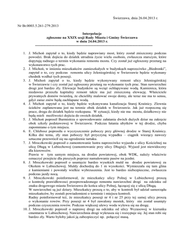Świerzawa, dnia 26.04.2013 r. Nr Br.0003.5.261-279.2013 Interpelacje zgłoszone na XXIX sesji Rady Miasta i Gminy Świerzawa w dniu 24.04.2013 r. ----------------------------------------------------------------------------------------------1. J. Michoń zapytał o to, kiedy będzie naprawiany most, który został zniszczony podczas powodzi. Brak dojścia do działek utrudnia życie wielu osobom, zwłaszcza starszym, które dopytują radnego o termin wykonania remontu mostu. Czy został już ogłoszony przetarg na wykonawstwo tych prac. 2. J. Michoń, w imieniu mieszkańców zamieszkałych w budynkach naprzeciwko „Biedronki”, zapytał o to, czy podczas remontu ulicy Jeleniogórskiej w Świerzawie będzie wykonany chodnik wzdłuż tych posesji. 3. J. Michoń zapytał o to, kiedy będzie wykonywany remont ulicy Jeleniogórskiej w Świerzawie i czy został już ogłoszony przetarg na wykonanie tych prac. Stan nawierzchni drogi jest bardzo zły. Elewacje budynków są wciąż ochlapywane wodą. Kamienica, która niedawno przeszła kapitalny remont także ma już zniszczoną elewację. Właściciele prywatnych domów twierdzą, że chcieliby malować swoje domy, ale teraz nie ma to sensu, gdyż zaraz znów będą zachlapane wodą. 4. J. Michoń zapytał o to, kiedy będzie wykonywana kanalizacja Starej Kraśnicy. Zlewnia ścieków zaplanowana jest na terenie obok działek w Świerzawie. Jak już rozpoczną się prace, droga do działek będzie rozkopana. W sytuacji, kiedy nie ma mostu, działkowcy nie będą mieli możliwości dojścia do swoich działek. 5. J. Michoń poprosił Burmistrza o spowodowanie załatania dwóch dużych dziur na zakręcie obok szkoły podstawowej w Świerzawie. Podczas łatania ubytków w tej drodze, chyba zapomniano o tym miejscu. 6. E. Chlebosz poprosiła o wyczyszczenie poboczy przy głównej drodze w Starej Kraśnicy. Kilka dni temu, zły stan poboczy był przyczyną wypadku – ciągnik wiozący nawozy sztuczne przewrócił się na ogrodzenie tartaku. 7. J. Mroczkowski poprosił o zamontowanie lustra naprzeciwko wyjazdu z ulicy Kościelnej na ulicę Długą w Lubiechowej (zamontowanie przy ulicy Długiej). Wyjazd jest niewidoczny dla kierowców. Prawie w tym samym miejscu, na drodze powiatowej, obok WDK, należy właściwie oznaczyć przejście dla pieszych poprzez namalowanie pasów na jezdni. 8. J. Mroczkowski poprosił o usunięcie bardzo wysokich muld na drodze powiatowej za Okolem w Lubiechowej. Muldy dochodzą do 1 m wysokości. Wymieszała się tam glina z kamieniami i powstały wielkie wybrzuszenia. Jest to bardzo niebezpieczne, zwłaszcza podczas jazdy nocą. 9. J. Mroczkowski poinformował, że mieszkańcy ulicy Polnej w Lubiechowej proszą o kontrolę prawidłowosci przeprowadzonego remontu nawierzchni drogi na odcinku od znaku drogowego miasta Świerzawa do końca ulicy Polnej, łączącej się z ulicą Długą. W nawierzchni są już dziury. Mieszkańcy proszą o to, aby w kontroli był udział samorządu mieszkańców, by zostali powiadomieni o terminie i miejscu kontroli. Radny poinformował też, że mieszkańcy posesji nr 4 i nr 25 przy tej samej ulicy proszą o wykonanie rowów. Przy posesji nr 4 był zawalony mostek, który nie został usunięty podczas czyszczenia rowów. Podczas większej ulewy woda wylewa się na drogę. 10. J. Mroczkowski poprosił o naprawę drogi na odcinku od ulicy Wczasowej w kierunku cmentarza w Lubiechowej. Nawierzchnia drogi wykrusza się i rozsypuje się. Jej stan robi się bardzo zły. Warto byłoby jakoś ją zabezpieczyć np. połączyć masą. - 2 11. K. Pakosz, odnosząc się do odpowiedzi na interpelację dotyczącą zainstalowania barierki na drodze powiatowej w Podgórkach, poprosił o ponowienie prośby o ujęcie takiego zadania w planach Starostwa Powiatowego w Złotoryi na rok 2014 lub zamontowanie jej jeszcze w tym roku. Barierka w tym miejscu jest bardzo potrzebna – jest tam wysoka skarpa, wjazd do rozlewni wód oraz głęboki dół. 12. E. Grabski poprosił o ponowne wystąpienie do Starostwa Powiatowego w Złotoryi w sprawie przyspieszenia prac remontowych na drodze powiatowej w Dobkowie. Na drodze są wysokie muldy, nawierzchnia straciła przyczepność. 13. E. Grabski poprosił o naprawę schodów prowadzących na taras przy WDK w Dobkowie. Schody rozsypały się. Należałoby też naprawić w tym miejscu barierkę ochronną oraz zamontować poręcz przy schodach (materiał leży już 2 lata). Brak poręczy utrudnia starszym osobom wchodzenie do WDK. 14. B. Szyja poprosił o naprawę szutrowej drogi przy mieszalni pasz w Sędziszowej tj. o jak najszybsze załatanie dziur w nawierzchni. Radny zgłosił także, że w nowo wyremontowanej ulicy Młyńskiej są już pęknięcia. Dodatkowo, pobocza przy tej ulicy „osiadają”. Wykonywano je wtedy, kiedy były już przymrozki, ziemia była zamarznięta, a wysypywanego materiału nie zagęszczano. Teraz należałoby to poprawić. 15. B. Szyja poprosił o naprawę mostu na ulicy Młyńskiej w Sędziszowej. Mieszkańcy nieruchomości o nr od 7 do 9 wystosowali pisemną petycję o naprawę mostu, stanowiącego dojazd z drogi głównej do ich nieruchomości. Mieszkańcy zwracają uwagę, że most jest już znacznie zdegradowany, a każda następna powódź powoduje coraz gorszy stan obiektu. Jeżeli w najbliższym czasie most nie zostanie wyremontowany, nie będzie możliwości dostania się do ich domostw. Radny dodał, że zniszczeniu ulega już przyczółek tego mostu. O potrzebie remontu radny mówi już trzecią kadencję. 16. B. Szyja poprosił o ustawienie lustra przy drodze wojewódzkiej, obok agroturystyki „Eden” w Sędziszowej. 17. B. Szyja poprosił o spowodowanie usunięcia sterty plastikowych odpadów złożonych przy ogrodzeniu byłej mieszalni pasz w Sędziszowej, gdzie odbywa się segregacja odpadów. Odpady leżą od strony drogi, już od zeszłego roku i stanowią złą wizytówkę tego miejsca. Ponadto, mieszkańcy pobliskich d