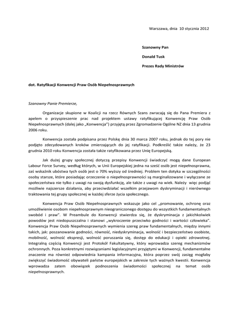 Warszawa, dnia 10 stycznia 2012 Szanowny Pan Donald Tusk Prezes Rady Ministrów dot. Ratyfikacji Konwencji Praw Osób Niepełnosprawnych Szanowny Panie Premierze, Organizacje skupione w Koalicji na rzecz Równych Szans zwracają się do Pana Premiera z apelem o przyspieszenie prac nad projektem ustawy ratyfikującej Konwencję Praw Osób Niepełnosprawnych (dalej jako „Konwencja”) przyjętą przez Zgromadzenie Ogólne NZ dnia 13 grudnia 2006 roku. Konwencja została podpisana przez Polskę dnia 30 marca 2007 roku, jednak do tej pory nie podjęto zdecydowanych kroków zmierzających do jej ratyfikacji. Podkreślid także należy, że 23 grudnia 2010 roku Konwencja została także ratyfikowana przez Unię Europejską. Jak dużej grupy społecznej dotyczą przepisy Konwencji świadczyd mogą dane European Labour Force Survey, według których, w Unii Europejskiej jedna na sześd osób jest niepełnosprawna, zaś wskaźnik ubóstwa tych osób jest o 70% wyższy od średniej. Problem ten dotyka w szczególności osoby starsze, które posiadając orzeczenie o niepełnosprawności są marginalizowane i wyłączane ze społeczeostwa nie tylko z uwagi na swoją dysfunkcję, ale także z uwagi na wiek. Należy więc podjąd możliwie najszersze działania, aby przeciwdziaład wszelkim przejawom dyskryminacji i nierównego traktowania tej grupy społecznej w każdej sferze życia społecznego. Konwencja Praw Osób Niepełnosprawnych wskazuje jako cel „promowanie, ochronę oraz umożliwienie osobom niepełnosprawnym nieograniczonego dostępu do wszystkich fundamentalnych swobód i praw”. W Preambule do Konwencji stwierdza się, że dyskryminacja z jakichkolwiek powodów jest niedopuszczalna i stanowi „wykroczenie przeciwko godności i wartości człowieka”. Konwencja Praw Osób Niepełnosprawnych wymienia szereg praw fundamentalnych, między innymi takich, jak: poszanowanie godności, równośd, niedyskryminacja, wolnośd i bezpieczeostwo osobiste, mobilnośd, wolnośd ekspresji, wolnośd poruszania się, dostęp do edukacji i opieki zdrowotnej. Integralną częścią Konwencji jest Protokół Fakultatywny, który wprowadza szereg mechanizmów ochronnych. Poza konkretnymi rozwiązaniami legislacyjnymi przyjętymi w Konwencji, fundamentalne znaczenie ma również odpowiednia kampania informacyjna, która poprzez swój zasięg mogłaby zwiększyd świadomośd obywateli paostw europejskich w zakresie tych ważnych kwestii. Konwencja wprowadza zatem obowiązek podnoszenia świadomości społecznej na temat osób niepełnosprawnych. W podobnym duchu sformułowano artykuły 25 i 26 Karty Praw Podstawowych UE. Sama Konwencja, jak również inne dokumenty międzynarodowe - m.in. Międzynarodowy Plan Madrycki w kwestii starzenia się społeczeostw z 2002 (rezolucja ONZ nr 57/167), wskazuje, że konieczna jest zmiana podejścia do niepełnosprawności, a przez to do zjawiska dyskryminacji. Strategia Unii Europejskiej w sprawie niepełnosprawności 2010-2020 „Odnowione zobowiązania do budowania Europy bez barier” (KOM(2010) nr 636) wskazuje na koniecznośd poprawy sytuacji ekonomicznej i społecznej osób niepełnosprawnych. Jako jeden z instrumentów w realizacji tego celu wymienia się Konwencję Praw Osób Niepełnosprawnych, która jest pierwszym dokumentem takiej rangi podpisanym i ratyfikowanym przez Unię Europejską. Strategia zakłada również, że wszystkie paostwa członkowskie ratyfikują Konwencję. Jednocześnie, zgodnie z założeniami Komisji Europejskiej, pełny udział osób niepełnosprawnych w życiu publicznym jest warunkiem sine qua non powodzenia tej strategii. Standardem przyjętym przez ONZ i Radę Europy jest stworzenie takich warunków, w których osoby niepełnosprawne mogłyby w pełni korzystad ze swoich praw i wolności. Podkreśla się również przeciwdziałanie wszelkim formom dyskryminacji, która w konsekwencji prowadzi do zjawiska wykluczenia społecznego. Podejmowanie działao promocyjnych i edukacyjnych ma na celu przeciwdziałanie temu zjawisku. Polska powinna stworzyd odpowiednie warunki, w których osoby niepełnosprawne mogłyby w pełni korzystad ze swoich praw i wolności, przeciwdziaład wszelkim formom dyskryminacji, która w konsekwencji prowadzi do marginalizacji społecznej oraz podejmowad na tym polu działania promocyjne i edukacyjne. Dlatego zwracamy się do Pana Premiera z apelem o jak najszybsze przedłożenie pod obrady Sejmu ustawy ratyfikującej Konwencję Praw Osób Niepełnosprawnych. Apelujemy również o dołożenie wszelkich starao ku temu, aby Konwencja została ratyfikowana bez zastrzeżeo wraz z Protokołem Fakultatywnym, gdyż bez tych mechanizmów pełna realizacja praw osób z niepełnosprawnościami nie będzie możliwa. Łączymy wyrazy szacunku Do wiadomości: - Władysław Kosiniak-Kamysz, Minister Pracy i Polityki Społecznej - Radosław Sikorski, Minister Spraw Zagranicznych - Ryszard Kalisz, Przewodniczący Sejmowej Komisji Sprawiedliwości i Praw Człowieka - Grzegorz Schetyna, Przewodniczący Sejmowej Komisji Spraw Zagranicznych - Sławomir Piechota, Przewodniczący Sejmowej Komisji Polityki Społecznej i Rodziny - Prof. Irena Lipowicz, Rzecznik Praw Obywatelskich - Agnieszka Kozłowska Rajewicz, Pełnomocniczka Rządu ds. Równego Traktowania - Jarosław Duda, Pełnomocnik Rządu ds. Osób Niepełnosprawnych - media