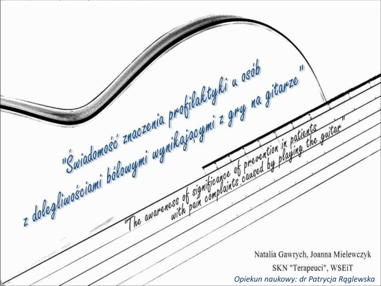 Opiekun naukowy: dr Patrycja Rąglewska Wprowadzenie background Wydawać by się mogło, że gitara należy do instrumentów, których metodyka grania jest jedną z prostszych. Niestety jak pokazuje rzeczywistość, już samo ustawienie tego instrumentu względem ciała grającego budzi wiele wątpliwości. Wątpliwości te wynikają z faktu, iż aby uzyskać odpowiednie brzmienie gitarowe nie jest ważne w jakiej pozycji trzyma się ową gitarę. Dodatkowe błędy wynikają z braku wiedzy dotyczącej prawidłowej wielkości gitary względem wieku grającego. Wszystkie te nieprawidłowości przyczyniają się często do występowania dolegliwości bólowych w okolicach kręgosłupa i kończyn górnych [1,2]. Cel pracy objective of the study Głównym celem przeprowadzonych badań było sprawdzenie świadomości znaczenia oraz zasad przestrzegania profilaktyki przeciwbólowej przez osoby podejmujące systematyczne lekcje gry na gitarze, jak również zaproponowanie działań z zakresu profilaktyki umożliwiających zminimalizowanie tych dolegliwości. The main objective of the study was to assess the awareness of the significance and principles of pain prevention in people taking regular guitar lessons, and to suggest certain preventative actions which would minimize these complaints. Materiał i metoda material and methods Badania przeprowadzono wśród 420 gitarzystów. Respondenci podzieleni zostali pod względem płci, wieku, stażu gry, stopnia zaawansowania muzycznego oraz sposobu nauki gry na gitarze. Metodę badawczą stanowił sondaż diagnostyczny technika – ankieta, składający się z 16 pytań i metryczki. The study included a total of 420 guitar players. The participants were divided by sex, age, playing experience, music advancement and the way of playing the guitar. The study method was a diagnostic survey, using a questionnaire technique. The questionnaire included 16 questions and respondents’ personal data. Wyniki results Z przeprowadzonego badania wynika, że aż 76% ankietowanych nie zwraca uwagi na dobór wielkości gitary do swojego wieku i wzrostu. Biorąc pod uwagę przyjmowanie prawidłowej pozycji ciała w trakcie gry można by stwierdzić, iż świadomość gitarzystów pod tym kątem jest znacznie większa, gdyż aż 54% respondentów takową informację posiada. Niestety informacje te nie są ukierunkowane na układ ruchowy ale na tempo nauki, komfort gry czy też jakość gry. Zaledwie 13% badanych zdawało sobie sprawę, iż nieprawidłowa sylwetka towarzysząca grze na gitarze może mieć negatywne skutki dla aparatu kostno – mięśniowego. Niewiedza związana z doborem wielkości instrumentu, sposobu jego trzymania czy też prawidłowej na nim gry dotyczy zarówno osób podejmujących naukę w sposób profesjonalny jak i amatorski. Warty podkreślenia jest fakt, że aż 65% ankietowanych uskarżało się na dolegliwości bólowe w różnych częściach ciała. Dyskomfort towarzyszy gitarzystom zarówno w trakcie gry (59% ankietowanych) jak i po jej zakończeniu (41%). Z powyższego diagramu wynika, że ponad połowa ankietowanych uskarża się na dolegliwości bólowe w okolicach kończyny górnej oraz w kręgosłupie. Na uwagę fizjoterapeutów szczególnie zasługują stawy nadgarstkowe oraz międzypaliczkowe, które w opinii respondentów są najbardziej narażone na ból. Okolice te są o tyle ważne, gdyż to ich ruch skutkuje wydobywaniem dźwięków ze strun i pudła rezonansowego. Więc im bardziej dynamiczny czy skomplikowany utwór jest grany, tym większe ryzyko przeciążeń i powstawania mikrourazów tych obszarów ciała. W kwestii profilaktyki dolegliwości bólowych, aż 53% badanych nie wie w jaki sposób może sobie z nimi radzić. Pozostałe 47% posiadało takie informacje. Niestety dotyczyły one przede wszystkim zażywania leków przeciwbólowych, zaprzestania gry w momencie pojawienia się bólu czy też stosowania zimnych okładów na bolące stawy międzypaliczkowe i nadgarstkowe. Wnioski Conclusions 1. Literatura dotycząca tematyki gry na gitarze nie zawiera rozdziałów dotyczących zasad profilaktyki zaburzeń czynności narządu ruchu u gitarzystów, dzięki którym osoby rozpoczynające grę oraz uczące gry na gitarze minimalizowałyby lub przeciwdziałały występowaniu potwierdzonym w badaniu dolegliwościom bólowym. The literature about playing guitar doesn’t contain chapters on the principles of prevention of locomotor system dysfunction of guitarists through which people starting a game and learning to play the guitar would minimize or counteract the occurrence of confirmed in the study for pain. 2. W ramach zapobiegania dolegliwościom towarzyszącym osobom grającym na gitarze konieczne jest wykonywanie ćwiczeń rozciągających okolic napiętych jak również wzmacnianie mięśni osłabionych. To help prevent disorders accompanying persons playing the guitar, it is necessary to perform stretching exercises tight muscles and strengthening weak muscles. 3. Kluczową rolę w czasie gry na gitarze odgrywają mięśnie należące do grupy zginaczy i prostowników nadgarstka, rotatory zewnętrzne i wewnętrzne stawu ramiennego, mięsień czworoboczny czy też równoległoboczny [4]. The main role in playing guitar have: flexors and extensors of the wrist, internal and external rotators of the shoulder, trapezius and rhomboid muscles. 4. Bardzo istotnym aspektem w kwestii zapobiegania dyskopatiom jest unikanie nadmiernych rotacji kręgosłupa oraz wzmacnianie mięśni szyi i brzucha [3]. A very important aspect of prevention degenerative disc disease is to avoid excessive rotation of the spine and strengthening the muscles of the neck and abdomen. 5. Nie należy zapominać również o stosowaniu systematycznych przerw między seriami, w czasie których istotne jest wykonywanie ćwiczeń rozciągających . Do not forget also about using systematic breaks between sets, during which it is important to do stretching e