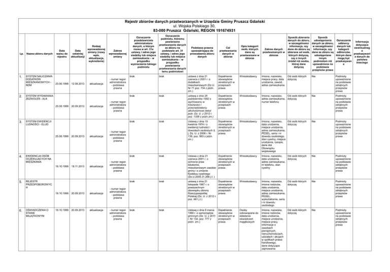 Rejestr zbiorów danych przetwarzanych w Urzędzie Gminy Pruszcz Gdański ul. Wojska Polskiego 30, 83-000 Pruszcz Gdański, REGON 191674931 Lp. Nazwa zbioru danych 1. SYSTEM NALICZANIA DODATKÓW MIESZKANIOWYCH NDM 2. Data wpisu do rejestru 23.06.1999 6. 20.09.2013 aktualizacja 20.09.2013 aktualizacja EWIDENCJA OSÓB OCZEKUJĄCYCH NA MIESZKANIA 18.10.1999 5. aktualizacja - numer regon administratora - podstawa prawna 18.11.2013 aktualizacja REJESTR PRZEDPOBOROWYC H OŚWIADCZENIA O STANIE MAJĄTKOWYM 18.10.1999 20.09.2013 aktualizacja 18.10.1999 20.09.2013 aktualizacja Oznaczenie podmiotu, któremu powierzono przetwarzanie danych ze zbioru na podstawie art. 31 ustawy, i adres jego siedziby lub miejsca zamieszkania – w przypadku powierzenia przetwarzania danych temu podmiotowi Cel przetwarzania danych w zbiorze Opis kategorii osób, których dane są przetwarzane w zbiorze Zakres danych przetwarzanych w zbiorze brak ustawa z dnia 21 czerwca z 2001 r. o dodatkach mieszkaniowych (Dz.U. Nr 71 poz. 734 z późn. zm.) Dopełnienie obowiązków określonych w przepisach prawa. Wnioskodawcy Imiona, nazwisko, miejsce pracy, data urodzenia, zawód, adres zamieszkania Od osób których dotyczą Nie Podmioty upoważnione na podstawie odrębnych przepisów prawa brak brak ustawą z dnia 26 października 1982 o wychowaniu w trzeźwości i przeciwdziałaniu alkoholizmowi (tekst jedn. Dz. U. z 2012 r. poz. 1356 z późn.zm.) Dopełnienie obowiązków określonych w przepisach prawa. Wnioskodawcy Imiona, nazwisko, Od osób których adres zamieszkania, dotyczą numer telefonu Nie Podmioty upoważnione na podstawie odrębnych przepisów prawa brak brak Ustawą z dnia 10 kwietnia 1974 r o ewidencji ludności i dowodach osobistych (t. j. Dz. U. z 2006 r. Nr 139, poz. 993 z późn. zm.) Dopełnienie obowiązków określonych w przepisach prawa. Wnioskodawcy Imiona, nazwisko, Od osób których data urodzenia, dotyczą miejsce urodzenia, adres zamieszkania, PESEL, seria i nr dowodu osobistego, stan cywilny, miejsce urodzenia, rysopis, dane dot. Obowiązku wojskowego Nie Podmioty upoważnione na podstawie odrębnych przepisów prawa brak brak Ustawa z dnia 21 czerwca 2001 r. o ochronie praw lokatorów, mieszkaniowym zasobie gminy i o zmianie Kodeksu cywilnego (Dz.U.2005.31.266 j.t. ) Dopełnienie obowiązków określonych w przepisach prawa. Wnioskodawcy Imiona, nazwisko, Od osób których data urodzenia, dotyczą adres zamieszkania, nr telefonu, stan cywilny Nie Podmioty upoważnione na podstawie odrębnych przepisów prawa brak brak ustawą z dnia 21 listopada 1967 r. o powszechnym obowiązku obrony Rzeczypospolitej Polskiej (Dz. U. z 2012 r. poz. 461 j.t.) Dopełnienie obowiązków określonych w przepisach prawa. Wnioskodawcy Imiona, nazwiska, Od osób których imiona rodziców, dotyczą data urodzenia, miejsce urodzenia, adres zamieszkania, PESEL, wykształcenie, seria i nr dowodu osobistego Nie Podmioty upoważnione na podstawie odrębnych przepisów prawa brak brak Ustawą z dnia 8 marca 1990 r. o samorządzie gminnym (Dz. U. z 2011 r. Nr 134, poz. 777 z późn. zm.) Dopełnienie obowiązków określonych w przepisach prawa. Osoby zobowiązane do składania oświadczeń majątkowych Imiona, nazwiska, imiona rodziców, data urodzenia, miejsce urodzenia, miejsce pracy, informacje o zasobach pieniężnych, nieruchomościach, udziałach i akcjach w spółkach prawa handlowego, dane dotyczące zajmowania Nie Podmioty upoważnione na podstawie odrębnych przepisów prawa - numer regon administratora - podstawa prawna - numer regon administratora - podstawa prawna - numer regon administratora - podstawa prawna - numer regon administratora - podstawa prawna Podstawa prawna upoważniająca do prowadzenia zbioru danych Sposób zbierania Sposób danych do zbioru, udostępniania Oznaczenie Informacja w szczególności danych ze zbioru, odbiorcy dotycząca informacja, czy w szczególności danych lub ewentualneg dane do zbioru są informacja, czy kategorii o zbierane od osób, dane ze zbioru są odbiorców, przekazywani których dotyczą, udostępniane którym dane a danych do czy z innych innym mogą być państwa źródeł niż osoba, podmiotom niż przekazywan trzeciego której dane upoważnione na e dotyczą podstawie przepisów prawa brak - numer regon administratora - podstawa prawna SYSTEM EWIDENCJI LUDNOŚCI - ELUD 25.08.1999 4. 12.08.2013 Zakres wprowadzonej zmiany SYSTEM WYDAWANIA ZEZWOLEŃ - ALK 25.08.1999 3. Data ostatniej aktualizacji Rodzaj wprowadzonej zmiany (nowy wpis, aktualizacja, wykreślenie) Oznaczenie przedstawiciela administratora danych, o którym mowa w art. 31a ustawy, i adres jego siedziby lub miejsca zamieszkania – w przypadku wyznaczenia takiego podmiotu Od osób których dotyczą stanowiska w spółkach prawa handlowego, informacje dotyczące majątku objętego wspólnością majątkową małżeńską 7. 8. SYSTEM EWIDENCJI BUDYNKÓW I NALICZANIA CZYNSZÓW - EBUD 18.10.1999 10. SYSTEM NALICZANIA PODATKÓW OD GRUNTÓW I NIERUCHOMOŚCI POGRUN 18.10.1999 13. 14. 18.11.2013 aktualizacja - numer regon administratora - podstawa prawna aktualizacja - numer regon administratora - podstawa prawna 2.06.2016 aktualizacja - nazwa zbioru - zakres przetwarzanych danych aktualizacja - numer regon administratora - podstawa prawna Aktualizacja - zakres przetwarzanych w zbiorze danych SYSTEM INFORMACJI OŚWIATOWEJ - SIO 10.01.2006 12. 20.09.2013 System Gospodarowania Odpadami Komunalnymi - GOK 22.08.2013 30.01.2014 13.04.2014 KORESPONDENCJA Ewidencja wniosków CEIDG-1 brak Ustawa dnia 21 czerwca 2001 r. o ochronie praw lokatorów, mieszkaniowym zasobie gminy i o zmianie Kodeksu cywilnego (Dz.U.2005.31.266 j.t.) Dopełnienie obowiązków określonych w przepisach prawa. wnioskodawcy Imiona, nazwiska, Od osób których data urodzenie, dotyczą adres zamieszkania, PESEL, nr telefonu Nie Podmioty upoważnione na podstawie odrębnych przepisów prawa brak brak ustawą z dnia 29 sierpnia 1997 r. Ordynacja pod