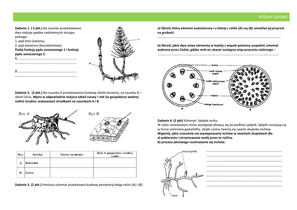 ROŚLINY LĄDOWE Zadanie 1. ( 2 pkt.) Na rysunku przedstawiono dwa rodzaje pędów nadziemnych skrzypu polnego: 1. pęd letni (zielony), 2. pęd wiosenny (bezzieleniowy). Podaj funkcję pędu oznaczonego 1 i funkcję pędu oznaczonego 2. 1. ................................................................. …………………………………………………………………. a) Określ, który element anatomiczny i u której z roślin (A) czy (B) umożliwi jej przyrost na grubość: …………………………………………………………………………………………………………………………………….. b) Określ, jakie dwa nowe elementy w każdej z wiązek powinny uzupełnić schemat wybrany przez Ciebie, gdyby miał on ukazać następny etap przyrostu wtórnego : ........................................................................................................................................ 2. ................................................................. …………………………………………………………………. Zadanie 2. (2 pkt.) Na rysunku A przedstawiono budowę skórki korzenia, na rysunku B – skórki liścia. Wpisz w odpowiednie miejsca tabeli nazwy i role (w gospodarce wodnej roślin) struktur wskazanych strzałkami na rysunkach A i B. Zadanie 4. (2 pkt) Schemat: Splątek mchu. W cyklu rozwojowym mchu występuje płożący się po podłożu splątek. Splątki rozwijają się w liczne ulistnione gametofity, dzięki czemu tworzą się zwarte skupiska mchów. Wyjaśnij, jakie znaczenie ma występowanie mchów w zwartych skupiskach dla a) pobierania i utrzymywania wody przez te rośliny. b) procesu płciowego rozmnażania się mchów. Zadanie 3. (2 pkt.) Poniższy schemat przedstawia budowę pierwotną łodyg roślin (A) i (B). ………………………………………………………………………………… ………………………………………………………………………………… ………………………………………………………………………………… ………………………………………………………………………………... ………………………………………………………………………………… ………………………………………………………………………………… ………………………………………………………………………………... ………………………………………………………………………………… ROŚLINY LĄDOWE ………………………………………………………………………………… ………………………………………………………………………………... ………………………………………………………………………………… ……………………………………………………………………………………………………………………………………….. Zadanie 5. (2 pkt.) Na rysunkach przedstawiono zmodyfikowane organy podziemne ziemniaka i kosaćca. Podaj, które organy tych roślin uległy modyfikacji oraz wyjaśnij, jakie ma ona dla nich znaczenie. ................................................................................................................................................. ................................................................................................................................................. ................................................................................................................................................. Zadanie 6. (2 pkt.) Jemioła, rosnąca na gałęziach wielu drzew, jest półpasożytniczym krzewem. Wskaż dwie, charakterystyczne cechy budowy, będące przystosowaniem do występującego u niej rodzaju odżywiania. () …………………………………………………………......... …………………………………………………………………. …………………………………………………………………. ………………………………………………………………….. …………………………………………………………………. ……………………………………………………………….... ………………………………………………………………………………………………………………………………………….. Zadanie 7. (2 pkt.) Liście roślin nasiennych wykazują duże zróżnicowanie zarówno w budowie zewnętrznej, jak i wewnętrznej. Poniżej przedstawiono schematy przekrojów poprzecznych dwóch rodzajów liści. Napisz, który z nich (A czy B) przedstawia liść sosny. Swój wybór uzasadnij za pomocą dwóch argumentów. a. b. ................................................................................................................................................. ................................................................................................................................................. ................................................................................................................................................. ................................................................................................................................................. ................................................................................................................................................. Zadanie 8. (3 pkt.) Wskaż każdy z tych błędów (otaczając go kółkiem na schemacie). W obu przypadkach swój wybór uzasadnij jednym argumentem. ................................................................................................................................................. ........................................................................................................................