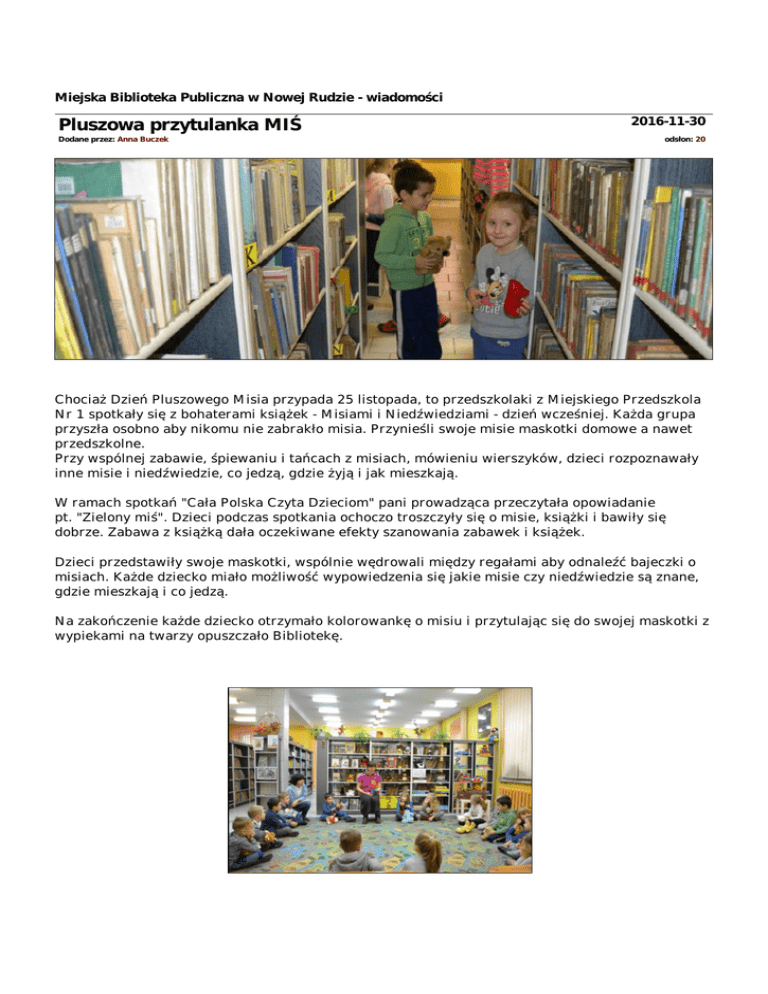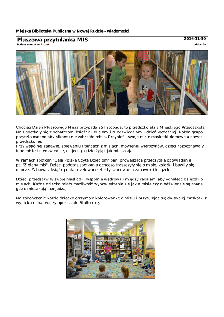 Miejska Biblioteka Publiczna w Nowej Rudzie - wiadomości Pluszowa przytulanka MIŚ Dodane przez: Anna Buczek 2016-11-30 odsłon: 20 Chociaż Dzień Pluszowego Misia przypada 25 listopada, to przedszkolaki z Miejskiego Przedszkola Nr 1 spotkały się z bohaterami książek - Misiami i Niedźwiedziami - dzień wcześniej. Każda grupa przyszła osobno aby nikomu nie zabrakło misia. Przynieśli swoje misie maskotki domowe a nawet przedszkolne. Przy wspólnej zabawie, śpiewaniu i tańcach z misiach, mówieniu wierszyków, dzieci rozpoznawały inne misie i niedźwiedzie, co jedzą, gdzie żyją i jak mieszkają. W ramach spotkań "Cała Polska Czyta Dzieciom" pani prowadząca przeczytała opowiadanie pt. "Zielony miś". Dzieci podczas spotkania ochoczo troszczyły się o misie, książki i bawiły się dobrze. Zabawa z książką dała oczekiwane efekty szanowania zabawek i książek. Dzieci przedstawiły swoje maskotki, wspólnie wędrowali między regałami aby odnaleźć bajeczki o misiach. Każde dziecko miało możliwość wypowiedzenia się jakie misie czy niedźwiedzie są znane, gdzie mieszkają i co jedzą. Na zakończenie każde dziecko otrzymało kolorowankę o misiu i przytulając się do swojej maskotki z wypiekami na twarzy opuszczało Bibliotekę. Powered by TCPDF (www.tcpdf.org)