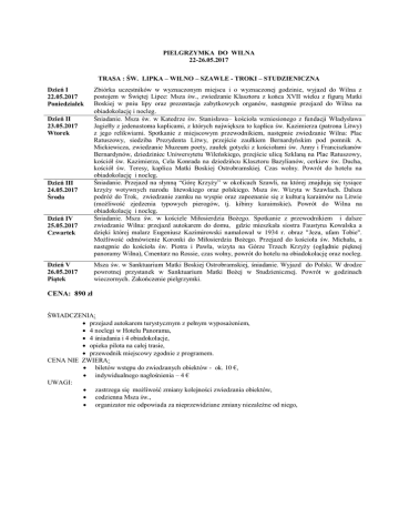 PIELGRZYMKA DO WILNA 22-26.05.2017 TRASA : ŚW. LIPKA – WILNO – SZAWLE - TROKI – STUDZIENICZNA Dzień I 22.05.2017 Poniedziałek Dzień II 23.05.2017 Wtorek Dzień III 24.05.2017 Środa Dzień IV 25.05.2017 Czwartek Dzień V 26.05.2017 Piątek Zbiórka uczestników w wyznaczonym miejscu i o wyznaczonej godzinie, wyjazd do Wilna z postojem w Świętej Lipce: Msza św., zwiedzanie Klasztoru z końca XVII wieku z figurą Matki Boskiej w pniu lipy oraz prezentacja zabytkowych organów, następnie przejazd do Wilna na obiadokolację i nocleg. Śniadanie. Msza św. w Katedrze św. Stanisława– kościoła wzniesionego z fundacji Władysława Jagiełły z jedenastoma kaplicami, z których największa to kaplica św. Kazimierza (patrona Litwy) z jego relikwiami. Spotkanie z miejscowym przewodnikiem, następnie zwiedzanie Wilna: Plac Ratuszowy, siedziba Prezydenta Litwy, przejście zaułkiem Bernardyńskim pod pomnik A. Mickiewicza, zwiedzanie Muzeum poety, zaułek gotycki z kościołami św. Anny i Franciszkanów Bernardynów, dziedziniec Uniwersytetu Wileńskiego, przejście ulicą Szklaną na Plac Ratuszowy, kościół św. Kazimierza, Cela Konrada na dziedzińcu Klasztoru Bazylianów, cerkiew św. Ducha, kościół św. Teresy, kaplica Matki Boskiej Ostrobramskiej. Czas wolny. Powrót do hotelu na obiadokolację i nocleg. Śniadanie. Przejazd na słynną “Górę Krzyży” w okolicach Szawli, na której znajdują się tysiące krzyży wotywnych narodu litewskiego oraz polskiego. Msza św. Wizyta w Szawlach. Dalsza podróż do Trok, zwiedzanie zamku na wyspie oraz zapoznanie się z kulturą karaimów na Litwie (możliwość zjedzenia typowych pierogów, tj. kibiny karaimskie). Powrót do Wilna na obiadokolację i nocleg. Śniadanie. Msza św. w kościele Miłosierdzia Bożego. Spotkanie z przewodnikiem i dalsze zwiedzanie Wilna: przejazd autokarem do domu, gdzie mieszkała siostra Faustyna Kowalska a dzięki której malarz Eugeniusz Kazimirowski namalował w 1934 r. obraz "Jezu, ufam Tobie". Możliwość odmówienie Koronki do Miłosierdzia Bożego. Przejazd do kościoła św. Michała, a następnie do kościoła św. Piotra i Pawła, wizyta na Górze Trzech Krzyży (oglądnie pięknej panoramy Wilna), Cmentarz na Rossie, czas wolny, powrót do hotelu na obiadokolację oraz nocleg. Msza św. w Sanktuarium Matki Boskiej Ostrobramskiej, śniadanie. Wyjazd do Polski. W drodze powrotnej przystanek w Sanktuarium Matki Bożej w Studzienicznej. Powrót w godzinach wieczornych. Zakończenie pielgrzymki. CENA: 890 zł ŚWIADCZENIA: przejazd autokarem turystycznym z pełnym wyposażeniem, 4 noclegi w Hotelu Panorama, 4 śniadania i 4 obiadokolacje, opieka pilota na całej trasie, przewodnik miejscowy zgodnie z programem. CENA NIE ZWIERA: biletów wstępu do zwiedzanych obiektów - ok. 10 €, indywidualnego nagłośnienia – 4 € UWAGI: zastrzega się możliwość zmiany kolejności zwiedzania obiektów, codzienna Msza św., organizator nie odpowiada za nieprzewidziane zmiany niezależne od niego,