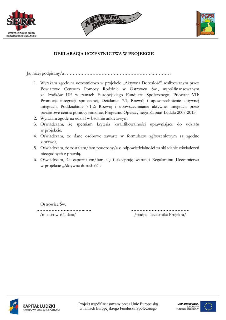 DEKLARACJA UCZESTNICTWA W PROJEKCIE Ja, niżej podpisany/a ………………………………………………….………… 1. Wyrażam zgodę na uczestnictwo w projekcie „Aktywna Dorosłość” realizowanym przez Powiatowe Centrum Pomocy Rodzinie w Ostrowcu Św., współfinansowanym ze środków UE w ramach Europejskiego Funduszu Społecznego, Priorytet VII: Promocja integracji społecznej, Działanie: 7.1, Rozwój i upowszechnienie aktywnej integracji, Poddziałanie 7.1.2: Rozwój i upowszechnianie aktywnej integracji przez powiatowe centra pomocy rodzinie, Programu Operacyjnego Kapitał Ludzki 2007-2013. 2. Wyrażam zgodę na udział w badaniu ankietowym. 3. Oświadczam, że spełniam kryteria kwalifikowalności uprawniające do udziału w projekcie. 4. Oświadczam, że dane osobowe zawarte w formularzu zgłoszeniowym są zgodne z prawdą. 5. Oświadczam, że zostałem/łam pouczony/a o odpowiedzialności za składanie oświadczeń niezgodnych z prawdą. 6. Oświadczam, że zapoznałem/łam się i akceptuję warunki Regulaminu Uczestnictwa w projekcie „Aktywna dorosłość”. Ostrowiec Św. ………………….………..…. /miejscowość, data/ ………………………………… /podpis uczestnika Projektu/ ANKIETA REKRUTACYJNA Uczestnictwa w projekcie systemowym pt. „Aktywna Dorosłość” realizowanym przez Powiatowe Centrum Pomocy Rodzinie w Ostrowcu Świętokrzyskim, ul. Świętokrzyska 22 w ramach Programu Operacyjnego Kapitał Ludzki, Priorytet VII. Promocja integracji społecznej, Działanie 7.1. Rozwój i upowszechnienie aktywnej integracji, Poddziałanie 7.1.2 Rozwój i upowszechnianie aktywnej integracji przez powiatowe centra pomocy rodzinie. Imię i nazwisko Dane osobowe Adres zamieszkania Dane dodatkowe 2. Data urodzenia 3. PESEL 4. Ulica 5. Nr domu 6. Nr mieszkania 7. Kod pocztowy 8. Miejscowość 9. Telefon kontaktowy 10. Adres e-mail: 11. Wykształcenie: brak, podstawowe, gimnazjalne, ponadgimnazjalne, pomaturalne, wyższe 12. Zatrudnienie TAK □ NIE □ 13. Posiadam status osoby niepełnosprawnej TAK □ 14. Stopień niepełnosprawności/ grupa Dobra 15. NIE □ Średnia Słaba Zdolność komunikowania się □ □ 16. Posiadam własne dochody TAK □ NIE □ 17. Jestem osobą w wieku aktywności zawodowej tj. kobiety 15 – 60 lat, mężczyźni 15 – 65 lat TAK □ NIE □ □ 18. Chcę podnieść swoje umiejętności społeczno-zawodowe TAK □ NIE □ 19. Jestem objęty wsparciem w ramach innych projektów systemowych TAK □ NIE □ 20. Jest w stanie samodzielnie dotrzeć na warsztaty TAK □ NIE □ - warsztaty doradztwa zawodowego TAK □ NIE □ - warsztaty psychologiczne TAK □ NIE □ - terapii zdrowego żywienia TAK □ NIE □ - tanie gotowanie - dania dla diabetyków TAK □ NIE □ - warsztaty komputerowe TAK □ NIE □ - warsztaty z zakresu dekoracji okiennych TAK □ NIE □ - wikliniarstwo TAK □ NIE □ - warsztaty z zakresu garncarstwa TAK □ NIE □ - ikebana – sztuka tworzenia kompozycji TAK □ NIE □ - warsztaty z zakresu rękodzieła TAK □ NIE □ - 7- dniowy wyjazd rehabilitacyjny połączony z warsztatami pn. dźwięk leczy TAK □ NIE □ - 7- dniowy wyjazd rehabilitacyjny połączony z warsztatami zdrowego żywienia TAK □ NIE □ - turnus rehabilitacyjny połączony z warsztatami udzielania pierwszej pomocy TAK □ NIE □ - udział w wycieczkach TAK □ NIE □ 21. Chcę skorzystać z następującego wsparcia w ramach projektu: - udział w spotkaniach integracyjnych TAK □ NIE □ Uwagi:…………..……………………………………………………………………………… …………………………………..……………………………………………………………… Ostrowiec Św. ……….…………….… /miejscowość, data / ………………………………… /podpis/ OŚWIADCZENIE UCZESTNIKA PROJEKTU O WYRAŻENIU ZGODY NA PRZETWARZANIE DANYCH OSOBOWYCH W związku z przystąpieniem do projektu „Aktywna Dorosłość” realizowanego w ramach Programu Operacyjnego Kapitał Ludzki wyrażam zgodę na przetwarzanie moich danych osobowych. Oświadczam, że przyjmuję do wiadomości: 1) administratorem tak zebranych danych osobowych jest Ministerstwo Rozwoju Regionalnego pełniące funkcję Instytucji Zarządzającej dla Programu Operacyjnego Kapitał Ludzki ul. Wspólna 2/4, 00-926 Warszawa, 2) moje dane osobowe będą przetwarzane wyłącznie do celów udzielania wsparcia, realizacji projektu „Aktywna Dorosłość”, ewaluacji, monitoringu, kontroli i sprawozdawczości w ramach Programu Operacyjnego Kapitał Ludzki, 3) moje dane osobowe mogą zostać udostępniane innym podmiotom w celu udzielania wsparcia, realizacji projektu „Aktywna Dorosłość”, ewaluacji, monitoringu, kontroli i sprawozdawczości w ramach Programu Operacyjnego Kapitał Ludzki, 4) podanie danych jest dobrowolne, aczkolwiek odmowa ich podania jest równoznaczna z brakiem możliwości udzielenia wsparcia w ramach Projektu, 5) mam prawo dostępu do treści swoich danych i ich poprawiania. Ostrowiec Św. ……………………………… /miejscowość i data/ …………….………………… /podpis uczestnika Projektu/