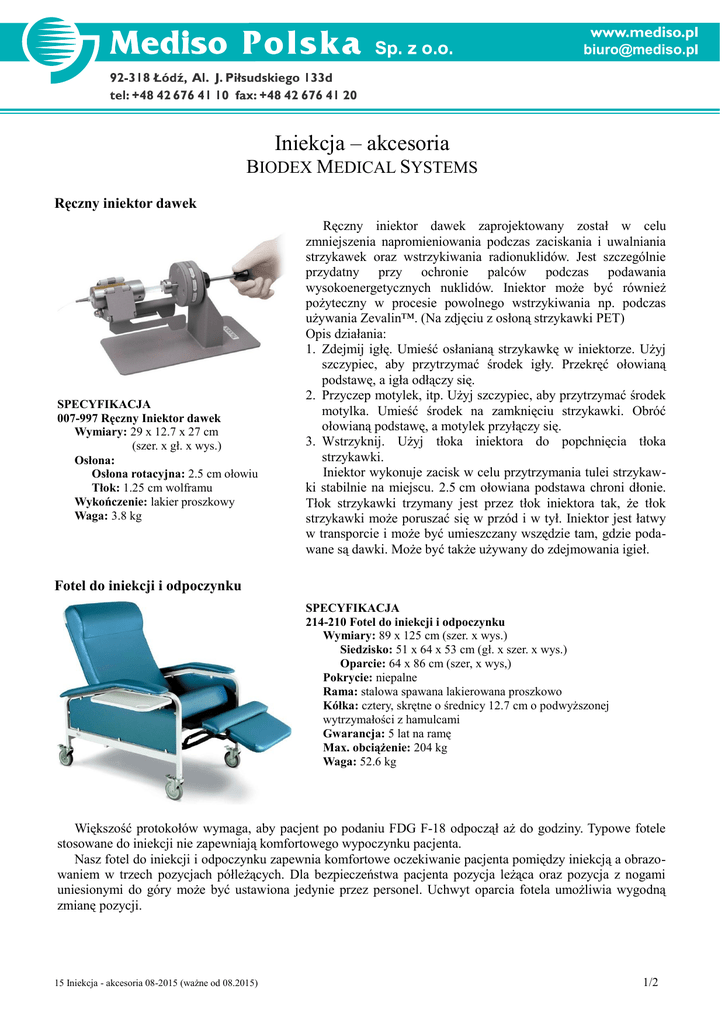 Iniekcja – akcesoria BIODEX MEDICAL SYSTEMS Ręczny iniektor dawek SPECYFIKACJA 007-997 Ręczny Iniektor dawek Wymiary: 29 x 12.7 x 27 cm (szer. x gł. x wys.) Osłona: Osłona rotacyjna: 2.5 cm ołowiu Tłok: 1.25 cm wolframu Wykończenie: lakier proszkowy Waga: 3.8 kg Ręczny iniektor dawek zaprojektowany został w celu zmniejszenia napromieniowania podczas zaciskania i uwalniania strzykawek oraz wstrzykiwania radionuklidów. Jest szczególnie przydatny przy ochronie palców podczas podawania wysokoenergetycznych nuklidów. Iniektor może być również pożyteczny w procesie powolnego wstrzykiwania np. podczas używania Zevalin™. (Na zdjęciu z osłoną strzykawki PET) Opis działania: 1. Zdejmij igłę. Umieść osłanianą strzykawkę w iniektorze. Użyj szczypiec, aby przytrzymać środek igły. Przekręć ołowianą podstawę, a igła odłączy się. 2. Przyczep motylek, itp. Użyj szczypiec, aby przytrzymać środek motylka. Umieść środek na zamknięciu strzykawki. Obróć ołowianą podstawę, a motylek przyłączy się. 3. Wstrzyknij. Użyj tłoka iniektora do popchnięcia tłoka strzykawki. Iniektor wykonuje zacisk w celu przytrzymania tulei strzykawki stabilnie na miejscu. 2.5 cm ołowiana podstawa chroni dłonie. Tłok strzykawki trzymany jest przez tłok iniektora tak, że tłok strzykawki może poruszać się w przód i w tył. Iniektor jest łatwy w transporcie i może być umieszczany wszędzie tam, gdzie podawane są dawki. Może być także używany do zdejmowania igieł. Fotel do iniekcji i odpoczynku SPECYFIKACJA 214-210 Fotel do iniekcji i odpoczynku Wymiary: 89 x 125 cm (szer. x wys.) Siedzisko: 51 x 64 x 53 cm (gł. x szer. x wys.) Oparcie: 64 x 86 cm (szer, x wys,) Pokrycie: niepalne Rama: stalowa spawana lakierowana proszkowo Kółka: cztery, skrętne o średnicy 12.7 cm o podwyższonej wytrzymałości z hamulcami Gwarancja: 5 lat na ramę Max. obciążenie: 204 kg Waga: 52.6 kg Większość protokołów wymaga, aby pacjent po podaniu FDG F-18 odpoczął aż do godziny. Typowe fotele stosowane do iniekcji nie zapewniają komfortowego wypoczynku pacjenta. Nasz fotel do iniekcji i odpoczynku zapewnia komfortowe oczekiwanie pacjenta pomiędzy iniekcją a obrazowaniem w trzech pozycjach półleżących. Dla bezpieczeństwa pacjenta pozycja leżąca oraz pozycja z nogami uniesionymi do góry może być ustawiona jedynie przez personel. Uchwyt oparcia fotela umożliwia wygodną zmianę pozycji. 15 Iniekcja - akcesoria 08-2015 (ważne od 08.2015) 1/2 Statyw do iniekcji Statyw do iniekcji umożliwia szybkie i wygodne ustawienie pozycji ramienia pacjenta do iniekcji radionuklidów. Plastikowy podramiennik obraca się o 180°, ułatwiając wygodne ustawianie ramienia pod kątem, podczas gdy kołyskowa kuweta utrzymuje ramię pacjenta w miejscu. Taca jest umiejscowiona naprzeciwko podramiennika. Zawiera osłonięty uchwyt na strzykawki, mogący pomieścić do czterech strzykawek. Statyw ma regulowaną wysokość, aby zapewnić komfort pacjentowi. Nóżki umożliwiają łatwe przesuwanie stojaka. Stojak został zaprojektowany tak, aby zapobiegać przechyleniu. SPECYFIKACJA 135-022 Statyw do iniekcji Regulowana wysokość: 74 do 112 cm Podstawa: 44.5 x 44.5 cm Konstrukcja: stabilna, chromowana stal cylindryczna Waga transportu: 10 kg Krzesło do iniekcji Zaprojektowane specjalnie do iniekcji i pobierania krwi krzesło jest wygodnym rozwiązaniem dla pacjentów siedzących. Płaska powierzchnia podłokietnika zapobiega przesuwaniu się łokcia i w dalszej konsekwencji niedrożności żyły. Wysokość podłokietnika jest regulowana tak, aby dostosować go dla pacjentów o różnym wzroście. Zmiany dokonuje się za pomocą pokrętła regulującego obrót dwuskrzydłowego ramienia. Siedzenie fotela wykonane jest z jednego plastikowego elementu, co ułatwia jego czyszczenie. Usztywnione oparcie ogranicza możliwość jego odchylenia się i zapewnia stabilne siedzenie. Plastikowa szuflada przeznaczona na akcesoria medyczne jest łatwa w czyszczeniu. SPECYFIKACJA 214-220 Krzesło do iniekcji Wymiary: 58.5 x 109 cm Wymiary siedziska: 40.6 x 43 x 51 cm Regulowana wysokość podłokietnika: 69 do 84 cm Szerokość: 51 cm Podstawa: 44.5 x 44.5 cm Konstrukcja: stabilna, chromowana stal o przekroju kwadratu (3 cm) Waga: 15.9 kg Nośność: 113.4 kg 15 Iniekcja - akcesoria 08-2015 (ważne od 08.2015) 2/2