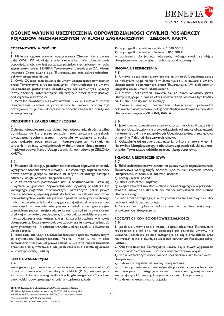OGÓLNE WARUNKI UBEZPIECZENIA ODPOWIEDZIALNOŚCI CYWILNEJ POSIADACZY POJAZDÓW MECHANICZNYCH W RUCHU ZAGRANICZNYM – ZIELONA KARTA Postanowienia ogólne § 1. 1. Niniejsze ogólne warunki ubezpieczenia Zielonej Karty zwane dalej OWU ZK określają zasady zawierania umów ubezpieczania odpowiedzialności cywilnej posiadaczy pojazdów mechanicznych w ruchu zagranicznym przez BENEFIA Towarzystwo Ubezpieczeń S.A. Vienna Insurance Group zwane dalej Towarzystwem oraz zakres udzielanej ochrony ubezpieczeniowej. 2. OWU ZK mają zastosowanie do umów ubezpieczenia zawieranych przez Towarzystwo z Ubezpieczającymi. Wprowadzenie do umowy ubezpieczenia postanowień dodatkowych lub odmiennych wymaga formy pisemnej, potwierdzającej ich przyjęcie przez strony umowy, pod rygorem nieważności. 3. Wszelkie zawiadomienia i oświadczenia, jakie w związku z umową ubezpieczenia składane są przez strony tej umowy, powinny być dokonywane na piśmie i doręczane za pokwitowaniem lub przesyłane listem poleconym. 1) w przypadku szkód na osobie – 5 000 000 €; 2) w przypadku szkód w mieniu – 1 000 000 €. w odniesieniu do jednego zdarzenia, którego skutki są objęte ubezpieczeniem, bez względu na liczbą poszkodowanych. Przedmiot i zakres ubezpieczenia § 2. Ochroną ubezpieczeniową objęta jest odpowiedzialność cywilna posiadacza lub kierującego pojazdem mechanicznym za szkody wyrządzone osobom trzecim, powstałe w związku z ruchem tego pojazdu poza granicami Rzeczypospolitej Polskiej, na terytorium państw wymienionych w dokumencie ubezpieczenia – Międzynarodowej Karcie Ubezpieczenia Samochodowego ZIELONA KARTA. § 6. 1. Jeżeli umowa ubezpieczenia zawarta została na okres dłuższy niż 6 miesięcy, Ubezpieczający ma prawo odstąpienia od umowy ubezpieczenia – w terminie 30 dni, a w przypadku gdy Ubezpieczający jest przedsiębiorcą w terminie 7 dni, od dnia zawarcia umowy. 2. Odstąpienie od umowy ubezpieczenia, o którym mowa w ust. 1, nie zwalnia Ubezpieczającego z obowiązku zapłacenia składki za okres, w jakim Towarzystwo udzieliło ochrony ubezpieczeniowej. Umowa ubezpieczenia § 5. 1. Umowę ubezpieczenia zawiera się na wniosek Ubezpieczającego po należytym wypełnieniu formularza wniosku o zawarcie umowy ubezpieczenia dostarczonego przez Towarzystwo. Wniosek stanowi integralną część umowy ubezpieczenia. 2. Umowę ubezpieczenia zawiera się na okres wskazany przez Ubezpieczającego, z tym że okres ubezpieczenia nie może być krótszy niż 15 dni i dłuższy niż 12 miesięcy. 3. Zawarcie umowy ubezpieczenia Towarzystwo potwierdza dokumentem ubezpieczenia (polisą) oraz Międzynarodowym Certyfikatem Ubezpieczeniowym – ZIELONĄ KARTĄ. Składka ubezpieczeniowa § 7. 1. Składka ubezpieczeniowa ustalana jest za czas trwania odpowiedzialności Towarzystwa według taryfy obowiązującej w dniu zawarcia umowy ubezpieczenia w oparciu o poniższe kryteria: a) rodzaj i marka pojazdu; b) okres eksploatacji pojazdu; c) miejsce zamieszkania albo siedziba Ubezpieczającego, a w przypadku zawarcia umowy na cudzy rachunek miejsce zamieszkania albo siedziba Ubezpieczonego; d) wiek Ubezpieczającego, a w przypadku zawarcia umowy na cudzy rachunek wiek Ubezpieczonego. 2. Składka jest opłacana jednorazowo w terminie wskazanym w dokumencie ubezpieczenia. § 3. 1. Posiadacz lub kierujący pojazdem mechanicznym odpowiada za szkody wyrządzone osobom trzecim w związku z ruchem tego pojazdu na mocy prawa obowiązującego w państwie, na terytorium którego nastąpiło zdarzenie objęte ochroną ubezpieczeniową. 2. Z zastrzeżeniem postanowień ust. 3 odszkodowanie ustala się i wypłaca w granicach odpowiedzialności cywilnej posiadacza lub kierującego pojazdem mechanicznym, określonych przez prawo miejsca zdarzenia, najwyżej jednak do limitów i w zakresie warunków przewidzianych w regulacjach prawnych państwa, na terytorium którego miało miejsce zdarzenie lub do sumy gwarancyjnej i w zakresie warunków określonych w umowie ubezpieczenia. Jeżeli suma gwarancyjna przewidziana prawem miejsca zdarzenia jest niższa od sumy gwarancyjnej ustalonej w umowie ubezpieczenia, lub warunki przewidziane prawem miejsca zdarzenia mają węższy zakres niż warunki ustalone w umowie ubezpieczenia, Towarzystwo pokrywa zobowiązanie, najwyżej jednak do sumy gwarancyjnej i w zakresie warunków określonych w dokumencie ubezpieczenia. 3. Jeżeli poszkodowany i posiadacz lub kierujący pojazdem mechanicznym są obywatelami Rzeczypospolitej Polskiej i mają w niej miejsce zamieszkania właściwe jest prawo polskie, o ile prawo miejsca zdarzenia przewiduje taką właściwość lub jeżeli roszczenie zostało zgłoszone w Rzeczypospolitej Polskiej. Początek i koniec odpowiedzialności § 8. 1. Jeżeli nie umówiono się inaczej, odpowiedzialność Towarzystwa rozpoczyna się od dnia następującego po zawarciu umowy, nie wcześniej jednak niż od dnia następnego po zapłaceniu składki oraz nie wcześniej niż z chwilą opuszczenia terytorium Rzeczypospolitej Polskiej. 2. Odpowiedzialność Towarzystwa kończy się z chwilą wygaśnięcia ochrony ubezpieczeniowej. Ochrona ubezpieczeniowa wygasa: 1) w dniu oznaczonym w dokumencie ubezpieczenia jako koniec okresu ubezpieczenia; 2) z dniem odstąpienia od umowy ubezpieczenia; 3) z dniem przeniesienia prawa własności pojazdu na inną osobę, chyba że zbycie pojazdu następuje w ramach umowy leasingowej na rzecz korzystającego lub umowy kredytowej na rzecz kredytobiorcy; 4) z dniem wyrejestrowania pojazdu. Suma gwarancyjna § 4. Suma gwarancyjna określona w umowie ubezpieczenia nie może być niższa niż równowartość w złotych polskich (PLN), ustalana przy zastosowaniu kursu średniego walut obcych ogłaszanego przez Narodowy Bank Polski, obowiązującego w dniu wyrządzenia szkody: BENEFIA Towarzystwo Ubezpieczeń S.A. Vienna Insurance Group KRS 11036, Sąd Rejonowy dla m. st. Warszawy, XII Wydział Gospodarczy KRS NIP 525-21-66-5