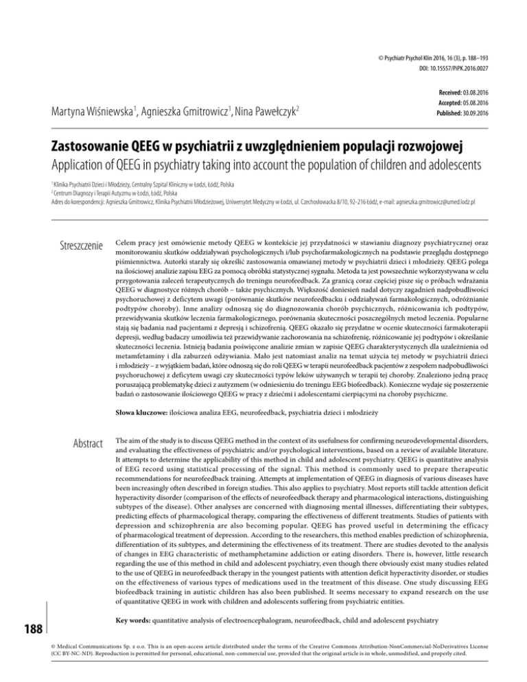 © Psychiatr Psychol Klin 2016, 16 (3), p. 188–193 DOI: 10.15557/PiPK.2016.0027 Martyna Wiśniewska1, Agnieszka Gmitrowicz1, Nina Pawełczyk2 Received: 03.08.2016 Accepted: 05.08.2016 Published: 30.09.2016 Zastosowanie QEEG w psychiatrii z uwzględnieniem populacji rozwojowej Application of QEEG in psychiatry taking into account the population of children and adolescents Klinika Psychiatrii Dzieci i Młodzieży, Centralny Szpital Kliniczny w Łodzi, Łódź, Polska Centrum Diagnozy i Terapii Autyzmu w Łodzi, Łódź, Polska Adres do korespondencji: Agnieszka Gmitrowicz, Klinika Psychiatrii Młodzieżowej, Uniwersytet Medyczny w Łodzi, ul. Czechosłowacka 8/10, 92-216 Łódź, e-mail: [email protected] 1 2 Streszczenie Celem pracy jest omówienie metody QEEG w kontekście jej przydatności w stawianiu diagnozy psychiatrycznej oraz monitorowaniu skutków oddziaływań psychologicznych i/lub psychofarmakologicznych na podstawie przeglądu dostępnego piśmiennictwa. Autorki starały się określić zastosowania omawianej metody w psychiatrii dzieci i młodzieży. QEEG polega na ilościowej analizie zapisu EEG za pomocą obróbki statystycznej sygnału. Metoda ta jest powszechnie wykorzystywana w celu przygotowania zaleceń terapeutycznych do treningu neurofeedback. Za granicą coraz częściej pisze się o próbach wdrażania QEEG w diagnostyce różnych chorób – także psychicznych. Większość doniesień nadal dotyczy zagadnień nadpobudliwości psychoruchowej z deficytem uwagi (porównanie skutków neurofeedbacku i oddziaływań farmakologicznych, odróżnianie podtypów choroby). Inne analizy odnoszą się do diagnozowania chorób psychicznych, różnicowania ich podtypów, przewidywania skutków leczenia farmakologicznego, porównania skuteczności poszczególnych metod leczenia. Popularne stają się badania nad pacjentami z depresją i schizofrenią. QEEG okazało się przydatne w ocenie skuteczności farmakoterapii depresji, według badaczy umożliwia też przewidywanie zachorowania na schizofrenię, różnicowanie jej podtypów i określanie skuteczności leczenia. Istnieją badania poświęcone analizie zmian w zapisie QEEG charakterystycznych dla uzależnienia od metamfetaminy i dla zaburzeń odżywiania. Mało jest natomiast analiz na temat użycia tej metody w psychiatrii dzieci i młodzieży – z wyjątkiem badań, które odnoszą się do roli QEEG w terapii neurofeedback pacjentów z zespołem nadpobudliwości psychoruchowej z deficytem uwagi czy skuteczności typów leków używanych w terapii tej choroby. Znaleziono jedną pracę poruszającą problematykę dzieci z autyzmem (w odniesieniu do treningu EEG biofeedback). Konieczne wydaje się poszerzenie badań o zastosowanie ilościowego QEEG w pracy z dziećmi i adolescentami cierpiącymi na choroby psychiczne. Słowa kluczowe: ilościowa analiza EEG, neurofeedback, psychiatria dzieci i młodzieży Abstract 188 The aim of the study is to discuss QEEG method in the context of its usefulness for confirming neurodevelopmental disorders, and evaluating the effectiveness of psychiatric and/or psychological interventions, based on a review of available literature. It attempts to determine the applicability of this method in child and adolescent psychiatry. QEEG is quantitative analysis of EEG record using statistical processing of the signal. This method is commonly used to prepare therapeutic recommendations for neurofeedback training. Attempts at implementation of QEEG in diagnosis of various diseases have been increasingly often described in foreign studies. This also applies to psychiatry. Most reports still tackle attention deficit hyperactivity disorder (comparison of the effects of neurofeedback therapy and pharmacological interactions, distinguishing subtypes of the disease). Other analyses are concerned with diagnosing mental illnesses, differentiating their subtypes, predicting effects of pharmacological therapy, comparing the effectiveness of different treatments. Studies of patients with depression and schizophrenia are also becoming popular. QEEG has proved useful in determining the efficacy of pharmacological treatment of depression. According to the researchers, this method enables prediction of schizophrenia, differentiation of its subtypes, and determining the effectiveness of its treatment. There are studies devoted to the analysis of changes in EEG characteristic of methamphetamine addiction or eating disorders. There is, however, little research regarding the use of this method in child and adolescent psychiatry, even though there obviously exist many studies related to the use of QEEG in neurofeedback therapy in the youngest patients with attention deficit hyperactivity disorder, or studies on the effectiveness of various types of medications used in the treatment of this disease. One study discussing EEG biofeedback training in autistic children has also been published. It seems necessary to expand research on the use of quantitative QEEG in work with children and adolescents suffering from psychiatric entities. Key words: quantitative analysis of electroencephalogram, neurofeedback, child and adolescent psychiatry © Medical Communications Sp. z o.o. This is an open-access article distributed under the terms of the Creative Commons Attribution-NonCommercial-NoDerivatives License (CC BY-NC-ND). Reproduction is permitted for personal, educational, non-commercial use, provided that the original article is in whole, unmodified, and properly cited. Zastosowanie QEEG w psychiatrii z uwzględnieniem populacji rozwojowej / Application of QEEG in psychiatry taking into account the population of children and adolescents U WSTĘP stalanie rozpoznania to kluczowy etap całego procesu diagnostyczno-terapeutycznego prowadzonego przez psychiatrę dzieci i młodzieży. Błędna decyzja może mieć poważne konsekwencje zdrowotne, dlatego tak ważne jest dodatkowe wsparcie procesu diagnostycznego przez zobiektywizo