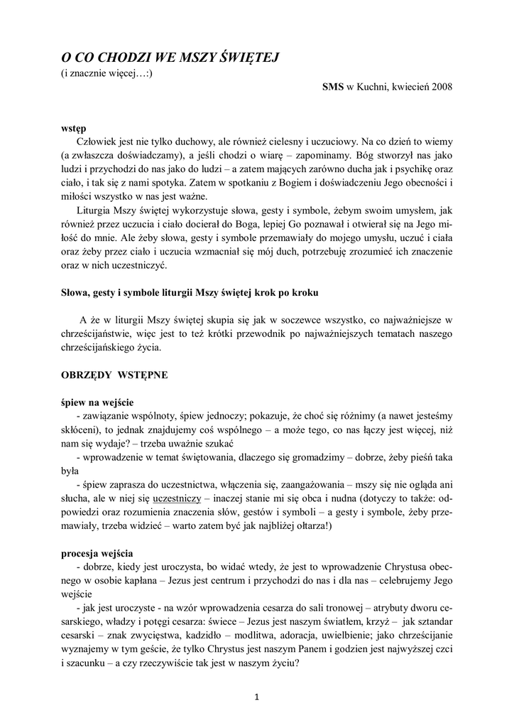 O CO CHODZI WE MSZY ŚWIĘTEJ (i znacznie więcej…:) SMS w Kuchni, kwiecień 2008 wstęp Człowiek jest nie tylko duchowy, ale również cielesny i uczuciowy. Na co dzień to wiemy (a zwłaszcza doświadczamy), a jeśli chodzi o wiarę – zapominamy. Bóg stworzył nas jako ludzi i przychodzi do nas jako do ludzi – a zatem mających zarówno ducha jak i psychikę oraz ciało, i tak się z nami spotyka. Zatem w spotkaniu z Bogiem i doświadczeniu Jego obecności i miłości wszystko w nas jest ważne. Liturgia Mszy świętej wykorzystuje słowa, gesty i symbole, żebym swoim umysłem, jak również przez uczucia i ciało docierał do Boga, lepiej Go poznawał i otwierał się na Jego miłość do mnie. Ale żeby słowa, gesty i symbole przemawiały do mojego umysłu, uczuć i ciała oraz żeby przez ciało i uczucia wzmacniał się mój duch, potrzebuję zrozumieć ich znaczenie oraz w nich uczestniczyć. Słowa, gesty i symbole liturgii Mszy świętej krok po kroku A że w liturgii Mszy świętej skupia się jak w soczewce wszystko, co najważniejsze w chrześcijaństwie, więc jest to też krótki przewodnik po najważniejszych tematach naszego chrześcijańskiego życia. OBRZĘDY WSTĘPNE śpiew na wejście - zawiązanie wspólnoty, śpiew jednoczy; pokazuje, że choć się różnimy (a nawet jesteśmy skłóceni), to jednak znajdujemy coś wspólnego – a może tego, co nas łączy jest więcej, niż nam się wydaje? – trzeba uważnie szukać - wprowadzenie w temat świętowania, dlaczego się gromadzimy – dobrze, żeby pieśń taka była - śpiew zaprasza do uczestnictwa, włączenia się, zaangażowania – mszy się nie ogląda ani słucha, ale w niej się uczestniczy – inaczej stanie mi się obca i nudna (dotyczy to także: odpowiedzi oraz rozumienia znaczenia słów, gestów i symboli – a gesty i symbole, żeby przemawiały, trzeba widzieć – warto zatem być jak najbliżej ołtarza!) procesja wejścia - dobrze, kiedy jest uroczysta, bo widać wtedy, że jest to wprowadzenie Chrystusa obecnego w osobie kapłana – Jezus jest centrum i przychodzi do nas i dla nas – celebrujemy Jego wejście - jak jest uroczyste - na wzór wprowadzenia cesarza do sali tronowej – atrybuty dworu cesarskiego, władzy i potęgi cesarza: świece – Jezus jest naszym światłem, krzyż – jak sztandar cesarski – znak zwycięstwa, kadzidło – modlitwa, adoracja, uwielbienie; jako chrześcijanie wyznajemy w tym geście, że tylko Chrystus jest naszym Panem i godzien jest najwyższej czci i szacunku – a czy rzeczywiście tak jest w naszym życiu? 1 wszyscy wstają - wchodzi Chrystus – gest powitania - postawa stojąca – najbardziej typowa postawa modlitewna; oznacza gotowość do modlitwy, służby; prorok i anioł stoją przed Bogiem – wyznajemy, że już teraz uczestniczymy w chwale nieba, bo Bóg jest pośród nas; postawa zmartwychwstania – już teraz możemy uczestniczyć w zmartwychwstaniu Chrystusa, doświadczyć życia, którym nas obdarza - w przeciwieństwie do niewolników ludzie wolni stoją – przed Bogiem jesteśmy jak wolni, jak synowie i córki, możemy odkryć i poczuć swoją prawdziwą wartość i godność; często nosimy przekonanie, że przed Bogiem trzeba się uniżyć, upokorzyć; w życiu mamy wystarczająco dużo doświadczeń upokorzenia i poniżenia (przez ludzi, siebie, wobec różnych trudnych doświadczeń), zalęknienia – to sprawią że się kurczymy, zamykamy na miłość; Bóg nie chce nas dodatkowo poniżać i napełniać lękiem przed Sobą – miłość Boga Ojca nas podnosi i wspiera, pozwala nam stanąć na własnych nogach, zaczerpnąć świeżego powietrza; razem z Jezusem zmartwychwstajemy - ze śmierci poniżeń, upokorzeń, zdołowania, lęku powstajemy do wolności umiłowanych córek i synów Boga; gest, który może nam pomóc wyzwalać się z lęku przed Bogiem i przywracać nam wiarę w siebie (żeby go wykonać, trzeba zająć miejsce siedzące i nie spóźnić się!) pocałunek ołtarza - bardzo intymny, ciepły, czuły, zmysłowy gest – nie każdego obdarzamy pocałunkiem, tylko najbliższe nam osoby; gest miłości - dwa znaczenia: 1. ołtarz – kiedyś w nim były relikwie męczenników – symbol Kościoła; kapłan – przez niego działa Chrystus; → Chrystus całuje Kościół – Oblubieniec całuje Oblubienicę; Chrystus pochyla się nade mną (to widać w geście kapłana) i mnie całuje – zawsze, niezależnie od tego, jaki przed Nim staję, to pierwszy gest Chrystusa wobec mnie – jak bardzo intymny, ciepły! Akt skruchy i wyznania grzechów jest później, najpierw Bóg okazuje mi swoją bezwarunkową miłość; On, który jest Bogiem pochyla się nade mną człowiekiem!; skoro Bóg, który wie o mnie wszystko, tak mnie traktuje, to czyż i ja nie powinienem w taki sposób przyjąć siebie i drugiego człowieka?! – kolejny gest pomagający w wyzwalaniu się z lęku przed Bogiem i odkrywaniu własnej wartości i godności 2. ołtarz – symbol obecności Chrystusa, miejsce gdzie On się za nas i z nami ofiaruje Ojcu; kapłan – przedstawiciel Kościoła; → Kościół całuje Chrystusa – Oblubienica całuje Oblubieńca; ja całuję Chrystusa, witam Go i uwielbiam - właściwa kolejność: ponieważ Jezus najpierw całuje mnie, to i ja w odpowiedzi mogę pocałować Jego – bo już się Go nie lękam, wiem, że jest mi bliski, życzliwy znak krzyża - najkrótsza modlitwa i wyznanie wiary, odwołanie do chrztu, wezwanie i uwielbienie Trójcy Świętej, modlitwa ciałem; - wypowiadamy imiona Boże – to znaczy, że nie stoimy wobec anonimowej mocy, nieokreślonego absolutu, ale wobec bliskich, kochających nas Osób, które mają swoje Imiona; - trzeba czynić znak wyraźnie, żeby zobaczyć i poczuć, że cały jestem ogarnięty przez Trójcę Świętą i Krzyż Chrystusa oraz żebym lepiej zrozumiał, co to znaczy, że Bóg jest Trójcą Osób (jak czynię znak krzyża szybko i niedbale, to 