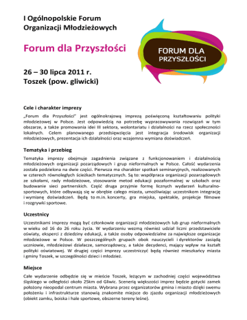 I Ogólnopolskie Forum Organizacji Młodzieżowych Forum dla Przyszłości 26 – 30 lipca 2011 r. Toszek (pow. gliwicki) Cele i charakter imprezy „Forum dla Przyszłości” jest ogólnokrajową imprezą poświęconą kształtowaniu polityki młodzieżowej w Polsce. Jest odpowiedzią na potrzebę wypracowywania rozwiązao w tym obszarze, a także promowania idei III sektora, wolontariatu i działalności na rzecz społeczności lokalnych. Celem planowanego przedsięwzięcia jest integracja środowisk organizacji młodzieżowych, prezentacja ich działalności oraz wzajemna wymiana doświadczeo. Tematyka i przebieg Tematyka imprezy obejmuje zagadnienia związane z funkcjonowaniem i działalnością młodzieżowych organizacji pozarządowych i grup nieformalnych w Polsce. Całośd wydarzenia została podzielona na dwie części. Pierwsza ma charakter spotkao seminaryjnych, realizowanych w czterech równoległych ścieżkach tematycznych. Są to: współpraca organizacji pozarządowych ze szkołami, rady młodzieżowe, stosowanie metod edukacji pozaformalnej w szkołach oraz budowanie sieci partnerskich. Częśd druga przyjmie formę licznych wydarzeo kulturalnosportowych, które odbywają się w obrębie całego miasta, umożliwiając uczestnikom integrację i wymianę doświadczeo. Będą to m.in. koncerty, gra miejska, spektakle, projekcje filmowe i rozgrywki sportowe. Uczestnicy Uczestnikami imprezy mogą byd członkowie organizacji młodzieżowych lub grup nieformalnych w wieku od 16 do 26 roku życia. W wydarzeniu wezmą również udział liczni przedstawiciele oświaty, eksperci z dziedziny edukacji, a także osoby odpowiedzialne za największe organizacje młodzieżowe w Polsce. W poszczególnych grupach obok nauczycieli i dyrektorów zasiądą uczniowie, młodzieżowi działacze, samorządowcy, a także decydenci, mający wpływ na kształt polityki oświatowej. W drugiej części imprezy uczestniczyd będą również mieszkaocy miasta i gminy Toszek, w szczególności dzieci i młodzież. Miejsce Całe wydarzenie odbędzie się w mieście Toszek, leżącym w zachodniej części województwa śląskiego w odległości około 25km od Gliwic. Scenerią większości imprez będzie gotycki zamek położony nieopodal centrum miasta. Wybrana przez organizatorów gmina i miasto dzięki swemu położeniu i infrastrukturze stanowią znakomite miejsce do zjazdu organizacji młodzieżowych (obiekt zamku, boiska i hale sportowe, obszerne tereny leśne). Plan imprezy Spotkanie trwad będzie od 26 do 30 lipca. Codziennie uczestnicy przeznaczą pierwszą połowę dnia (do około godz. 15) na pracę w grupach seminaryjnych. Druga częśd rozpoczynad się będzie około godz. 17.30 (po przerwie obiadowej). Na terenie całego miasta, zarówno w centrum, na zamku jak i na obrzeżach, realizowane będą równolegle zajęcia. Planowane są m.in. koncerty, rozgrywki piłkarskie, teatr uliczny, happeningi, kino pod gwiazdami, wystawy i ogniska. Ponadto na przełomie września i października zostanie zorganizowana w Warszawie konferencja podsumowująca całośd wydarzenia i prezentująca wypracowane rozwiązania. Organizator i partnerzy Organizatorem „Forum Dla Przyszłości” jest grupa MALLOWICZE. Zrzesza ona przedstawicieli 12 organizacji młodzieżowych z całej Polski, będących absolwentami Młodzieżowej Akademii Lokalnych Liderów, realizowanej przez Narodową Agencję Programu „Młodzież w działaniu”. Ponadto wśród współorganizatorów i partnerów jest kilkanaście innych organizacji pozarządowych i grup nieformalnych o charakterze młodzieżowym z całego kraju. Organizacją wspierającą „Forum dla Przyszłości” jest Stowarzyszenie Edukacji Rówieśniczej. Wydarzenie odbędzie się pod honorowym patronatem Burmistrza Miasta Toszek Pana Grzegorza Kupczyka. Dodatkowo projekt otrzymał Logo Europejskiego Roku Wolontariatu 2011. www.forumdlaprzyszlosci.pl Kontakt Stowarzyszenie Edukacji Rówieśniczej Królewska 90/21 30-079 Kraków www.ser.org.pl Lena Głowacka [email protected] telefon: 603 400 275 Bartłomiej Kisiel [email protected] telefon: 692 017 374 Patronaty Burmistrz Miasta Toszek Wsparcie Centrum Kultury „Zamek w Toszku” Ten projekt jest realizowany przy wsparciu finansowym Komisji Europejskiej. Ten materiał odzwierciedla jedynie stanowisko jego autora, a Komisja nie ponosi odpowiedzialności za sposób wykorzystania zawartych w nim informacji.