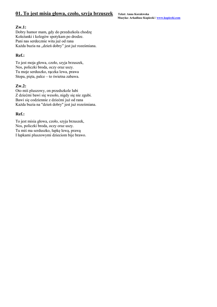 01. To jest misia głowa, czoło, szyja brzuszek Zw.1: Dobry humor mam, gdy do przedszkola chodzę Koleżanki i kolegów spotykam po drodze. Pani nas serdecznie wita już od rana Każda buzia na „dzień dobry” jest już roześmiana. Ref.: To jest moja głowa, czoło, szyja brzuszek, Nos, policzki broda, oczy oraz uszy. Tu moje serduszko, rączka lewa, prawa Stopa, pięta, palce – to świetna zabawa. Zw.2: Oto miś pluszowy, on przedszkole lubi Z dziećmi bawi się wesoło, nigdy się nie zgubi. Bawi się codziennie z dziećmi już od rana Każda buzia na "dzień dobry" jest już roześmiana. Ref.: To jest misia głowa, czoło, szyja brzuszek, Nos, policzki broda, oczy oraz uszy. Tu miś ma serduszko, łapkę lewą, prawą I łapkami pluszowymi dzieciom bije brawo. Tekst: Anna Koralewska Muzyka: Arkadiusz Kupiecki / www.kupiecki.com