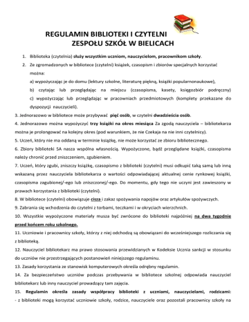 REGULAMIN BIBLIOTEKI I CZYTELNI ZESPOŁU SZKÓŁ W BIELICACH 1. Biblioteka (czytelnia) służy wszystkim uczniom, nauczycielom, pracownikom szkoły. 2. Ze zgromadzonych w bibliotece (czytelni) książek, czasopism i zbiorów specjalnych korzystać można: a) wypożyczając je do domu (lektury szkolne, literaturę piękną, książki popularnonaukowe), b) czytając lub przeglądając na miejscu (czasopisma, kasety, księgozbiór podręczny) c) wypożyczając lub przeglądając w pracowniach przedmiotowych (komplety przekazane do dyspozycji nauczycieli). 3. Jednorazowo w bibliotece może przybywać pięć osób, w czytelni dwadzieścia osób. 4. Jednorazowo można wypożyczyć trzy książki na okres miesiąca Za zgodą nauczyciela – bibliotekarza można je prolongować na kolejny okres (pod warunkiem, że nie Czekaja na nie inni czytelnicy). 5. Uczeń, który nie ma oddaną w terminie książkę, nie może korzystać ze zbioru bibliotecznego. 6. Zbiory biblioteki SA nasza wspólna własnością. Wypożyczone, bądź przeglądane książki, czasopisma należy chronić przed zniszczeniem, zgubieniem. 7. Uczeń, który zgubi, zniszczy książkę, czasopismo z biblioteki (czytelni) musi odkupić taką samą lub inną wskazaną przez nauczyciela bibliotekarza o wartości odpowiadającej aktualnej cenie rynkowej książki, czasopisma zagubionej/-ego lub zniszczonej/-ego. Do momentu, gdy tego nie uczyni jest zawieszony w prawach korzystania z biblioteki (czytelni). 8. W bibliotece (czytelni) obowiązuje cisza i zakaz spożywania napojów oraz artykułów spożywczych. 9. Zabrania się wchodzenia do czytelni z torbami, teczkami i w okryciach wierzchnich. 10. Wszystkie wypożyczone materiały musza być zwrócone do biblioteki najpóźniej na dwa tygodnie przed końcem roku szkolnego. 11. Uczniowie i pracownicy szkoły, którzy z niej odchodzą są obowiązani do wcześniejszego rozliczania się z biblioteką. 12. Nauczyciel bibliotekarz ma prawo stosowania przewidzianych w Kodeksie Ucznia sankcji w stosunku do uczniów nie przestrzegających postanowień niniejszego regulaminu. 13. Zasady korzystania ze stanowisk komputerowych określa odrębny regulamin. 14. Za bezpieczeństwo uczniów podczas przebywania w bibliotece szkolnej odpowiada nauczyciel bibliotekarz lub inny nauczyciel prowadzący tam zajęcia. 15. Regulamin określa zasady współpracy biblioteki z uczniami, nauczycielami, rodzicami: - z biblioteki mogą korzystać uczniowie szkoły, rodzice, nauczyciele oraz pozostali pracownicy szkoły na podstawie zapisów w kartach czytelnika biblioteki, - użytkownicy biblioteki, którzy przestają być uczniami, nauczycielami, pracownikami szkoły, zobowiązani są do rozliczenia się z biblioteką szkolną, - uczniowie szkoły mogą rozwijać swoje zainteresowania poprzez udział w pracy Koła Biblioteki Szkolnej, - użytkownicy maja prawo do informacji i korzystania nieodpłatnie ze wszystkich zbiorów biblioteki, - biblioteka pracuje nad kształtowaniem u uczniów postaw sprzyjających ich dalszemu rozwojowi indywidualnemu i społecznemu, ściśle współpracując z pedagogiem szkolnym, pielęgniarką szkolną w oparciu -w - o program bibliotece biblioteka wychowawczy przestrzega wspiera nauczycieli się w i profilaktyczny przepisów procesie i dydaktycznym szkoły, zasad i BHP, wychowawczym, - biblioteka współpracuje ze wszystkimi nauczycielami, służąc swoimi zasobami bibliotecznymi, - informuje nauczycieli, wychowawców i rodziców o stanie czytelnictwa uczniów, - uczestniczy w organizacji imprez okolicznościowych zgodnie z zapisami w planie pracy szkoły, 16. - biblioteka Regulamin wspomaga określa zasady wspólne współpracy organizowanie wymiana w doborze biblioteki z imprez wiedzy - innymi udział uczestniczenie w i bibliotekami: , doświadczeń, międzybiblioteczne, w różnych literatury, czytelniczych wypożyczenia - rodziców formach kiermaszach doskonalenia zawodowego