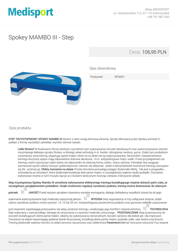 Sklep MEDISPORT ul. Haraszowskie 71a, 47-110 Kolonowskie +48 791 987 600 Spokey MAMBO III - Step Cena: 106,95 PLN Opis słownikowy Producent SPOKEY Opis produktu STEP TRZYSTOPNIOWY SPOKEY MAMBO III Stwórz z nami swoją domową siłownię. Sprzęt oferowany przez Spokey pomoże Ci zadbać o formę, wyrzeźbić sylwetkę i wyrobić zdrowe nawyki. Lekki fitness? W budowaniu formy istotnym czynnikiem jest wykonywanie ćwiczeń aerobowych oraz wykorzystywanie szeroko rozumianego lekkiego sprzętu fitness, w którego skład wchodzą m.in. hantle i obciążenia, twistery, gumy. Dzięki tym produktom urozmaicisz swój trening, angażując partie mięśni, które na co dzień nie są wykorzystywane. Na komfort i bezpieczeństwo treningu kluczowy wpływ mają odpowiednio dobrane akcesoria - m.in. antypoślizgowe maty i wałki. Przed przystąpieniem do treningu warto wyznaczyć sobie realny cel odpowiedni do obecnej formy, wieku i stanu zdrowia. Pamiętaj! Aby osiągnąć wymarzone wyniki należy ćwiczyć systematycznie i zdrowo się odżywiać. Jeżeli w którymkolwiek momencie treningu poczujesz się źle - przerwij go. Efekty ćwiczenia na stepie Proste ćwiczenia pozwalają osiągać doskonałe efekty. Tak jest w przypadku... wchodzenia po schodach, które doskonale kształtuje dole partie mięśni, w szczególności pięknie rzeźbi pośladki. Ćwiczenia wykonywać można w rytm muzyki, łączyć je z krokami tanecznymi tworząc ciekawe, intensywne układy. Step trzystopniowy Spokey Mambo III umożliwia wykonywanie efektywnego treningu kształtującego mięśnie dolnych partii ciała, ze szczególnym uwzględnieniem pośladków. Dzięki możliwości regulacji wysokości podestu, trening można dostosować do własnych potrzeb. JAKOŚĆ Przed naszym sprzętem stawiamy wysokie wymagania, dlatego dokładamy wszelkich starań by do jego wykonania wykorzystywane były materiały najwyższej jakości. WYGODA Step wyposażony w trzy odłączane stopnie, dzięki czemu wysokość podestu może wynosić: 10, 15 lub 20 cm. Antypoślizgowa powierzchnia podestu oraz gumowe nakładki usytuowane pod stopniami zapobiegają przesuwaniu się stepu podczas treningu, zwiększając jego komfort i bezpieczeństwo. TECHNOLOGIA Step wykonany z wytrzymałego, łatwego do utrzymania w czystości materiału sztucznego. PRZEZNACZENIE Step przeznaczony do ćwiczeń kształtujących dolne partie mięśni. Idealny do wykonywania różnorodnych ćwiczeń zarówno dla kobiet jak i dla mężczyzn. Ćwiczenia na stepie wspomagają spalanie tkanki tłuszczowej, kształtują dolne partie mięśni: pośladki, łydki, uda, biodra oraz brzuch. Trening doskonale wpływa również na układ sercowo-naczyniowy oraz oddechowy.ParametryMateriał: tworzywo sztuczne;Trzy stopnie Plik wygenerowano: 07-03-2017 Oprogramowanie sklepu: AptusShop Sklep MEDISPORT ul. Haraszowskie 71a, 47-110 Kolonowskie +48 791 987 600 regulacji wysokości: 10cm, 15cm, 20cm;Antypoślizgowa powierzchnia;Antypoślizgowe gumowe nakładki od podstawy stepu;Długość: 79cm;Szerokość: 29cm;Maksymalna waga użytkownika: 100kg; Plik wygenerowano: 07-03-2017 Powered by TCPDF (www.tcpdf.org) Oprogramowanie sklepu: AptusShop