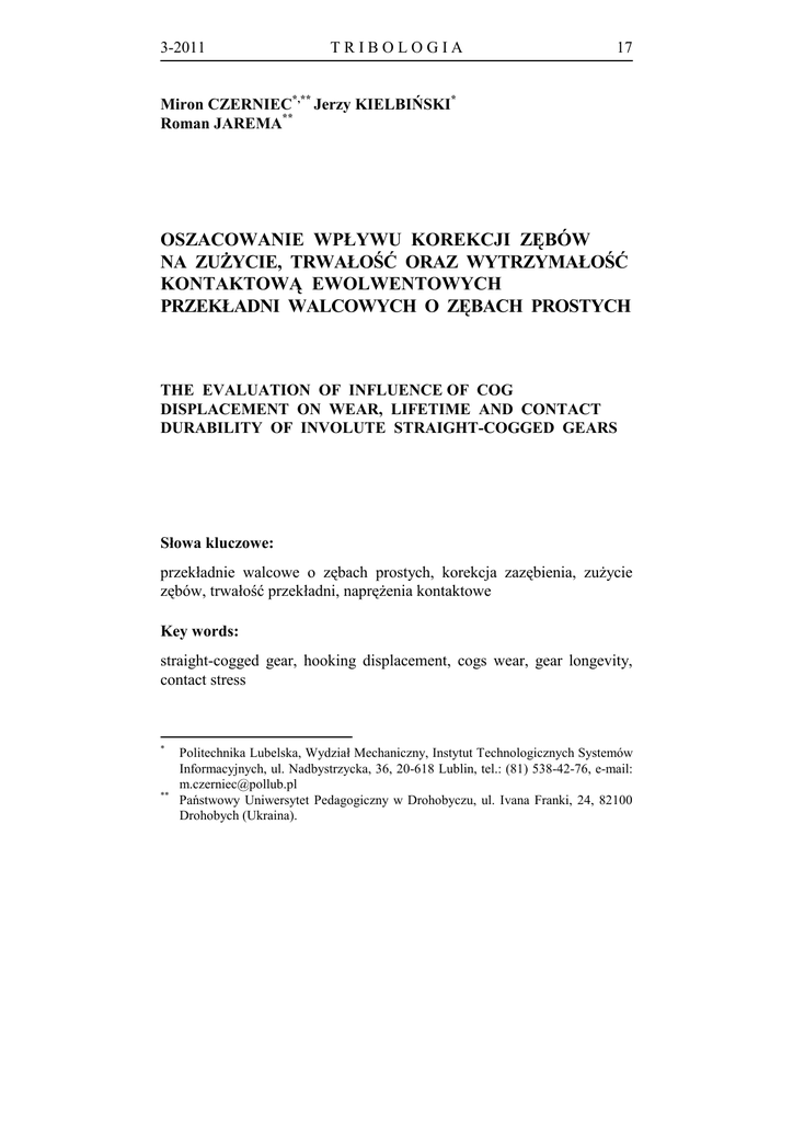 3-2011 TRIBOLOGIA 17 Miron CZERNIEC*,** Jerzy KIELBIŃSKI* Roman JAREMA** OSZACOWANIE WPŁYWU KOREKCJI ZĘBÓW NA ZUŻYCIE, TRWAŁOŚĆ ORAZ WYTRZYMAŁOŚĆ KONTAKTOWĄ EWOLWENTOWYCH PRZEKŁADNI WALCOWYCH O ZĘBACH PROSTYCH THE EVALUATION OF INFLUENCE OF COG DISPLACEMENT ON WEAR, LIFETIME AND CONTACT DURABILITY OF INVOLUTE STRAIGHT-COGGED GEARS Słowa kluczowe: przekładnie walcowe o zębach prostych, korekcja zazębienia, zużycie zębów, trwałość przekładni, naprężenia kontaktowe Key words: straight-cogged gear, hooking displacement, cogs wear, gear longevity, contact stress * ** Politechnika Lubelska, Wydział Mechaniczny, Instytut Technologicznych Systemów Informacyjnych, ul. Nadbystrzycka, 36, 20-618 Lublin, tel.: (81) 538-42-76, e-mail: [email protected] Państwowy Uniwersytet Pedagogiczny w Drohobyczu, ul. Ivana Franki, 24, 82100 Drohobych (Ukraina). 18 TRIBOLOGIA 3-2011 Streszczenie Przedstawiono opracowaną metodę badania procesu zużywania powierzchni bocznych zębów walcowych przekładni zębatych z uwzględnieniem korekcji zazębienia. Przeprowadzono badania wpływu korekcji technologicznej (P-O) oraz konstrukcyjnej (P) na maksymalne naprężenia kontaktowe, prędkość poślizgu, zużycie zębów oraz trwałość przekładni. Ustalono podstawowe zależności tego wpływu, a wyniki obliczeń podano w postaci wykresów. WPROWADZENIE W nowoczesnych przekładniach zębatych koła zębate niekorygowane stosowane są rzadko. Stosowanie dodatniego współczynnika przesunięcia zarysu pozwala na uniknięcie podcięcia stopy zęba podczas jego kształtowania w procesie obróbki mechanicznej. Taki zabieg powoduje wzrost grubości zęba u jego podstawy, a tym samym podwyższenie odporności na jego złamanie. Zastosowanie korekcji uzębienia z dodatnim współczynnikiem przesunięcia zarysu przyczynia się także do wzrostu promienia krzywizny boku zęba o zarysie ewolwentowym, co z kolei obniża naprężenia kontaktowe. Wpływa także na rozkład prędkości poślizgu na czynnej wysokości zęba. Przedstawione problemy były już przedmiotem częściowych rozważań w inny niż podano niżej sposób, dla różnych typów kół zębatych [L. 1, 7, 8]. W [L. 1] podano procedurę optymalizacji konturu wyjściowego oraz współczynników korekcji pod względem podwyższenia nośności (obniżenia naprężeń kontaktowych w środku zazębienia) przekładni stożkowych z zębami o zarysie kołowo-łukowym. Praca [L. 7] podaje metodę, według której w przekładniach ewolwentowych uwzględnia się wpływ korekcji na interferencję zębów. Ustaleniu wpływu modyfikacji geometrii narzędzi na maksymalne naprężenia kontaktowe w przekładniach stożkowych o zębach łukowych poświęcono pracę [L. 8]. Te aspekty powodują, iż poprzez zastosowanie korekcji można uzyskać obniżenie zużycia ściernego powierzchni zęba, a poprzez to zwiększenie trwałości przekładni. W literaturze brak metod na oszacowanie wpływu korekcji zazębienia na zużycie oraz trwałość kół zębatych. W artykule przedstawiono autorską metodę badania zużycia zębów w kołach zębatych korygowanych bazującą na metodzie badania zużycia przekładni walcowych o zębach prostych [L. 3]. 3-2011 TRIBOLOGIA 19 METODA ROZWIĄZANIA ZAGADNIENIA Zużycie liniowe zębów przekładni w dowolnym punkcie j zarysu w ciągu pewnego czasu styku t ′j określone jest następującym wzorem [L. 3, 4]: hkj′ = gdzie: V j = V t ′j = 2b j / V0 V j t ′j ( fp j max ) mk Ck (0.35Rm ) mk (1) – prędkość poślizgu w kolejnych punktach j zarysów zębów, – czas kontaktu przy przemieszczaniu się punktu j styku zębów na szerokość pola ich styku wzdłuż zarysu, V0 = ω1r1 sin α – prędkość przemieszczenia się punktu styku wzdłuż zarysu zęba, ω1 – prędkość kątowa zębnika, 2r1 = d1 = z1m – średnica podziałowa zębnika, m – moduł nominalny, o α = 20 – nominalny kąt przyporu (kat zarysu w biegunie zazębienia dla przekładni niekorygowanej), z1 , z2 – liczba zębów kół, k = 1;2 – numeracja kół zębatych, f – współczynnik tarcia ślizgowego, Rm – doraźna wytrzymałość materiału przy rozciąganiu, C k, mk – wskaźniki odporności na zużycie materiałów w parze tribologicznej. Zużycie zębów w ciągu zadanego czasu t * pracy obliczane jest według wzoru: hkj = 60nk hkj′ t * gdzie: nk – liczba obrotów kół zębatych. (2) 20 TRIBOLOGIA 3-2011 Trwałość przekładni dla zadanego granicznego zużycia hk * : t = hk* / hkj , hkj = 60nk hkj′ (3) Maksymalne naprężenia kontaktowe p j max oraz szerokość pola styku 2b j w j -tym punkcie obliczane są według wzorów Hertza: p j max = 0,564 F ′ / θρ j , 2b j = 2, 256 θF ′ρ j (4) gdzie: F ′ = F / bw , F = Tnom К v / r1 cos α – siła międzyzębna, Tnom = 9550 Pв / n1 – nominalny moment obrotowy, Pв – moc na wale czynnym (zębniku), n1 – liczba obrotów wału czynnego, – współczynnik dynamiczny, Kv θ = (1 − ν12 ) / E1 + (1 − ν 22 ) / E2 , E, ν – moduły Younga oraz współczynniki Poissone'a materiałów zębów, – szerokość koła, – liczba par zazębień uczestniczących jednocześnie w przekazywaniu mocy, – zredukowany promień krzywizny zarysów b w ρj zębów. Zredukowany promień krzywizny zębów przekładni walcowej: ρj = ρ1 j ρ 2 j ρ1 j + ρ 2 j , j = 0,1, 2, 3,... s (5) gdzie: ρ1 j , ρ 2 j – odpowiednio promienie krzywizny ewolwentowych powierzchni bocznych zębów zębnika і koła zębatego, j = 0, j = s odpowiadają pierwszemu oraz ostatniemu punktowi zazębienia zębów. 3-2011 TRIBOLOGIA 21 Odpowiednio wzory na promienie krzywizny zębów zębnika і koła zębatego przekładni walcowej w j-tym punkcie zazębienia mają postać [L. 3, 4]: ρ1 j = rb1tgα1 j rb1 = r1 cos α , α 1 j = arctg (tgα10 + j∆ϕ) tgα10 = (1 + u ) tgα − r2 = u cos α ( r20 / r2 ) 2 − cos 2 α mz2 , r20 = ra 2 − r , ra 2 = r2 + m , r = 0, 2m 2 tgα1s = (r1s / r1 )