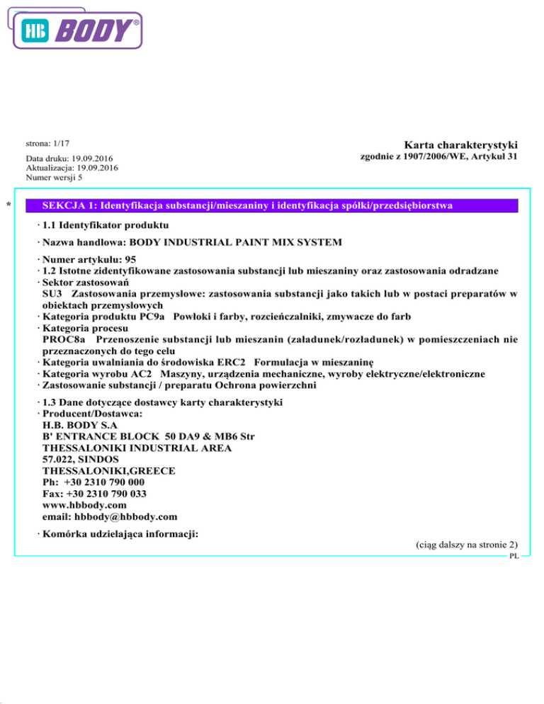 43.1.9 strona: 1/17 Data druku: 19.09.2016 Aktualizacja: 19.09.2016 Numer wersji 5 * Karta charakterystyki zgodnie z 1907/2006/WE, Artykuł 31 SEKCJA 1: Identyfikacja substancji/mieszaniny i identyfikacja spółki/przedsiębiorstwa · 1.1 Identyfikator produktu · Nazwa handlowa: BODY INDUSTRIAL PAINT MIX SYSTEM · Numer artykułu: 95 · 1.2 Istotne zidentyfikowane zastosowania substancji lub mieszaniny oraz zastosowania odradzane · Sektor zastosowań SU3 Zastosowania przemysłowe: zastosowania substancji jako takich lub w postaci preparatów w obiektach przemysłowych · Kategoria produktu PC9a Powłoki i farby, rozcieńczalniki, zmywacze do farb · Kategoria procesu PROC8a Przenoszenie substancji lub mieszanin (załadunek/rozładunek) w pomieszczeniach nie przeznaczonych do tego celu · Kategoria uwalniania do środowiska ERC2 Formulacja w mieszaninę · Kategoria wyrobu AC2 Maszyny, urządzenia mechaniczne, wyroby elektryczne/elektroniczne · Zastosowanie substancji / preparatu Ochrona powierzchni · 1.3 Dane dotyczące dostawcy karty charakterystyki · Producent/Dostawca: H.B. BODY S.A B' ENTRANCE BLOCK 50 DA9 & MB6 Str THESSALONIKI INDUSTRIAL AREA 57.022, SINDOS THESSALONIKI,GREECE Ph: +30 2310 790 000 Fax: +30 2310 790 033 www.hbbody.com email: [email protected] · Komórka udzielająca informacji: (ciąg dalszy na stronie 2) PL 43.1.9 strona: 2/17 Karta charakterystyki zgodnie z 1907/2006/WE, Artykuł 31 Data druku: 19.09.2016 Aktualizacja: 19.09.2016 Numer wersji 5 Nazwa handlowa: BODY INDUSTRIAL PAINT MIX SYSTEM (ciąg dalszy od strony 1) H.B. BODY S.A B' ENTRANCE BLOCK 50 DA9 & MB6 Str THESSALONIKI INDUSTRIAL AREA 57.022, SINDOS THESSALONIKI,GREECE Ph: +30 2310 790 000 Fax: +30 2310 790 033 www.hbbody.com email: [email protected] · 1.4 Numer telefonu alarmowego: National Poisons Information Centre The Nofer Institute of Occupational Medicine ul. Teresy 8 Lòdz Telephone: +48 42 63 14 724 Fax: +48 42 63 14 725 Emergency telephone: +48 42 63 14 724 E-mail address: [email protected] SEKCJA 2: Identyfikacja zagrożeń · 2.1 Klasyfikacja substancji lub mieszaniny · Klasyfikacja zgodnie z rozporządzeniem (WE) nr 1272/2008 GHS02 płomień Flam. Liq. 2 H225 Wysoce łatwopalna ciecz i pary. GHS08 zagrożenie dla zdrowia Carc. 1B Repr. 1A STOT RE 2 Asp. Tox. 1 H350 Może powodować raka. H360Df Może działać szkodliwie na dziecko w łonie matki. Podejrzewa się, że działa szkodliwie na płodność. H373 Może powodować uszkodzenie narządów poprzez długotrwałe lub narażenie powtarzane. H304 Połknięcie i dostanie się przez drogi oddechowe może grozić śmiercią. GHS09 środowisko Aquatic Chronic 2 H411 Działa toksycznie na organizmy wodne, powodując długotrwałe skutki. GHS07 Acute Tox. 4 H332 Działa szkodliwie w następstwie wdychania. (ciąg dalszy na stronie 3) PL 43.1.9 strona: 3/17 Karta charakterystyki zgodnie z 1907/2006/WE, Artykuł 31 Data druku: 19.09.2016 Aktualizacja: 19.09.2016 Numer wersji 5 Nazwa handlowa: BODY INDUSTRIAL PAINT MIX SYSTEM (ciąg dalszy od strony 2) Skin Irrit. 2 H315 Działa drażniąco na skórę. · 2.2 Elementy oznakowania · Oznakowanie zgodnie z rozporządzeniem (WE) nr 1272/2008 Produkt jest klasyfikowany i oznakowany zgodnie z przepisami CLP. · Piktogramy określające rodzaj zagrożenia GHS02 GHS07 GHS08 GHS09 · Hasło ostrzegawcze Niebezpieczeństwo · Składniki określające niebezpieczeństwo do etykietowania: ksylen C.I.Pigment Yellow 34 toluen Solwent nafta (ropa naftowa), węglowodory lekkie aromatyczne · Zwroty wskazujące rodzaj zagrożenia H225 Wysoce łatwopalna ciecz i pary. H332 Działa szkodliwie w następstwie wdychania. H315 Działa drażniąco na skórę. H350 Może powodować raka. H360Df Może działać szkodliwie na dziecko w łonie matki. Podejrzewa się, że działa szkodliwie na płodność. H373 Może powodować uszkodzenie narządów poprzez długotrwałe lub narażenie powtarzane. H304 Połknięcie i dostanie się przez drogi oddechowe może grozić śmiercią. H411 Działa toksycznie na organizmy wodne, powodując długotrwałe skutki. · Zwroty wskazujące środki ostrożności P210 Przechowywać z dala od źródeł ciepła, gorących powierzchni, iskrzenia, otwartego ognia i innych źródeł zapłonu. Palenie wzbronione. P241 Używać elektrycznego/wentylującego/oświetleniowego/przeciwwybuchowego sprzętu. P301+P310 W PRZYPADKU POŁKNIĘCIA: Natychmiast skontaktować się z OŚRODKIEM ZATRUĆ/lekarzem. P303+P361+P353 W PRZYPADKU KONTATKU ZE SKÓRĄ (lub z włosami): Natychmiast zdjąć całą zanieczyszczoną odzież. Spłukać skórę pod strumieniem wody/prysznicem. P405 Przechowywać pod zamknięciem. P501 Zawartość / pojemnik usuwać zgodnie z przepisami miejscowymi / regionalnymi / narodowymi / międzynarodowymi. · Dane dodatkowe: EUH208 Zawiera butanone oxide. Może powodować wystąpienie reakcji alergicznej. Produkt przeznaczony wyłącznie do użytku zawodowego. · 2.3 Inne zagrożenia · Wyniki oceny właściwości PBT i vPvB · PBT: Nie nadający się do zastosowania. (ciąg dalszy na stronie 4) PL 43.1.9 strona: 4/17 Data druku: 19.09.2016 Aktualizacja: 19.09.2016 Numer wersji 5 Karta charakterystyki zgodnie z 1907/2006/WE, Artykuł 31 Nazwa handlowa: BODY INDUSTRIAL PAINT MIX SYSTEM (ciąg dalszy od strony 3) · vPvB: Nie nadający się do zastosowania. SEKCJA 3: Skład/informacja o składnikach · 3.2 Charakterystyka chemiczna: Mieszaniny · Opis: Mieszanka z niżej wymienionych składników z bezpiecznymi domieszkami. · Składniki niebezpieczne: CAS: 1330-20-7 ksylen EINECS: 215-535-7 Flam. Liq. 3, H226 Numer indeksu: 601-022-00-9 Acute Tox. 4, H312; Acute Tox. 4, H332; Skin Irrit. RTECS: ZE 2100000 2, H315 Reg.nr.: 01-2119488216-32-001 01-2119488216-32-002 01-2119488216-32-003 CAS: 108-88-3 toluen EINECS: 203-625-9 Flam. Liq. 2, H225 Numer indeksu: 601-021-00-3 Repr. 2, H361d; STOT RE 2, H373; Asp. Tox. 1, RTECS: XS 5250000 H304 Skin Irrit. 2, H315; STOT SE 3, H336 Reg.nr.: