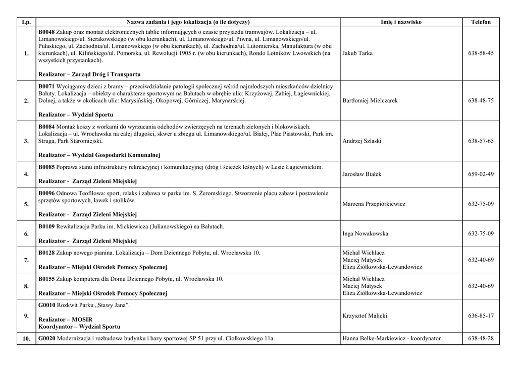 Lp. 1. Nazwa zadania i jego lokalizacja (o ile dotyczy) B0048 Zakup oraz montaż elektronicznych tablic informujących o czasie przyjazdu tramwajów. Lokalizacja – ul. Limanowskiego/ul. Sierakowskiego (w obu kierunkach), ul. Limanowskiego/ul. Piwna, ul. Limanowskiego/ul. Pułaskiego, ul. Zachodnia/ul. Limanowskiego (w obu kierunkach), ul. Zachodnia/ul. Lutomierska, Manufaktura (w obu kierunkach), ul. Kilińskiego/ul. Pomorska, ul. Rewolucji 1905 r. (w obu kierunkach), Rondo Lotników Lwowskich (na wszystkich przystankach). Imię i nazwisko Telefon Jakub Tarka 638-58-45 Bartłomiej Mielczarek 638-48-75 Andrzej Szlaski 638-57-65 Jarosław Białek 659-02-49 Marzena Przepiórkiewicz 632-75-09 Inga Nowakowska 632-75-09 Michał Wichłacz Maciej Matysek Eliza Ziółkowska-Lewandowicz 632-40-69 Michał Wichłacz Maciej Matysek Eliza Ziółkowska-Lewandowicz 632-40-69 Krzysztof Malicki 636-85-17 Hanna Belke-Markiewicz - koordynator 638-48-28 Realizator – Zarząd Dróg i Transportu 2. B0071 Wyciągamy dzieci z bramy – przeciwdziałanie patologii społecznej wśród najmłodszych mieszkańców dzielnicy Bałuty. Lokalizacja – obiekty o charakterze sportowym na Bałutach w obrębie ulic: Krzyżowej, Żabiej, Łagiewnickiej, Dolnej, a także w okolicach ulic: Marysińskiej, Okopowej, Górniczej, Marynarskiej. Realizator – Wydział Sportu 3. B0084 Montaż koszy z workami do wyrzucania odchodów zwierzęcych na terenach zielonych i blokowiskach. Lokalizacja – ul. Wrocławska na całej długości, skwer u zbiegu ul. Limanowskiego/ul. Białej, Plac Piastowski, Park im. Struga, Park Staromiejski. Realizator – Wydział Gospodarki Komunalnej B0085 Poprawa stanu infrastruktury rekreacyjnej i komunikacyjnej (dróg i ścieżek leśnych) w Lesie Łagiewnickim. 4. Realizator - Zarząd Zieleni Miejskiej 5. B0096 Odnowa Teofilowa: sport, relaks i zabawa w parku im. S. Żeromskiego. Stworzenie placu zabaw i postawienie sprzętów sportowych, ławek i stolików. Realizator - Zarząd Zieleni Miejskiej B0109 Rewitalizacja Parku im. Mickiewicza (Julianowskiego) na Bałutach. 6. Realizator - Zarząd Zieleni Miejskiej B0128 Zakup nowego pianina. Lokalizacja – Dom Dziennego Pobytu, ul. Wrocławska 10. 7. Realizator – Miejski Ośrodek Pomocy Społecznej B0155 Zakup komputera dla Domu Dziennego Pobytu, ul. Wrocławska 10. 8. Realizator – Miejski Ośrodek Pomocy Społecznej G0010 Rozkwit Parku „Stawy Jana”. 9. 10. Realizator – MOSIR Koordynator – Wydział Sportu G0020 Modernizacja i rozbudowa budynku i bazy sportowej SP 51 przy ul. Ciołkowskiego 11a. Grzegorz Wilanowicz - odpowiedzialny 638-48-22 Żaneta Iwańczyk – przychodnia Romuald Stachaczyk – UMŁ 638-47-21 Żaneta Iwańczyk – przychodnia Romuald Stachaczyk – UMŁ 638-47-21 Bartłomiej Mielczarek 638-48-75 Eligiusz Pietrzak 638-46-84 Hanna Belke-Markiewicz - koordynator Elżbieta Kukuła – odpowiedzialny Aneta Sochacka – odpowiedzialny 638-48-28 638-48-27 638-48-63 Hanna Belke-Markiewicz - koordynator Dariusz Nejman - odpowiedzialny 638-48-28 638-48-19 Michał Wichłacz Maciej Matysek Eliza Ziółkowska-Lewandowicz 632-40-69 Bartosz Zimny Adam Ochmański 272-63-29 638-49-25 Krzysztof Dałek 656-78-42 Bartłomiej Pawelczyk 638-43-43 Realizator – dyrektor SP 51 Koordynator – Wydział Edukacji G0042 Termomodernizacja budynku Miejskiej Przychodni „Tatrzańska” przy ul. Tatrzańskiej 109. 11. Realizator – dyrektor Miejskiej Przychodni „Tatrzańska” Koordynator – Wydział Zdrowia i Spraw Społecznych G0043 Doposażenie poradni neurologicznej poprzez zakup aparatu do badań EEG w Miejskiej Przychodni „Dąbrowa”, przy ul. Felińskiego 7. 12. Realizator – Miejskiej Przychodni „Dąbrowa” Koordynator – Wydział Zdrowia i Spraw Społecznych G0069 Trener/instruktor sportów plażowych. Lokalizacja – MOSiR, ul. Rzgowska 247. 13. Realizator – Wydział Sportu G0088 Doposażenie Jednostki Ochotniczej Straży Pożarnej Łódź-Wiskitno. Lokalizacja – ul. Kolumny 312. 14. Realizator – Wydział Zarządzania Kryzysowego i Bezpieczeństwa G0097 Sprzęt sportowy. Lokalizacja – ZSP 9 w Łodzi, al. Politechniki 38. 15. Realizator – dyrektor ZSP 9 Koordynator – Wydział Edukacji L0011 Akademia Koszykówki Marcina Gortata. Lokalizacja – sześć wybranych szkół podstawowych na terenie całego Miasta. 16. Realizator – dyrektorzy sześciu wybranych szkół Koordynator – Wydział Edukacji L0069 Prowadzenie banku żywności w Łodzi. 17. Realizator – Miejski Ośrodek Pomocy Społecznej L0082 Łódzki rower miejski. 18. Realizator – Zarząd Dróg i Transportu L0095 Poprawa warunków bytowych zwierząt w łódzkim schronisku. Lokalizacja – ul. Marmurowa 4. 19. Realizator – Schronisko dla Zwierząt 20. L0145 Utworzenie bezpłatnej, ogólnomiejskiej sieci bezprzewodowego Internetu WiFi na terenie miasta. Realizator – Wydział Informatyki 21. L0168 Łodzianie dla Dzieci. Lokalizacja – Hospicjum Domowe dla Dzieci Ziemi łódzkiej – prowadzone przez fundację GAJUSZ, ul. Dąbrowskiego 87. Iwona Iwanicka 638-47-37 Andrzej Szlaski 638-57-65 Hanna Belke-Markiewicz - koordynator Grzegorz Wilanowicz - odpowiedzialny 638-48-28 638-48-22 Hanna Belke-Markiewicz - koordynator Grzegorz Wilanowicz - odpowiedzialny 638-48-28 638-48-22 Bartosz Zimny Adam Ochmański 272-63-29 638-49-25 Renata Tybura 632-75-09 Hanna Belke-Markiewicz - koordynator Grzegorz Wilanowicz - odpowiedzialny 638-48-28 638-48-22 Janusz Wojech 638-49-95 Janusz Maciaszek 638-48-82 Hanna Belke-Markiewicz - koordynator Elżbieta Kukuła – odpowiedzialny Aneta Sochacka – odpowiedzialny 638-48-28 638-48-27 638-48-63 Koordynator – Wydział Zdrowia i Spraw Społecznych 22. P0001 Zakup i zainstalowanie na Osiedlu Koziny 25 pojemników na psie odchody w rejonie ulic: Pietrusińskiego, Okrzei, Górnej, Długosza, Kasprzaka, Drewnowskiej, Srebrzyńskiej i al. Włókniarzy, Odolanowskiej. Realizator – Wydział Gospodarki Komunalnej P0029 Budowa ogól