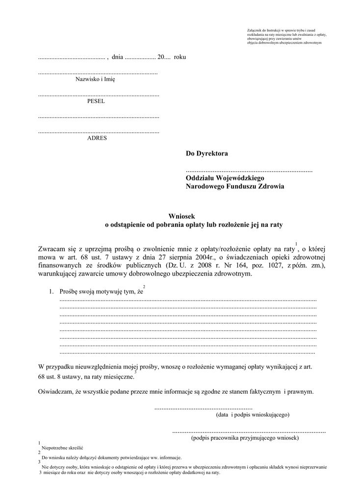 Załącznik do Instrukcji w sprawie trybu i zasad rozkładania na raty miesięczne lub zwalniania z opłaty, obowiązującej przy zawieraniu umów objęcia dobrowolnym ubezpieczeniem zdrowotnym ......................................... , dnia ................... 20.... roku ......................................................................... Nazwisko i Imię .......................................................................... PESEL .......................................................................... .......................................................................... ADRES Do Dyrektora ....................................................................... Oddziału Wojewódzkiego Narodowego Funduszu Zdrowia Wniosek o odstąpienie od pobrania opłaty lub rozłożenie jej na raty 1 Zwracam się z uprzejmą prośbą o zwolnienie mnie z opłaty/rozłożenie opłaty na raty , o której mowa w art. 68 ust. 7 ustawy z dnia 27 sierpnia 2004r., o świadczeniach opieki zdrowotnej finansowanych ze środków publicznych (Dz. U. z 2008 r. Nr 164, poz. 1027, z późn. zm.), warunkującej zawarcie umowy dobrowolnego ubezpieczenia zdrowotnym. 2 1. Prośbę swoją motywuję tym, że ............................................................................................................................................................. ............................................................................................................................................................. ............................................................................................................................................................. ............................................................................................................................................................. ............................................................................................................................................................. ............................................................................................................................................................. ............................................................................................................................................................. ............................................................................................................................................................ W przypadku nieuwzględnienia mojej prośby, wnoszę o rozłożenie wymaganej opłaty wynikającej z art. 68 ust. 8 ustawy, na raty miesięczne. 3 Oświadczam, że wszystkie podane przeze mnie informacje są zgodne ze stanem faktycznym i prawnym. ....................................................... (data i podpis wnioskującego) ...................................................................................... 1 2 3 (podpis pracownika przyjmującego wniosek) Niepotrzebne skreślić Do wniosku należy dołączyć dokumenty potwierdzające ww. informacje. Nie dotyczy osoby, która wnioskuje o odstąpienie od opłaty i której przerwa w ubezpieczeniu zdrowotnym i opłacaniu składek wynosi nieprzerwanie 3 miesiące do roku oraz nie dotyczy osoby wnoszącej o rozłożenie opłaty dodatkowej na raty. Wzór odpowiedzi oceny wniosku ubiegającego się o zwolnienie z opłaty lub rozłożenia jej na raty Do wniosku Pani/Pana ..................................................................................................................................................... Nr PESEL ......................................................................................................................................... zamieszkałej/go.................................................................................................................................. ........................................................................................................................................................... ........................................................................................................................................................... Działając w trybie art. 68 ust. 11 ustawy z dnia 27 sierpnia 2004r. o świadczeniach opieki zdrowotnej finansowanych ze środków publicznych (Dz. U. z 2008 r. Nr 164, poz. 1027, z późn. zm.), wyrażam zgodę na: 1) odstąpienie od pobrania opłaty związanej z zawarciem umowy dobrowolnego ubezpieczenia* 2) wniesienie opłaty w wysokości ………………………………………..……….................... następującej w ………………………… ratach miesięcznych, w tym pierwsza rata w wysokości ……………………………. płatna przed podpisaniem umowy, każda następna rata w wysokości ……………………………. płatna do ............…dnia każdego miesiąca* ............................................................................. miejscowość, data * niepotrzebnie skreślić ….……………………………………………….. Dyrektor Oddziału Wojewódzkiego NFZ