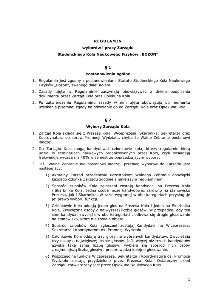 RE G UL A MI N wyborów i pracy Zarządu Studenckiego Koła Naukowego Fizyków „BOZON” §1 Postanowienia ogólne 1. Regulamin jest zgodny z postanowieniami Statutu Studenckiego Koła Naukowego Fizyków „Bozon”, zwanego dalej Kołem. 2. Zasady ujęte w Regulaminie zaczynają obowiązywać dokumentu przez Zarząd Koła oraz Opiekuna Koła. z dniem podpisania 3. Po zatwierdzeniu Regulaminu zasady w nim ujęte obowiązują do momentu uzyskania pisemnej zgody na odwołanie go od Zarządu Koła oraz Opiekuna Koła. §2 Wybory Zarządu Koła 1. Zarząd Koła składa się z Prezesa Koła, Wiceprezesa, Skarbnika, Sekretarza oraz Koordynatora do spraw Promocji Wydziału, chyba że Walne Zebranie postanowi inaczej. 2. Do Zarządu Koła mogą kandydować członkowie koła, którzy regularnie biorą udział w seminariach naukowych organizowanych przez Koło, czyli posiadają frekwencję wyższą niż 40% w semestrze poprzedzającym wybory. 3. Jeśli Walne Zebranie nie postanowi inaczej, przebieg wyborów do Zarządu jest następujący: 1) Aktualny Zarząd przedstawia uczestnikom Walnego Zebrania obowiązki każdego członka Zarządu zgodnie z niniejszym regulaminem. 2) Spośród członków Koła zgłoszeni zostają kandydaci na Prezesa Koła i Skarbnika Koła. Jedna osoba może kandydować zarówno na stanowisko Prezesa, jak i Skarbnika. W razie wygranej w obu kategoriach przysługuje jej prawo wyboru funkcji. 3) Członkowie Koła oddają jeden głos na Prezesa Koła i jeden na Skarbnika Koła. Zwyciężają osoby o najwyższej liczbie głosów. W przypadku, gdy ten sam kandydat zwycięża w obu kategoriach, odbywa się drugie głosowanie na stanowisko, które nie zostało objęte. 4) Spośród członków Koła zgłoszeni zostają Kandydaci na Wiceprezesa, Sekretarza i Koordynatora ds. Promocji Wydziału. 5) Członkowie Koła oddają trzy głosy na wybranych kandydatów. Zwyciężają trzy osoby o największej liczbie głosów. Jeśli więcej niż trzech kandydatów uzyska taką samą liczbę głosów, wybiera się spośród nich osoby z najmniejszą liczbą głosów i przeprowadza kolejne głosowanie. 6) Poszczególne funkcje Wiceprezesa, Sekretarza i Koordynatora ds. Promocji Wydziału zostają przydzielone przez Prezesa Koła. Ostateczny skład Zarządu zatwierdzany jest przez Opiekuna Naukowego Koła. 1 7) Wybór Zarządu jest ważny, gdy zgłosi się co najmniej trzech kandydatów. Jeśli zgłosi się mniej niż pięciu kandydatów, pozostali Członkowie Zarządu zostają wybrani w trakcie kolejnego Walnego Zebrania. Do tego czasu funkcje pomocniczo-doradcze pełnią wybrani członkowie starego Zarządu, o ile otrzymali absolutorium. §3 Prawa i obowiązki Zarządu Koła 1. Zarząd pracuje kolegialnie na posiedzeniach zwoływanych przynajmniej raz na miesiąc. 2. Decyzje Zarządu, w formie uchwał, zapadają zwykłą większością głosów, przy obecności przynajmniej połowy liczby członków Zarządu, w tym Prezesa lub Wiceprezesa. 3. Do podpisywania pism w imieniu Zarządu uprawnionych jest dwóch członków Zarządu działających łącznie, w tym Prezes lub Wiceprezes. 4. Zarząd podejmuje ponadto wszelkie zastrzeżone dla innych organów Koła. 5. Decyzje Zarządu Koła uwiarygodnia dokumentów własnym podpisem. decyzje, Opiekun które Koła nie zostały poprzez wyraźnie sygnowanie 6. Zarząd Koła składa Opiekunowi Koła comiesięczne raporty z działalności koła, w tym sprawozdania budżetowe. §4 Zadania Zarządu Koła 1. Do głównych zadań Prezesa Zarządu należy: 1) Przygotowanie planu działalności Koła na bieżący rok akademicki; 2) Koordynacja działalności naukowej Koła; 3) Koordynacja składania wniosków o Granty Rektorskie; 4) Koordynacja realizacji Grantu Rektorskiego, o ile został przyznany w roku urzędowania Prezesa Zarządu; 5) Zatwierdzenie programu budżetowego Koła na bieżący rok akademicki oraz późniejsza kontrola budżetu Koła; 6) Prowadzenie spotkań Koła; 7) Organizacja Studenckiej Konferencji Koordynatora Sekcji Fizyki; Kół Naukowych pod kierunkiem 8) Wystawianie zwolnień z zajęć dydaktycznych dla członków Koła w przypadku nieobecności spowodowanej przez wydarzenia związane z działalnością Koła. 2. Do głównych zadań Wiceprezesa Zarządu należy: 1) Przygotowanie sprawozdania z działalności Koła w poprzednim roku akademickim; 2) Koordynacja akademicki; harmonogramu seminariów naukowych na bieżący rok 3) Koordynacja realizacji Grantu Rektorskiego, o ile dwa Granty Rektorskie zostały przyznane w roku urzędowania Wiceprezesa Zarządu; 4) Koordynacja udziału członków Koła w konferencjach naukowych; 2 5) Organizacja wyjazdu naukowo-integracyjnego oraz obozu naukowego, o ile Zarząd Koła nie postanowi inaczej; 6) Kontrola wyposażenia Koła. 3. Do głównych zadań Skarbnika Zarządu należy: 1) Regularne rozliczanie i prowadzenie zestawienia wydatków ponoszonych przez Koło; 2) Przygotowywanie oraz składanie preliminarzy wydatków ponoszonych przez Koło; 3) Kontrola finansowa realizacji Grantów Rektorskich; 4) Zbieranie opłat rekrutacyjnych; 5) Sporządzanie sprawozdania z budżetu Koła w danym roku kalendarzowym. 4. Do głównych zadań Sekretarza Zarządu należy: 1) Prowadzenie strony internetowej Koła; 2) Kontrola korespondencji Koła, w tym poczty e-mailowej oraz grupy dyskusyjnej; 3) Ogłaszanie informacji o spotkaniach i Walnych Zebraniach Koła; 4) Przygotowanie zestawienia frekwencji w danym semestrze. 5. Do głównych zadań Koordynatora ds. Promocji Wydziału należy: 1) Koordynacja działań grupy pokazowej Koła; 2) Kontrola stanu technicznego i używanego przy pokazach; właściwego użytkowania wyposażenia 3) Dbanie o zachowanie norm bezpieczeństwa podczas prowadzenia pokazów; 4) Prowadzenie tablicy informacyjnej Koła; 5) Kontrola użytkowania materiałów promocyjnych Koła; 6) Koordynacja organizacji Wydziałowej Wigilii Kół Naukowych. 3