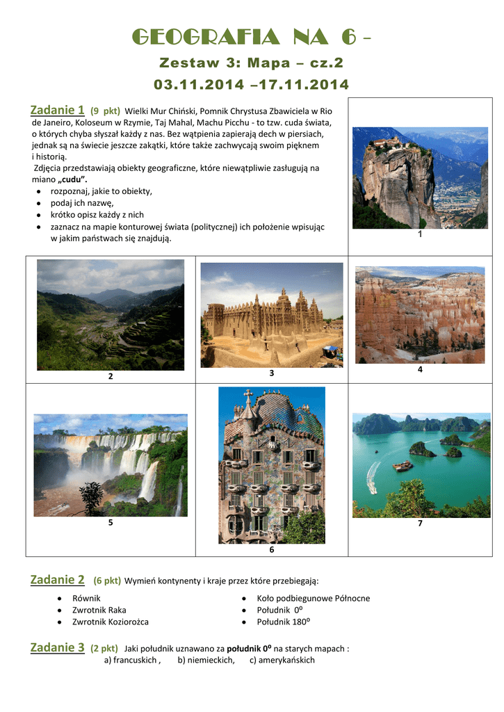 GEOGRAFIA NA 6 Zestaw 3: Mapa – cz.2 03.11.2014 –17.11.2014 Zadanie 1 (9 pkt) Wielki Mur Chiński, Pomnik Chrystusa Zbawiciela w Rio de Janeiro, Koloseum w Rzymie, Taj Mahal, Machu Picchu - to tzw. cuda świata, o których chyba słyszał każdy z nas. Bez wątpienia zapierają dech w piersiach, jednak są na świecie jeszcze zakątki, które także zachwycają swoim pięknem i historią. Zdjęcia przedstawiają obiekty geograficzne, które niewątpliwie zasługują na miano „cudu”. rozpoznaj, jakie to obiekty, podaj ich nazwę, krótko opisz każdy z nich zaznacz na mapie konturowej świata (politycznej) ich położenie wpisując w jakim państwach się znajdują. 3 2 5 (6 pkt) Wymień kontynenty i kraje przez które przebiegają: Równik Zwrotnik Raka Zwrotnik Koziorożca Zadanie 3 Koło podbiegunowe Północne Południk 0⁰ Południk 180⁰ (2 pkt) Jaki południk uznawano za południk 0⁰ na starych mapach : a) francuskich , 4 7 6 Zadanie 2 1 b) niemieckich, c) amerykańskich Zadanie 4 (2 pkt) Chcesz pojechać kajakiem z Rzeszowa do Szczecina. Podaj nazwy rzek i kanałów, którymi popłyniesz. Zadanie 5 (3 pkt) Odległość na mapie między Amsterdamem (52⁰14’N , 4⁰45’E) a Lyonem (45⁰45’N, 4⁰45’E) wynosi 14,5 cm. Oblicz odległość między tymi miastami w rzeczywistości oraz skalę mapy. PAMIĘTAJ, że 1’ mierzona po południku to 1852 metry. Opisz tok swojego rozumowania. Zadanie 6 (6 pkt) Jaką odległość w kilometrach i milach morskich pokona statek płynący: Przez Ocean Spokojny po równiku od wybrzeży Ameryki Południowej na wschodzie do Archipelagu Moluków ( Azja) na zachodzie (3 pkt) Przez Ocean Atlantycki po południku 20⁰W od wybrzeży Antarktydy na południu po wybrzeża Islandii na północy (3pkt) Zapisuj wszystkie obliczenia Zadanie 7 (8 pkt) Na podstawie mapy poziomicowej przedstawiającej okolice Góry Krzyżowej wykonaj polecenia: Określ cięcie poziomicowe (1pkt) Na kartce w kratkę narysuj profil topograficzny terenu wzdłuż zaznaczonej linii profilu AB, przyjmując skalę pionową 1 cm – 50 metrów (3 pkt) Oblicz odległość rzeczywistą ( w linii prostej) między szczytem Góry Krzyżowej a Doliną Czarnego Potoku (2 pkt) Oblicz spadek terenu wzdłuż linii CD (2 pkt) Zadanie 8 (6 pkt) Korzystając z mapy oblicz czasy przejść pieszych szlakami: zielonym (Z), czerwonym (C) i niebiskim (N) prowadzącymi z parkingu P przy szosie do schroniska na Suchej Polanie. Pomiary na mapie dokonaj z dokładnością do 0,5 cm. Czasy przejść tymi szlakami należy obliczyć według następujących reguł: Pokonanie 1 km po terenie płaskim zajmuje turyście 20 minut Wejście na każde 50 metrów wysokości zajmuje dodatkowo 10 minut Zejście nie zajmuje więcej czasu niż poruszanie się po terenie płaskim Zapisuj wszystkie obliczenia