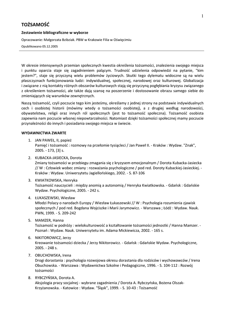 1 TOŻSAMOŚĆ Zestawienie bibliograficzne w wyborze Opracowanie: Małgorzata Bzibziak. PBW w Krakowie Filia w Oświęcimiu Opublikowano 05.12.2005 W okresie intensywnych przemian społecznych kwestia określenia tożsamości, znalezienia swojego miejsca i punktu oparcia staje się zagadnieniem palącym. Trudność udzielenia odpowiedzi na pytanie, "kim jestem?", staje się przyczyną wielu problemów życiowych. Skutki tego dylematu widoczne są na wielu płaszczyznach funkcjonowania ludzi: indywidualnej, społecznej, narodowej oraz kulturowej. Globalizacja i związane z nią kontakty różnych obszarów kulturowych stają się przyczyną pogłębiania kryzysu związanego z określeniem tożsamości, ale także dają szansę na poszerzenie i dostosowanie obrazu samego siebie do zmieniających się warunków zewnętrznych. Naszą tożsamość, czyli poczucie tego kim jesteśmy, określamy z jednej strony na podstawie indywidualnych cech i osobistej historii (mówimy wtedy o tożsamości osobistej), a z drugiej według narodowości, obywatelstwa, religii oraz innych ról społecznych (jest to tożsamość społeczna). Tożsamość osobista zapewnia nam poczucie własnej niepowtarzalności. Natomiast dzięki tożsamości społecznej mamy poczucie przynależności do innych i posiadania swojego miejsca w świecie. WYDAWNICTWA ZWARTE 1. JAN PAWEŁ, II, papież Pamięć i tożsamość : rozmowy na przełomie tysiącleci / Jan Paweł II. - Kraków : Wydaw. "Znak", 2005. - 173, [3] s. 2. KUBACKA-JASIECKA, Dorota Zmiany tożsamości w przebiegu zmagania się z kryzysem emocjonalnym / Dorota Kubacka-Jasiecka // W : Człowiek wobec zmiany : rozważania psychologiczne / pod red. Doroty Kubackiej-Jasieckiej. Kraków : Wydaw. Uniwersytetu Jagiellońskiego, 2002. - S. S7-106 3. KWIATKOWSKA, Henryka Tożsamość nauczycieli : między anomią a autonomią / Henryka Kwiatkowska. - Gdańsk : Gdańskie Wydaw. Psychologiczne, 2005. - 242 s. 4. ŁUKASZEWSKI, Wiesław Młodzi Polacy o narodach Europy / Wiesław Łukaszewski // W : Psychologia rozumienia zjawisk społecznych / pod red. Bogdana Wojciszke i Marii Jarymowicz. - Warszawa ; Łódź : Wydaw. Nauk. PWN, 1PPP. - S. 20P-242 5. MAMZER, Hanna Tożsamość w podróży : wielokulturowość a kształtowanie tożsamości jednostki / Hanna Mamzer. Poznań : Wydaw. Nauk. Uniwersytetu im. Adama Mickiewicza, 2002. - 165 s. 6. NIKITOROWICZ, Jerzy Kreowanie tożsamości dziecka / Jerzy Nikitorowicz. - Gdańsk : Gdańskie Wydaw. Psychologiczne, 2005. - 24S s. 7. OBUCHOWSKA, Irena Drogi dorastania : psychologia rozwojowa okresu dorastania dla rodziców i wychowawców / Irena Obuchowska. - Warszawa : Wydawnictwa Szkolne i Pedagogiczne, 1PP6. - S. 104-112 : Rozwój tożsamości S. RRBCZRYSKA, Dorota A. Aksjologia pracy socjalnej - wybrane zagadnienia / Dorota A. Rybczyńska, Bożena OlszakKrzyżanowska. - Katowice : Wydaw. "Śląsk", 1PPP. - S. 10-43 : Tożsamość 2 P. SOBECKI, Mirosław Wielowymiarowa tożsamość kulturowa a egzystencja człowieka w kontekście edukacji międzykulturowej / Mirosław Sobecki // W : Edukacja międzykulturowa w Polsce na przełomie XX i XXI wieku : praca zbiorowa / pod red. Artura Paszko. - Kraków : Woj. Biblioteka Publiczna, 2004. - S. 33-40 10. TOŻSAMOŚT oraz dylematy pedagogiki opiekuńczej / red. Andrzej Olubiński. - Toruń : Wydaw. Edukacyjne "Akapit", 2001. - 256 s. 11. TOŻSAMOŚT osobowa a tożsamości społeczne : wyzwania dla edukacji XXI wieku / red. Tomasz Bajkowski i Krzysztof Sawicki ; Wydział Pedagogiki i Psychologii Uniwersytetu w Białymstoku, Wydział Pedagogiczny Wszechnicy Mazurskiej w Olecku. - Białystok : "Trans Humana", 2001. - 24S s. 12. TOŻSAMOŚT człowieka / red. Anna Gałdowa. - Kraków : Wydaw. Uniwersytetu Jagiellońskiego, 2000. - 271 s. 13. WOKWŁ problemów tożsamości / red. Aldona Jawłowska ; Uniwersytet Warszawski. Instytut Stosowanych Nauk Społecznych. - Warszawa : Wydaw. LTW, 2001. - 310 s. ARTYKUŁY Z CZASOPISM 14. AUTORRTET a tożsamość / Izabela Krasiejko // Problemy Opiekuńczo-Wychowawcze. - 1PPP, nr 5, (wkładka) s. 13-15 15. BUDOWANIE tożsamości w warunkach powszechnego kłamstwa / Wanda Woronowicz // Edukacja. - 2005, nr 2, s. 57-62 16. DRSKUSJA wokół tożsamości płciowej - między naturą a kulturą / Mariola Bieńko // Problemy Opiekuńczo-Wychowawcze. - 2004, nr 10, s. 12-16 17. JAK się kształtuje tożsamość mężczyzny / Łukasz Baka // Małżeństwo i Rodzina. - 2002, nr 1, s. 3-12 1S. JĘZRK kształtuje tożsamość / Krystyna Abraham // Edukacja i Dialog. - 2004, nr 7, s. 34-36 1P. KU tożsamości międzykulturowej/ Jerzy Nikitorowicz // Życie Szkoły. - 2004, nr 5, s. S-14 20. KRRZRS tożsamości a kryzys poczucia tożsamości w kontekście zmiany społecznej / Tomasz Leszniewski // Kultura i Edukacja. - 2004, nr 2, s. 7-30 21. KRRZRS tożsamości w postmodernizmie / Sebastian Dąbrowski // Edukacja i Dialog. - 2000, nr 10, s. 36-3P 22. KSZTAŁTOWANIE tożsamości / Ewa Karacka // Edukacja i Dialog. - 2004, nr 10, s. 15-1S 23. LEGENDA jako źródło tożsamości kulturowej : program zajęć dodatkowych z grupą dzieci z klas I-III / Jolanta Gliwa, Katarzyna Kwaśnicka // Biblioteka w Szkole. - 2003, nr 3, s. 6-S 24. NADRZĘDNA potrzeba tożsamości / Magdalena Badziąg // Edukacja i Dialog. - 2000, nr 10, s. 17-20 25. NEGATRWNA tożsamość... nie jest zła / Agnieszka Dyrda-Jaworska // Edukacja i Dialog. - 2005, nr 6, s. 45-4S 26. O DZIEDZICTWIE przeszłości i tożsamości kulturowej / Paweł Prusak // Wychowanie na co Dzień.2004, nr 7/S, s. 16-1P 27. O SWOJE miejsce pod słońcem / Arleta Zysko // Edukacja i Dialog. - 2004, nr 3, s. 14-1S 2S. POCZUCIE tożsamości studentów I roku uczelni zielonogórskiej i wrocławskich / Bożena OlszakKrzyżanowska // Edukacja. - 2003, nr 4, s. 60-76 2P. POCZUCIE tożsamości zawodowej nauczycieli / Bożena Olszak-Krzyżanowska // Nauczyciel i Szkoła. 1PPP, nr 1, s. 17-30 30. POLITRKA tożsamości a epifanie kształce