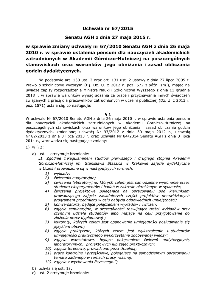 Uchwała nr 67/2015 Senatu AGH z dnia 27 maja 2015 r. w sprawie zmiany uchwały nr 67/2010 Senatu AGH z dnia 26 maja 2010 r. w sprawie ustalenia pensum dla nauczycieli akademickich zatrudnionych w Akademii Górniczo-Hutniczej na poszczególnych stanowiskach oraz warunków jego obniżania i zasad obliczania godzin dydaktycznych. Na podstawie art. 130 ust. 2 oraz art. 131 ust. 2 ustawy z dnia 27 lipca 2005 r. Prawo o szkolnictwie wyższym (t.j. Dz. U. z 2012 r. poz. 572 z późn. zm.), mając na uwadze zapisy rozporządzenia Ministra Nauki i Szkolnictwa Wyższego z dnia 11 grudnia 2013 r. w sprawie warunków wynagradzania za pracę i przyznawania innych świadczeń związanych z pracą dla pracowników zatrudnionych w uczelni publicznej (Dz. U. z 2013 r. poz. 1571) ustala się, co następuje: §1 W uchwale Nr 67/2010 Senatu AGH z dnia 26 maja 2010 r. w sprawie ustalenia pensum dla nauczycieli akademickich zatrudnionych w Akademii Górniczo-Hutniczej na poszczególnych stanowiskach oraz warunków jego obniżania i zasad obliczania godzin dydaktycznych, zmienionej uchwałą Nr 93/2012 z dnia 30 maja 2012 r., uchwałą Nr 82/2013 z dnia 3 lipca 2013 r. oraz uchwałą Nr 84/2014 Senatu AGH z dnia 3 lipca 2014 r., wprowadza się następujące zmiany: 1) w § 2: a) ust. 1 otrzymuje brzmienie: „1. Zgodnie z Regulaminem studiów pierwszego i drugiego stopnia Akademii Górniczo-Hutniczej im. Stanisława Staszica w Krakowie zajęcia dydaktyczne w Uczelni prowadzone są w następujących formach: 1) wykłady; 2) ćwiczenia audytoryjne; 3) ćwiczenia laboratoryjne, których celem jest samodzielne wykonanie przez studenta eksperymentów i badań w zakresie określonym w sylabusie; 4) ćwiczenia projektowe polegające na opracowaniu pod kierunkiem prowadzącego zajęcia zasadniczych części projektów przewidzianych programem przedmiotu w celu nabycia odpowiednich umiejętności; 5) konwersatoria, będące połączeniem wykładów i ćwiczeń; 6) zajęcia seminaryjne, w szczególności rozwijające treści wykładów przy czynnym udziale studentów albo mające na celu przygotowanie do złożenia pracy dyplomowej ; 7) lektoraty, których celem jest opanowanie umiejętności posługiwania się językiem obcym; 8) zajęcia praktyczne, których celem jest wykształcenie u studentów umiejętności praktycznego wykorzystania zdobywanej wiedzy; 9) zajęcia warsztatowe, będące połączeniem ćwiczeń audytoryjnych, laboratoryjnych, projektowych lub zajęć praktycznych; 10) zajęcia terenowe, prowadzone poza Uczelnią; 11) prace kontrolne i przejściowe, polegające na samodzielnym opracowaniu tematu zadanego w ramach pracy własnej; 12) zajęcia z wychowania fizycznego.”; b) uchyla się ust. 1a; c) ust. 2 otrzymuje brzmienie: „2. Dopuszcza się także możliwość prowadzenia zajęć konsultacyjnych w ramach przedmiotu, które polegają na udzielaniu przez prowadzącego zajęcia wyjaśnień, informacji i wskazówek w zakresie problemów zgłaszanych przez studentów i związanych z treścią zajęć dydaktycznych.”; d) ust. 4 otrzymuje brzmienie: „4. Pracownicy naukowo-dydaktyczni i dydaktyczni zatrudniani na podanych niżej stanowiskach mogą realizować następujące formy dydaktyczne: 1) profesor zwyczajny, profesor nadzwyczajny (z tytułem profesora lub ze stopniem doktora habilitowanego), profesor wizytujący, adiunkt (ze stopniem doktora habilitowanego) – zajęcia, o których mowa w ust. 1 pkt 1-11; 2) adiunkt (ze stopniem doktora), starszy wykładowca, wykładowca – zajęcia, o których mowa w ust. 1 pkt 2-12, chyba że dziekan wydziału powierzy prowadzenie wykładu tym pracownikom po zasięgnięciu opinii rady wydziału; 3) asystent (ze stopniem doktora lub tytułem zawodowym magistra lub równoważnym), lektor, instruktor – zajęcia, o których mowa w ust. 1 pkt 2-12.”; e) ust. 5 otrzymuje brzmienie: „5. Prace dyplomowe są prowadzone przez uprawnionego nauczyciela akademickiego (opiekuna pracy): profesora lub doktora habilitowanego dla prac dyplomowych magisterskich oraz profesora, doktora habilitowanego i doktora dla prac dyplomowych inżynierskich i licencjackich. Dziekan Wydziału po zasięgnięciu opinii Rady Wydziału może upoważnić doktora do kierowania pracą dyplomową magisterską, a specjalistę spoza Uczelni – do kierowania pracą dyplomową inżynierską, licencjacką lub magisterską”; 2) w § 3 w ust. 1 tabela otrzymuje brzmienie: rodzaj zajęć maksymalna liczba studentów w grupie Ćwiczenia audytoryjne 30 osób Ćwiczenia laboratoryjne 15 osób Ćwiczenia projektowe 30 osób Konwersatoria 30 osób Zajęcia seminaryjne 30 osób Lektoraty 20 osób Zajęcia warsztatowe 30 osób Zajęcia terenowe 30 osób Zajęcia z wychowania fizycznego 30 osób / grupa w sali 15 osób / grupa na pływalni 3) w § 4 w ust. 4 tabela otrzymuje brzmienie: stanowisko pracownicy naukowo-dydaktyczni z tytułem naukowym profesora zatrudnieni na stanowisku profesora zwyczajnego lub profesora nadzwyczajnego pracownicy naukowo-dydaktyczni ze stopniem naukowym doktora habilitowanego zatrudnieni na stanowiskach profesora nadzwyczajnego, adiunkta pracownicy naukowo-dydaktyczni zatrudnieni na stanowiskach adiunkta, asystenta pracownicy dydaktyczni zatrudnieni na stanowiskach wykładowców i starszych wykładowców pracownicy dydaktyczni zatrudnieni na stanowiskach lektorów i instruktorów wymiar pensum w danym roku akademickim 182 godz. 196 godz. 224 godz. 336 godz. 504 godz. 4) w § 5: a) w ust. 1 tabela otrzymuje brzmienie: funkcja Rektor Prorektor Dziekan Wydziału oraz Dyrektor innej niż wydział podstawowej jednostki organizacyjnej Prodziekan Wydziału oraz Dyrektor (Kierownik) jednostki pozawydziałowej Zastępca Dyrektora (Kierownika) jednostki pozawydziałowej wymiar obniżki 140 godz. 98 godz. 84 godz. 56 godz. 42 godz. Kierownik Katedry 28 godz. Pełnomocnik Rektora ds. Jakości Kształcenia 42 godz. Członkowie Uczelnianego Zespołu Audytu Dydaktycznego 56 godz. Pełnomoc