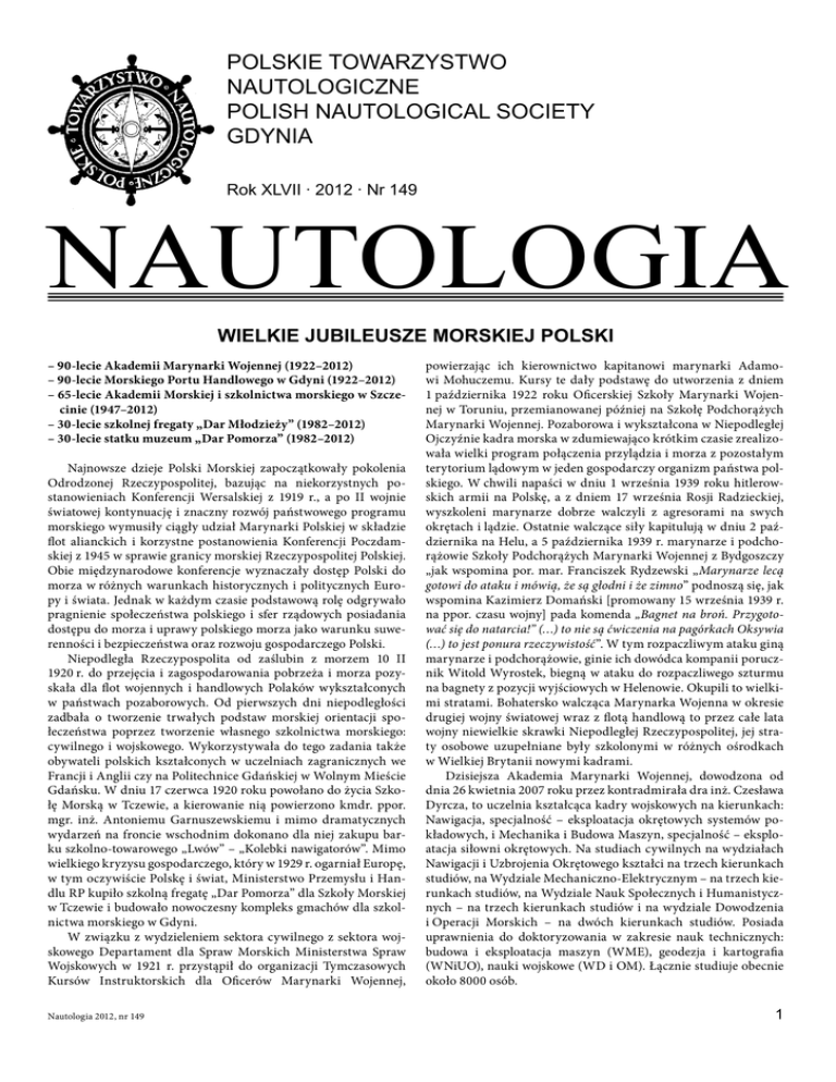 POLSKIE TOWARZYSTWO NAUTOLOGICZNE POLISH NAUTOLOGICAL SOCIETY GDYNIA Rok XLVII · 2012 · Nr 149 NAUTOLOGIA WIELKIE JUBILEUSZE MORSKIEJ POLSKI – 90-lecie Akademii Marynarki Wojennej (1922–2012) – 90-lecie Morskiego Portu Handlowego w Gdyni (1922–2012) – 65-lecie Akademii Morskiej i szkolnictwa morskiego w Szczecinie (1947–2012) – 30-lecie szkolnej fregaty „Dar Młodzieży” (1982–2012) – 30-lecie statku muzeum „Dar Pomorza” (1982–2012) Najnowsze dzieje Polski Morskiej zapoczątkowały pokolenia Odrodzonej Rzeczypospolitej, bazując na niekorzystnych postanowieniach Konferencji Wersalskiej z 1919 r., a po II wojnie światowej kontynuację i znaczny rozwój państwowego programu morskiego wymusiły ciągły udział Marynarki Polskiej w składzie flot alianckich i korzystne postanowienia Konferencji Poczdamskiej z 1945 w sprawie granicy morskiej Rzeczypospolitej Polskiej. Obie międzynarodowe konferencje wyznaczały dostęp Polski do morza w różnych warunkach historycznych i politycznych Europy i świata. Jednak w każdym czasie podstawową rolę odgrywało pragnienie społeczeństwa polskiego i sfer rządowych posiadania dostępu do morza i uprawy polskiego morza jako warunku suwerenności i bezpieczeństwa oraz rozwoju gospodarczego Polski. Niepodległa Rzeczypospolita od zaślubin z morzem 10 II 1920 r. do przejęcia i zagospodarowania pobrzeża i morza pozyskała dla flot wojennych i handlowych Polaków wykształconych w państwach pozaborowych. Od pierwszych dni niepodległości zadbała o tworzenie trwałych podstaw morskiej orientacji społeczeństwa poprzez tworzenie własnego szkolnictwa morskiego: cywilnego i wojskowego. Wykorzystywała do tego zadania także obywateli polskich kształconych w uczelniach zagranicznych we Francji i Anglii czy na Politechnice Gdańskiej w Wolnym Mieście Gdańsku. W dniu 17 czerwca 1920 roku powołano do życia Szkołę Morską w Tczewie, a kierowanie nią powierzono kmdr. ppor. mgr. inż. Antoniemu Garnuszewskiemu i mimo dramatycznych wydarzeń na froncie wschodnim dokonano dla niej zakupu barku szkolno-towarowego „Lwów” – „Kolebki nawigatorów”. Mimo wielkiego kryzysu gospodarczego, który w 1929 r. ogarniał Europę, w tym oczywiście Polskę i świat, Ministerstwo Przemysłu i Handlu RP kupiło szkolną fregatę „Dar Pomorza” dla Szkoły Morskiej w Tczewie i budowało nowoczesny kompleks gmachów dla szkolnictwa morskiego w Gdyni. W związku z wydzieleniem sektora cywilnego z sektora wojskowego Departament dla Spraw Morskich Ministerstwa Spraw Wojskowych w 1921 r. przystąpił do organizacji Tymczasowych Kursów Instruktorskich dla Oficerów Marynarki Wojennej, Nautologia 2012, nr 149 powierzając ich kierownictwo kapitanowi marynarki Adamowi Mohuczemu. Kursy te dały podstawę do utworzenia z dniem 1 października 1922 roku Oficerskiej Szkoły Marynarki Wojennej w Toruniu, przemianowanej później na Szkołę Podchorążych Marynarki Wojennej. Pozaborowa i wykształcona w Niepodległej Ojczyźnie kadra morska w zdumiewająco krótkim czasie zrealizowała wielki program połączenia przylądzia i morza z pozostałym terytorium lądowym w jeden gospodarczy organizm państwa polskiego. W chwili napaści w dniu 1 września 1939 roku hitlerowskich armii na Polskę, a z dniem 17 września Rosji Radzieckiej, wyszkoleni marynarze dobrze walczyli z agresorami na swych okrętach i lądzie. Ostatnie walczące siły kapitulują w dniu 2 października na Helu, a 5 października 1939 r. marynarze i podchorążowie Szkoły Podchorążych Marynarki Wojennej z Bydgoszczy „jak wspomina por. mar. Franciszek Rydzewski „Marynarze lecą gotowi do ataku i mówią, że są głodni i że zimno” podnoszą się, jak wspomina Kazimierz Domański [promowany 15 września 1939 r. na ppor. czasu wojny] pada komenda „Bagnet na broń. Przygotować się do natarcia!” (…) to nie są ćwiczenia na pagórkach Oksywia (…) to jest ponura rzeczywistość”. W tym rozpaczliwym ataku giną marynarze i podchorążowie, ginie ich dowódca kompanii porucznik Witold Wyrostek, biegną w ataku do rozpaczliwego szturmu na bagnety z pozycji wyjściowych w Helenowie. Okupili to wielkimi stratami. Bohatersko walcząca Marynarka Wojenna w okresie drugiej wojny światowej wraz z flotą handlową to przez całe lata wojny niewielkie skrawki Niepodległej Rzeczypospolitej, jej straty osobowe uzupełniane były szkolonymi w różnych ośrodkach w Wielkiej Brytanii nowymi kadrami. Dzisiejsza Akademia Marynarki Wojennej, dowodzona od dnia 26 kwietnia 2007 roku przez kontradmirała dra inż. Czesława Dyrcza, to uczelnia kształcąca kadry wojskowych na kierunkach: Nawigacja, specjalność – eksploatacja okrętowych systemów pokładowych, i Mechanika i Budowa Maszyn, specjalność – eksploatacja siłowni okrętowych. Na studiach cywilnych na wydziałach Nawigacji i Uzbrojenia Okrętowego kształci na trzech kierunkach studiów, na Wydziale Mechaniczno-Elektrycznym – na trzech kierunkach studiów, na Wydziale Nauk Społecznych i Humanistycznych – na trzech kierunkach studiów i na wydziale Dowodzenia i Operacji Morskich – na dwóch kierunkach studiów. Posiada uprawnienia do doktoryzowania w zakresie nauk technicznych: budowa i eksploatacja maszyn (WME), geodezja i kartografia (WNiUO), nauki wojskowe (WD i OM). Łącznie studiuje obecnie około 8000 osób. Pod patronatem Polskiego Towarzystwa Nautologicznego, Dowódcy Marynarki Wojennej Rzeczypospolitej admirała floty Tomasza Mathei i Rektora-Komendanta Akademii Marynarki Wojennej im. Bohaterów Westerplatte kontradmirała dra inż. Czesława Dyrcza, mając na uwadze uhonorowanie jubileuszu 90-lecia Akademii Marynarki Wojennej i ponad 1400 oficerów oraz prawie 4750 szeregowych wydano wspólną edycją dzieła: Kadry morskie Rzeczypospolitej, tom V, Polska Marynarka Wojenna, Dokumentacja organizacyjna i kadrowa oficerów, podoficerów i marynarzy (1918–1947), która stanowi uhonorowa
