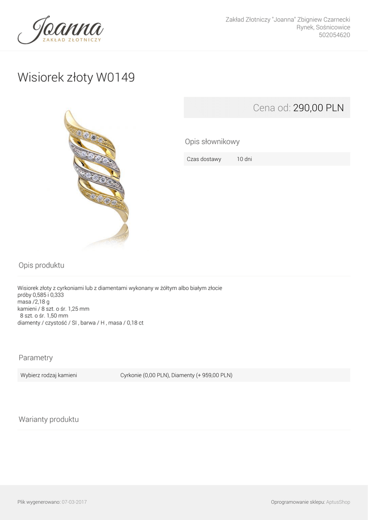 Zakład Złotniczy "Joanna" Zbigniew Czarnecki Rynek, Sośnicowice 502054620 Wisiorek złoty W0149 Cena od: 290,00 PLN Opis słownikowy Czas dostawy 10 dni Opis produktu Wisiorek złoty z cyrkoniami lub z diamentami wykonany w żółtym albo białym złocie próby 0,585 i 0,333 masa /2,18 g kamieni / 8 szt. o śr. 1,25 mm 8 szt. o śr. 1,50 mm diamenty / czystość / SI , barwa / H , masa / 0,18 ct Parametry Wybierz rodzaj kamieni Cyrkonie (0,00 PLN), Diamenty (+ 959,00 PLN) Warianty produktu Plik wygenerowano: 07-03-2017 Oprogramowanie sklepu: AptusShop Zakład Złotniczy "Joanna" Zbigniew Czarnecki Rynek, Sośnicowice 502054620 290,00 PLN Wisiorek złoty W0149/3 złoto 0,333 Wisiorek złoty z cyrkoniami lub z diamentami wykonany w żółtym albo białym złocie próby 0,585 i 0,333 469,00 PLN Wisiorek złoty W0149/1 złoto 0,585 Wisiorek złoty z cyrkoniami lub z diamentami wykonany w żółtym albo białym złocie próby 0,585 i 0,333 469,00 PLN Wisiorek złoty W0149/2 białe złoto 0,585 Wisiorek złoty z cyrkoniami lub z diamentami wykonany w żółtym albo białym złocie próby 0,585 i 0,333 Plik wygenerowano: 07-03-2017 Powered by TCPDF (www.tcpdf.org) Oprogramowanie sklepu: AptusShop