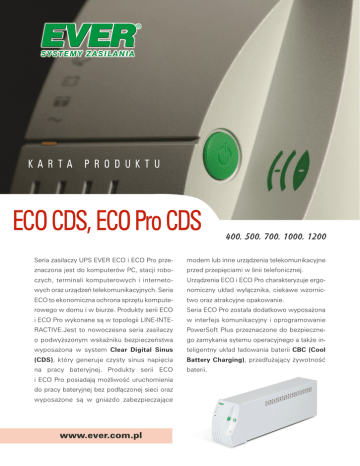 KA R TA P R O D U K T U ECO CDS, ECO Pro CDS 400, 500, 700, 1000, 1200 Seria zasilaczy UPS EVER ECO i ECO Pro prze- modem lub inne urzàdzenia telekomunikacyjne znaczona jest do komputerów PC, stacji robo- przed przepi´ciami w linii telefonicznej. czych, terminali komputerowych i interneto- Urzàdzenia ECO i ECO Pro charakteryzuje ergo- wych oraz urzàdzeƒ telekomunikacyjnych. Seria nomiczny uk∏ad wy∏àcznika, ciekawe wzornic- ECO to ekonomiczna ochrona sprz´tu kompute- two oraz atrakcyjne opakowanie. rowego w domu i w biurze. Produkty serii ECO Seria ECO Pro zosta∏a dodatkowo wyposa˝ona i ECO Pro wykonane sà w topologii LINE-INTE- w interfejs komunikacyjny i oprogramowanie RACTIVE.Jest to nowoczesna seria zasilaczy PowerSoft Plus przeznaczone do bezpieczne- o podwy˝szonym wskaêniku bezpieczeƒstwa go zamykania sytemu operacyjnego a tak˝e in- wyposa˝ona w system Clear Digital Sinus teligentny uk∏ad ∏adowania baterii CBC (Cool (CDS), który generuje czysty sinus napi´cia Battery Charging), przed∏u˝ajàcy ˝ywotnoÊç na pracy bateryjnej. Produkty serii ECO baterii. i ECO Pro posiadajà mo˝liwoÊç uruchomienia do pracy bateryjnej bez pod∏àczonej sieci oraz wyposa˝one sà w gniazdo zabezpieczajàce www.ever.com.pl ECO CDS, ECO Pro CDS 400, 500, 700, 1000, 1200 TYP ZASILACZA ECO 400 ECO Pro 400 ECO 500 ECO Pro 500 ECO 700 ECO Pro 700 ECO 1000 ECO Pro 1000 ECO 1200 ECO Pro 1200 Moc wyjÊciowa 400VA/260W 500VA/300W 700VA/420W 1000VA/ 650W 1200VA/ 780W PRACA Z SIECI Napi´cie wejÊciowe ~230V Cz´stotliwoÊç napi´cia wejÊciowego 45-55Hz Zakres napi´cia wyjÊciowego ~184V- ~264V Progi prze∏àczania: sieç - ups ~184V- ~264V Kszta∏t napi´cia wyjÊciowego Sinus Filtracja napi´cia wyjÊciowego filtr przeciwzak∏. RFI/EMI t∏umik warystorowy Czas prze∏àczenia na UPS 3ms PRACA Z AKUMULATORA Napi´cie wyjÊciowe (wartoÊç skuteczna) ~230V ±5% Kszta∏t napi´cia wyjÊciowego Sinus Progi prze∏àczania : ups - sieç ~189V- ~259V Cz´stotliwoÊç napi´cia wyjÊciowego 50Hz +/– 1Hz Filtracja napi´cia wyjÊciowego LC Zabezpieczenie przeciwzwarciowe Elektroniczne Zabezpieczenie przecià˝eniowe Elektroniczne Czas powrotu na prac´ sieciowà 0 ms Czas podtrzymania P0,8max / P0,5max 6 / 12 min 5 / 10 min 5 /12 min 5 / 8min 4,5 / 7 min Akumulator 12V -5Ah 12V - 5Ah 12V - 7Ah 2 x 12V - 5Ah 2 x 12V - 5Ah 4h 5h 5h 5h Czas ∏adowania 4h Wymiary Masa 350x90x150mm 6,3 kg 434x90x147mm 6,3 kg 7,2 kg 10 kg 10 kg WYPOSA˚ENIE IloÊç gniazd wyjÊciowych 2 Typ gniazd wyjÊciowych standard polski z ko∏kiem zerujàcym Sygnalizacja ECO - akustyczno- optyczna jednodiodowa; ECO Pro - akustyczno -optyczna czterodiodowa Bezpiecznik 5A 5A Filtr telekomunikacyjny + + Interfejs komunikacyjny (USB) 8A 8A + + + Seria ECO - nie posiada Seria ECO Pro - posiada Uwaga: Producent zastrzega sobie prawo do zmiany w/w parametrów bez uprzedniego powiadomienia. EVER Sp. z o.o., ul. Grudziƒskiego 30, 62-020 Swarz´dz, tel. (061) 65 00 400, Fax (061) 65 10 927, e-mail: [email protected] 5A