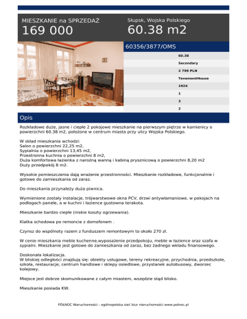 MIESZKANIE na SPRZEDAŻ 169 000 Słupsk, Wojska Polskiego 60.38 m2 60356/3877/OMS 60.38 Secondary 2 799 PLN TenementHouse 1924 1 3 2 Opis Rozkładowe duże, jasne i ciepłe 2 pokojowe mieszkanie na pierwszym piętrze w kamienicy o powierzchni 60.38 m2, położone w centrum miasta przy ulicy Wojska Polskiego. W skład mieszkania wchodzi: Salon o powierzchni 22,25 m2, Sypialnia o powierzchni 13,45 m2, Przestronna kuchnia o powierzchni 8 m2, Duża komfortowa łazienka z narożną wanną i kabiną prysznicową o powierzchni 8,20 m2 Duży przedpokój 8 m2. Wysokie pomieszczenia dają wrażenie przestronności. Mieszkanie rozkładowe, funkcjonalnie i gotowe do zamieszkania od zaraz. Do mieszkania przynależy duża piwnica. Wymienione zostały instalacje, trójwarstwowe okna PCV, drzwi antywłamaniowe, w pokojach na podłogach panele, a w kuchni i łazience gustowna terakota. Mieszkanie bardzo ciepłe (niskie koszty ogrzewania). Klatka schodowa po remoncie z domofonem . Czynsz do wspólnoty razem z funduszem remontowym to około 270 zł. W cenie mieszkania meble kuchenne,wyposażenie przedpokoju, meble w łazience oraz szafa w sypialni. Mieszkanie jest gotowe do zamieszkania od zaraz, bez żadnego wkładu finansowego. Doskonała lokalizacja. W bliskiej odległości znajdują się: obiekty usługowe, tereny rekreacyjne, przychodnia, przedszkole, szkoła, restauracje, centrum handlowe i sklepy osiedlowe, przystanek autobusowy, dworzec kolejowy. Miejsce jest dobrze skomunikowane z całym miastem, wszędzie stąd blisko. Mieszkanie posiada KW. PÓŁNOC Nieruchomości - ogólnopolska sieć biur nieruchomości www.polnoc.pl Kontakt telefoniczny 534-038-960 Profesjonalna obsługa, jesteśmy z Państwem od początku do zakończenia transakcji, przygotowujemy umowę przedwstępną, zapewniamy obsługę notarialną, pomagamy w uzyskaniu kredytu bankowego na zakup nieruchomości. Więcej ofert znajdziesz na naszej stronie www.polnoc.pl * UWAGA! Zamieszczone na naszych stronach oferty nie stanowią oferty w rozumieniu Kodeksu Cywilnego, a dane w nich zawarte mają jedynie charakter informacyjny. Dariusz Elwert tel. 534-038-960 email: [email protected] PÓŁNOC Nieruchomości - ogólnopolska sieć biur nieruchomości www.polnoc.pl Powered by TCPDF (www.tcpdf.org)