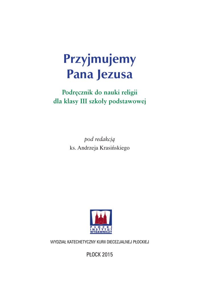 Przyjmujemy Pana Jezusa Podręcznik do nauki religii dla klasy III szkoły podstawowej pod redakcją ks. Andrzeja Krasińskiego WYDZIAŁ KATECHETYCZNY KURII DIECEZJALNEJ PŁOCKIEJ PŁOCK 2015 Podręcznik nr AZ-13-01/10-PL-3/14 do nauczania religii rzymskokatolickiej na terenie całej Polski, z zachowaniem praw biskupów diecezjalnych, przeznaczony dla klasy III szkoły podstawowej, zgodny z programem nauczania nr AZ-1-01/10 Recenzenci: dr hab. Beata Bilicka, ks. prof. dr hab. Stanisław Łabendowicz Zespół redakcyjny: ks. dr Andrzej Krasiński, ks. dr Marek Wilczewski, ks. dr Rafał Bednarczyk, s. mgr Dominika Dudzik CSP Autorzy katechez: mgr Zofia Hołubicka, mgr Zuzanna Jarosik, mgr Grażyna Kowalska, ks. dr Andrzej Krasiński, mgr Eliza Łoniewska, mgr Elżbieta Marciniak, mgr Marzena Sadowska, mgr Beata Sieklucka, mgr Barbara Stańczak, mgr Aldona Tłusty, ks. dr Marek Wilczewski Rysunki: Kazimierz Wasilewski Zdjęcia: ks. mgr Sławomir Buńkowski Nihil obstat ks. prof. dr hab. Daniel Brzeziński Cenzor Imprimatur L.dz. 1500/2014 Dnia 1 sierpnia 2014 r. ks. dr Mirosław Milewski Wikariusz Generalny ks. dr Dariusz Rogowski Notariusz Copyright © 2015 by Wydział Katechetyczny Kurii Diecezjalnej Płockiej Wydanie II przejrzane Przygotowanie do druku Płocki Instytut Wydawniczy Pl. Narutowicza 3 09-400 Płock tel. 24 262 68 44; e-mail: [email protected] www.wydawnictwo.plock.pl Druk Drukarnia J. J. Maciejewscy – Przasnysz ISBN 978-83-63012-80-9 Drogie dzieci, podczas lekcji religii w klasie III będziecie przygotowywać się do swojej pierwszej spowiedzi i Komunii Świętej. Starajcie się dobrze wykorzystać ten czas, aby sakramenty święte, które przyjmiecie, umacniały Waszą przyjaźń z Panem Jezusem. Ufamy, że nowy podręcznik i zeszyt ćwiczeń, które oddajemy w Wasze ręce, pomogą Wam jeszcze lepiej poznać Pana Jezusa, bardziej Go pokochać i naśladować. Drodzy rodzice, Wasze dziecko jest już w klasie III – niezwykle ważnej, ponieważ właśnie na tym etapie edukacji po raz pierwszy przystąpi do sakramentu pokuty i pojednania oraz przyjmie Komunię Świętą. Podczas kolejnych katechez będzie m.in. pogłębiać swoją znajomość modlitwy, Eucharystii, pozna Dekalog, sakrament pokuty i pojednania oraz prawdy katechizmowe. Ważne jest, aby zdobytą w ramach katechezy wiedzę, dziecko wdrażało w życie. Aby tak się stało niezbędna jest Wasza pomoc. Na zakończenie każdej z katechez w „Zeszycie ćwiczeń” zostało zamieszczone krótkie słowo skierowane do Was, w którym podajemy istotę tematu. W oparciu o to słowo możecie podejmować z dzieckiem dialog, pomagając mu właściwie przeżywać czas przygotowania do pierwszej spowiedzi i Komunii Świętej. Dzieląc się z dzieckiem swoją wiarą, możecie sprawić, że sakramenty, na które czeka, staną się niepowtarzalnym wydarzeniem, mogącym pomóc mu być lepszym człowiekiem i chrześcijaninem. Przy chrzcie św. obiecaliście, wobec Boga i Kościoła, troszczyć się o wychowanie religijne Waszego dziecka. Na Was zatem spoczywa główna odpowiedzialność za jego wiarę. Wasze świadectwo będzie oddziaływać bardziej niż cokolwiek innego. Prosimy, by Wasze zaangażowanie nie ograniczało się jedynie do uczestnictwa w przygotowaniach do sakramentów, ale trwało także po ich przyjęciu. Ważne jest, aby dzieci zaprzyjaźniły się z Panem Jezusem i przez całe życie były blisko Niego, by były Mu wierne do końca. Redaktorzy 3 Witaj, mam na imię Tarsycjusz. Rodzina i przyjaciele mówią do mnie Tarsiu. Tak, jak Ty rozpoczynam naukę w trzeciej klasie. Przygotowuję się do swojej pierwszej spowiedzi i Komunii Świętej. Jest to dla mnie bardzo ważne wydarzenie, dlatego czekam na nie z wielką niecierpliwością. Mam nadzieję, że również Twoje pierwsze spotkanie z Panem Jezusem w Eucharystii będzie wielkim świętem i jednym z najpiękniejszych dni. Niedawno dowiedziałem się, że mam niezwykłego patrona w niebie, którym jest św. Tarsycjusz († ok. 250 r.). Zginął w obronie Najświętszego Sakramentu. Pamięć o nim przetrwała wieki. Wraz ze św. Tarsycjuszem – moim patronem, ruszajmy zatem odkrywać bezcenne skarby modlitwy, Eucharystii, Dekalogu, sakramentu pokuty i pojednania. 6 1 Dlaczego mamy się modlić? Przykłady modlitwy w Piśmie Świętym. Skończyły się wakacje. Przyszliśmy do szkoły i spotkaliśmy naszych kolegów i koleżanki. Opowiadamy sobie nawzajem o naszych przygodach, spotkaniach. Na szkolnych korytarzach znów słychać gwar prowadzonych rozmów. Nie wyobrażamy sobie życia bez rozmowy z innymi. Szczególną formą rozmowy jest modlitwa, czyli rozmowa człowieka z Bogiem. Piękne przykłady modlitwy podaje nam Pismo Święte. Król Salomon prosił Pana Boga o mądrość. Modlił się tak: „Racz więc dać Twemu słudze serce rozumne do sądzenia Twego ludu i rozróżniania dobra od zła. (…) Racz przebaczyć i działać. Oddaj każdemu według jego postępowania, bo Ty znasz jego serce, bo jedynie Ty znasz serce każdego człowieka.” (1 Krl 3, 9; 8, 29. 39) 7 Biblijny Hiob modlił się cierpliwie, wytrwale i ufnie nie tylko wtedy, gdy mu się wiodło, ale także wtedy, gdy bardzo cierpiał. Mówił: „Dał Pan i zabrał Pan. Niech będzie imię Pańskie błogosławione.” (Hi 1, 21b) Nie każda modlitwa jest miła Panu Bogu. Mówi nam o tym przypowieść o faryzeuszu i celniku. Faryzeusz w modlitwie wyśmiewał celnika, pogardzał nim. Celnik zaś żałował za swoje grzechy. Pan Bóg pochwalił modlitwę celnika, modlitwy faryzeusza nie wysłuchał. Najbardziej wyjątkowa była modlitwa Pana Jezusa. On zwracał się do Boga słowem „Abba”, to znaczy „Tatusiu”. W modlitwie słuchał Boga. Szukał Jego woli. Co to znaczy? Pytał, co ma robić, by podobało się to Bogu. Ufał i powierzał swoje życie w Jego ręce. Przed swoją śmiercią na krzyżu, w Ogrodzie Oliwnym, modlił się takimi słowami: „Ojcze, jeśli chcesz, zabierz od