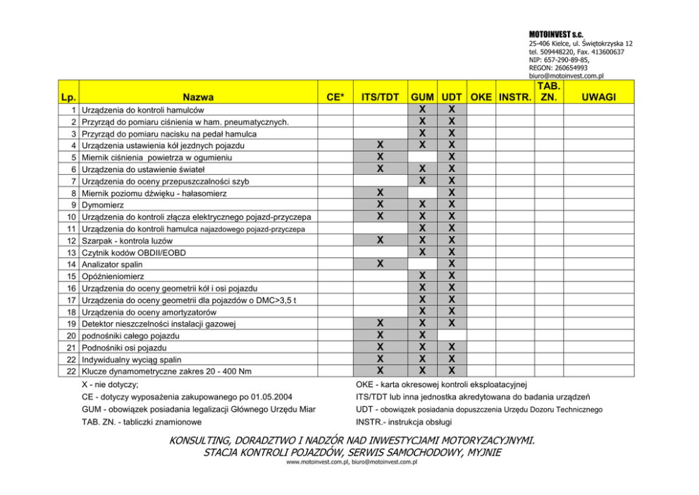 MOTOINVEST s.c. 25-406 Kielce, ul. Świętokrzyska 12 tel. 509448220, Fax. 413600637 NIP: 657-290-89-85, REGON: 260654993 [email protected] Lp. 1 2 3 4 5 6 7 8 9 10 11 12 13 14 15 16 17 18 19 20 21 22 22 Nazwa CE* Urządzenia do kontroli hamulców Przyrząd do pomiaru ciśnienia w ham. pneumatycznych. Przyrząd do pomiaru nacisku na pedał hamulca Urządzenia ustawienia kół jezdnych pojazdu Miernik ciśnienia powietrza w ogumieniu Urządzenia do ustawienie świateł Urządzenia do oceny przepuszczalności szyb Miernik poziomu dźwięku - hałasomierz Dymomierz Urządzenia do kontroli złącza elektrycznego pojazd-przyczepa Urządzenia do kontroli hamulca najazdowego pojazd-przyczepa Szarpak - kontrola luzów Czytnik kodów OBDII/EOBD Analizator spalin Opóźnieniomierz Urządzenia do oceny geometrii kół i osi pojazdu Urządzenia do oceny geometrii dla pojazdów o DMC>3,5 t Urządzenia do oceny amortyzatorów Detektor nieszczelności instalacji gazowej podnośniki całego pojazdu Podnośniki osi pojazdu Indywidualny wyciąg spalin Klucze dynamometryczne zakres 20 - 400 Nm ITS/TDT X X X X X X X X X X X X X TAB. GUM UDT OKE INSTR. ZN. X X X X X X X X X X X X X X X X X X X X X X X X X X X X X X X X X X X X X X X X X X UWAGI X - nie dotyczy; OKE - karta okresowej kontroli eksploatacyjnej CE - dotyczy wyposażenia zakupowanego po 01.05.2004 ITS/TDT lub inna jednostka akredytowana do badania urządzeń GUM - obowiązek posiadania legalizacji Głównego Urzędu Miar UDT - obowiązek posiadania dopuszczenia Urzędu Dozoru Technicznego TAB. ZN. - tabliczki znamionowe INSTR.- instrukcja obsługi KONSULTING, DORADZTWO I NADZÓR NAD INWESTYCJAMI MOTORYZACYJNYMI. STACJA KONTROLI POJAZDÓW, SERWIS SAMOCHODOWY, MYJNIE www.motoinvest.com.pl, [email protected] MOTOINVEST s.c. 25-406 Kielce, ul. Świętokrzyska 12 tel. 509448220, Fax. 413600637 NIP: 657-290-89-85, REGON: 260654993 [email protected] 1 Wentylacja a kanał - nawiewna b stanowisko kontrolne: b1 nawiewna b2 wywiewna czujniki CO + uruchomienie wentylacji c d czujniki LPG - propan-butan e czujniki CNG - gaz ziemny OK. UWAGI 2 Przepisy - dokumentacja a akty prawne b program SKP + PC + drukarka dane techniczno - regulacyjne c d tablica informacyjna e cennik wykaz czynności f g wykaz diagnostów h identyfikatory OK. UWAGI 3 Instalacje a elektryczna 240 V gniazda b elektryczna 400 V gniazda elektryczna 24 V gniazda c d pneumatyczna e oświetlenie kanał i pomieszczenie SKP odwodnienia kanał i pomieszczenie SKP f OK. UWAGI KONSULTING, DORADZTWO I NADZÓR NAD INWESTYCJAMI MOTORYZACYJNYMI. STACJA KONTROLI POJAZDÓW, SERWIS SAMOCHODOWY, MYJNIE www.motoinvest.com.pl, [email protected]