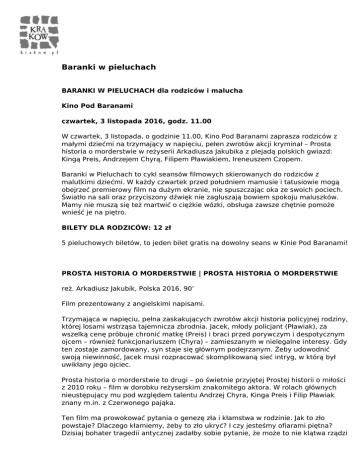 Baranki w pieluchach BARANKI W PIELUCHACH dla rodziców i malucha Kino Pod Baranami czwartek, 3 listopada 2016, godz. 11.00 W czwartek, 3 listopada, o godzinie 11.00, Kino Pod Baranami zaprasza rodziców z małymi dziećmi na trzymający w napięciu, pełen zwrotów akcji kryminał – Prosta historia o morderstwie w reżyserii Arkadiusza Jakubika z plejadą polskich gwiazd: Kingą Preis, Andrzejem Chyrą, Filipem Pławiakiem, Ireneuszem Czopem. Baranki w Pieluchach to cykl seansów filmowych skierowanych do rodziców z malutkimi dziećmi. W każdy czwartek przed południem mamusie i tatusiowie mogą obejrzeć premierowy film na dużym ekranie, nie spuszczając oka ze swoich pociech. Światło na sali oraz przyciszony dźwięk nie zagłuszają bowiem spokoju maluszków. Mamy nie muszą się też martwić o ciężkie wózki, obsługa zawsze chętnie pomoże wnieść je na piętro. BILETY DLA RODZICÓW: 12 zł 5 pieluchowych biletów, to jeden bilet gratis na dowolny seans w Kinie Pod Baranami! PROSTA HISTORIA O MORDERSTWIE | PROSTA HISTORIA O MORDERSTWIE reż. Arkadiusz Jakubik, Polska 2016, 90’ Film prezentowany z angielskimi napisami. Trzymająca w napięciu, pełna zaskakujących zwrotów akcji historia policyjnej rodziny, której losami wstrząsa tajemnicza zbrodnia. Jacek, młody policjant (Pławiak), za wszelką cenę próbuje chronić matkę (Preis) i braci przed porywczym i despotycznym ojcem – również funkcjonariuszem (Chyra) – zamieszanym w nielegalne interesy. Gdy ten zostaje zamordowany, syn staje się głównym podejrzanym. Żeby udowodnić swoją niewinność, Jacek musi rozpracować skomplikowaną sieć intryg, w którą był uwikłany jego ojciec. Prosta historia o morderstwie to drugi – po świetnie przyjętej Prostej historii o miłości z 2010 roku – film w dorobku reżyserskim znakomitego aktora. W rolach głównych nieustępujący mu pod względem talentu Andrzej Chyra, Kinga Preis i Filip Pławiak znany m.in. z Czerwonego pająka. Ten film ma prowokować pytania o genezę zła i kłamstwa w rodzinie. Jak to zło powstaje? Dlaczego kłamiemy, żeby to zło ukryć? I czy jesteśmy ofiarami piętna? Dzisiaj bohater tragedii antycznej zadałby sobie pytanie, że może to nie klątwa rządzi losem człowieka, lecz człowiek klątwą. Że nie jesteśmy ofiarami piętna, lecz sprawcami. Więc może jesteśmy tylko my i nasze wybory? Prosta historia o morderstwie to zaangażowana społecznie opowieść ubrana w garnitur kryminalnego thrillera. Arkadiusz Jakubik, reżyser KINO POD BARANAMI Rynek Główny 27, Kraków (12) 423 07 68 www.kinopodbaranami.pl Zapraszamy! Powered by TCPDF (www.tcpdf.org)