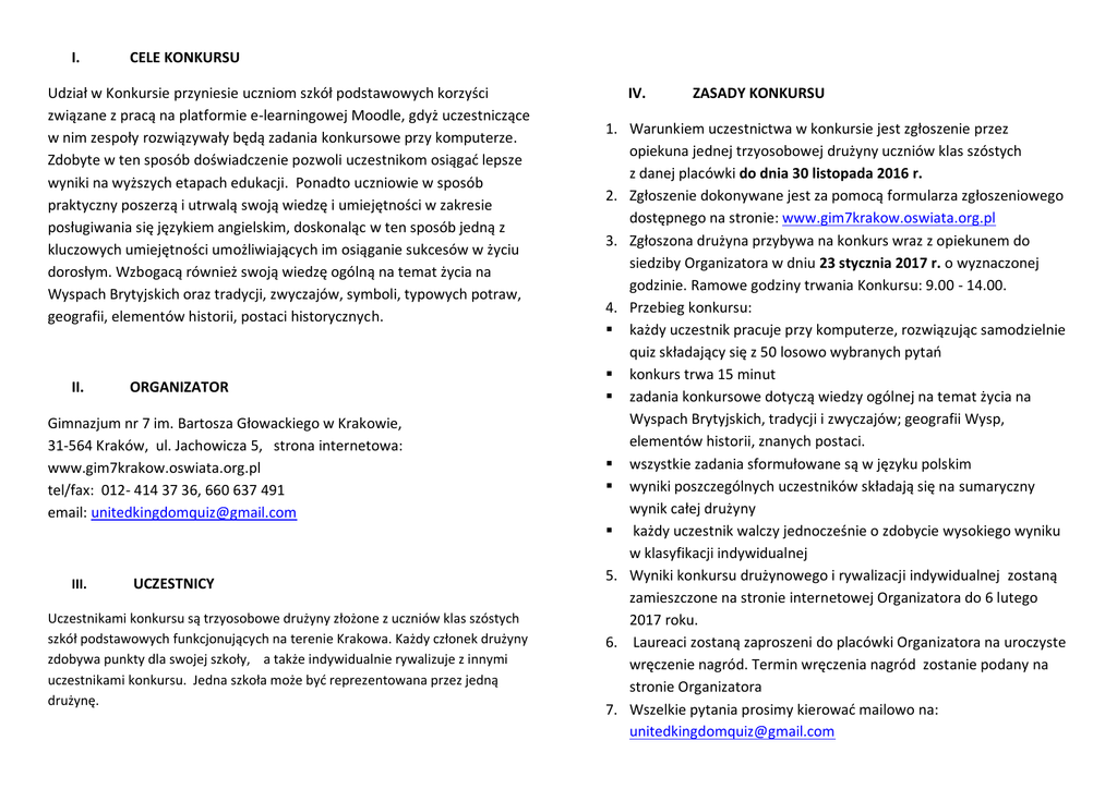 I. CELE KONKURSU Udział w Konkursie przyniesie uczniom szkół podstawowych korzyści związane z pracą na platformie e-learningowej Moodle, gdyż uczestniczące w nim zespoły rozwiązywały będą zadania konkursowe przy komputerze. Zdobyte w ten sposób doświadczenie pozwoli uczestnikom osiągać lepsze wyniki na wyższych etapach edukacji. Ponadto uczniowie w sposób praktyczny poszerzą i utrwalą swoją wiedzę i umiejętności w zakresie posługiwania się językiem angielskim, doskonaląc w ten sposób jedną z kluczowych umiejętności umożliwiających im osiąganie sukcesów w życiu dorosłym. Wzbogacą również swoją wiedzę ogólną na temat życia na Wyspach Brytyjskich oraz tradycji, zwyczajów, symboli, typowych potraw, geografii, elementów historii, postaci historycznych. II. ORGANIZATOR Gimnazjum nr 7 im. Bartosza Głowackiego w Krakowie, 31-564 Kraków, ul. Jachowicza 5, strona internetowa: www.gim7krakow.oswiata.org.pl tel/fax: 012- 414 37 36, 660 637 491 email: [email protected] III. UCZESTNICY Uczestnikami konkursu są trzyosobowe drużyny złożone z uczniów klas szóstych szkół podstawowych funkcjonujących na terenie Krakowa. Każdy członek drużyny zdobywa punkty dla swojej szkoły, a także indywidualnie rywalizuje z innymi uczestnikami konkursu. Jedna szkoła może być reprezentowana przez jedną drużynę. IV. ZASADY KONKURSU 1. Warunkiem uczestnictwa w konkursie jest zgłoszenie przez opiekuna jednej trzyosobowej drużyny uczniów klas szóstych z danej placówki do dnia 30 listopada 2016 r. 2. Zgłoszenie dokonywane jest za pomocą formularza zgłoszeniowego dostępnego na stronie: www.gim7krakow.oswiata.org.pl 3. Zgłoszona drużyna przybywa na konkurs wraz z opiekunem do siedziby Organizatora w dniu 23 stycznia 2017 r. o wyznaczonej godzinie. Ramowe godziny trwania Konkursu: 9.00 - 14.00. 4. Przebieg konkursu: każdy uczestnik pracuje przy komputerze, rozwiązując samodzielnie quiz składający się z 50 losowo wybranych pytań konkurs trwa 15 minut zadania konkursowe dotyczą wiedzy ogólnej na temat życia na Wyspach Brytyjskich, tradycji i zwyczajów; geografii Wysp, elementów historii, znanych postaci. wszystkie zadania sformułowane są w języku polskim wyniki poszczególnych uczestników składają się na sumaryczny wynik całej drużyny każdy uczestnik walczy jednocześnie o zdobycie wysokiego wyniku w klasyfikacji indywidualnej 5. Wyniki konkursu drużynowego i rywalizacji indywidualnej zostaną zamieszczone na stronie internetowej Organizatora do 6 lutego 2017 roku. 6. Laureaci zostaną zaproszeni do placówki Organizatora na uroczyste wręczenie nagród. Termin wręczenia nagród zostanie podany na stronie Organizatora 7. Wszelkie pytania prosimy kierować mailowo na: [email protected] Gimnazjum nr 7 w Krakowie im. Bartosza Głowackiego FORMULARZ ZGŁOSZENIOWY 31-564 Kraków, ul. Jachowicza 5 (wzór) Pieczęć placówki zgłaszającej drużynę MULTIMEDIALNY KONKURS WIEDZY O WYSPACH BRYTYJSKICH DLA UCZNIÓW KLAS SZÓSTYCH KRAKOWSKICH SZKÓŁ Pełna nazwa i adres szkoły: ____________________________________________________________ PODSTAWOWYCH ____________________________________________________________ Drużyna (imię, nazwisko i klasa uczestnika) 1.__________________________________________________________ 2.__________________________________________________________ 3.__________________________________________________________ Opiekun (imię, nazwisko, telefon kontaktowy, adres mailowy) ___________________________________________________________ ___________________________________________________________ ___________________________________________________________ Pieczęć i podpis dyrektora placówki Edycja IV Rok szkolny 2016/17