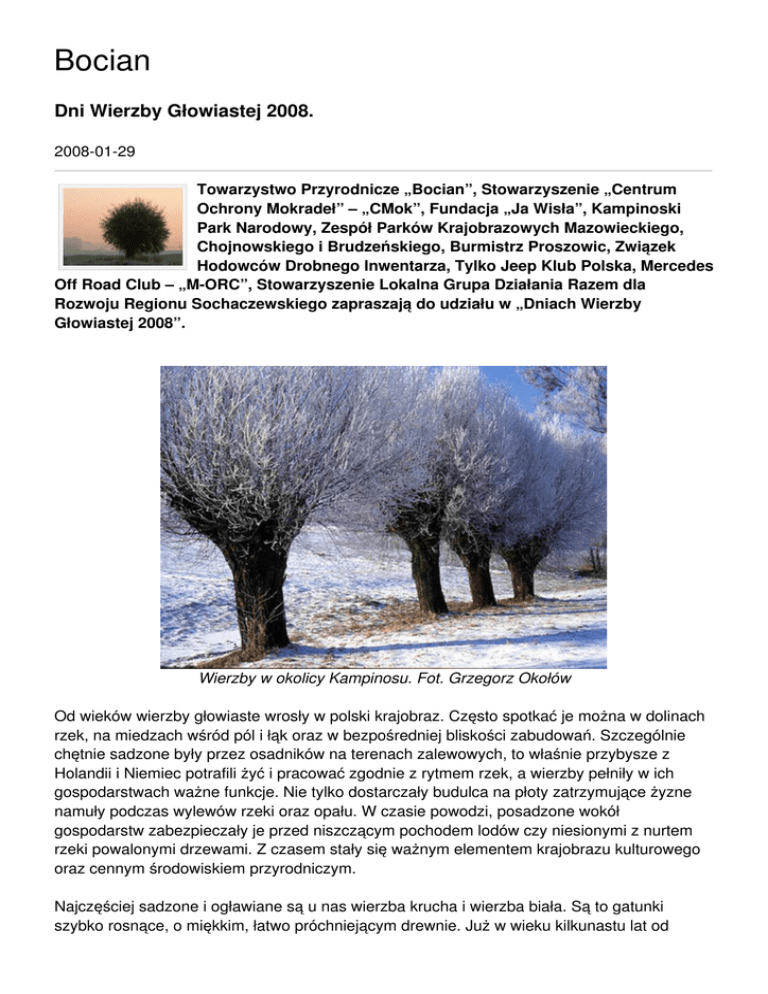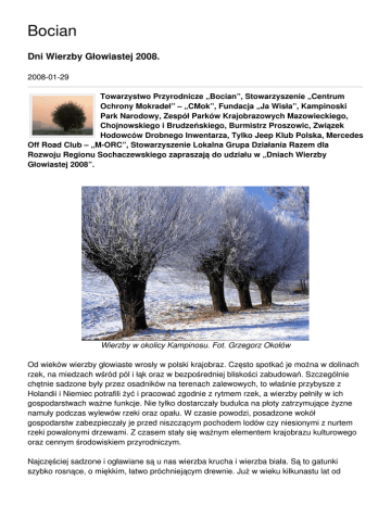 Bocian Dni Wierzby Głowiastej 2008. 2008-01-29 Towarzystwo Przyrodnicze „Bocian”, Stowarzyszenie „Centrum Ochrony Mokradeł” – „CMok”, Fundacja „Ja Wisła”, Kampinoski Park Narodowy, Zespół Parków Krajobrazowych Mazowieckiego, Chojnowskiego i Brudzeńskiego, Burmistrz Proszowic, Związek Hodowców Drobnego Inwentarza, Tylko Jeep Klub Polska, Mercedes Off Road Club – „M-ORC”, Stowarzyszenie Lokalna Grupa Działania Razem dla Rozwoju Regionu Sochaczewskiego zapraszają do udziału w „Dniach Wierzby Głowiastej 2008”. Wierzby w okolicy Kampinosu. Fot. Grzegorz Okołów Od wieków wierzby głowiaste wrosły w polski krajobraz. Często spotkać je można w dolinach rzek, na miedzach wśród pól i łąk oraz w bezpośredniej bliskości zabudowań. Szczególnie chętnie sadzone były przez osadników na terenach zalewowych, to właśnie przybysze z Holandii i Niemiec potrafili żyć i pracować zgodnie z rytmem rzek, a wierzby pełniły w ich gospodarstwach ważne funkcje. Nie tylko dostarczały budulca na płoty zatrzymujące żyzne namuły podczas wylewów rzeki oraz opału. W czasie powodzi, posadzone wokół gospodarstw zabezpieczały je przed niszczącym pochodem lodów czy niesionymi z nurtem rzeki powalonymi drzewami. Z czasem stały się ważnym elementem krajobrazu kulturowego oraz cennym środowiskiem przyrodniczym. Najczęściej sadzone i ogławiane są u nas wierzba krucha i wierzba biała. Są to gatunki szybko rosnące, o miękkim, łatwo próchniejącym drewnie. Już w wieku kilkunastu lat od posadzenia możemy uzyskać doskonałe siedlisko dla dzikich zwierząt. W wyniku systematycznego ścinania pędów na stałej wysokości, tworzy się charakterystyczna „głowa wierzbowa” – zgrubienie z licznymi dziuplami i szczelinami – zamieszkiwane przez wiele gatunków ptaków. Są to nie tylko pospolite dziuplaki, takie jak sikory, wróble, szpaki, kawki, pliszki, ale także coraz rzadsze dudki, pójdźki, puszczyki czy kraski. Gęste wierzbowe pędy i obszerne dziuple dają też schronienie kaczkom krzyżówkom, drozdom, gołębiom grzywaczom, spotkać też można na ogłowionych wierzbach gniazda bocianie. Żerują na niej owady przyciągające liczne ptaki. Miękkie drewno ułatwia kucie dziupli nie tylko dzięciołom, ale też np. sikorom czarnogłówkom. Wnętrze wypróchniałych wierzb często zasiedlają coraz rzadsze trzmiele – drugi z najważniejszych po pszczołach zapylacz roślin. Dla wielu innych rzadkich i chronionych gatunków owadów to cenne na terenach rolniczych siedlisko. Wierzby dostarczają pożywienia i ukrycia także ssakom. Z ukryć w popękanych pniach korzystają zające, jeże i liczne drobne gryzonie. W próchnie zimują padalce. Na przedwiośniu pyłek z kwiatów wierzbowych jest ważnym pożytkiem pszczelim. Sielski krajobraz z licznymi szpalerami wierzb głowiastych ma też duże znaczenie kulturowe. Kojarzony jest nie tylko z Żelazową Wolą i muzyką Chopina, wielu malarzy uwieczniało go na swoich płótnach, są też wdzięcznym obiektem fotografii przyrodniczej. Wierzby w okolicy Żelazowej Woli. Fot. Grzegorz Okołów Przez wieki, pod wpływem fantastycznych kształtów wierzbowych głów powstawały liczne legendy i baśnie. Już w czasach pogańskich uważano wierzby za drzewa płodności, a współcześnie z pędów z baziami wykonuje się palemki wielkanocne. Nic zatem w tym dziwnego, że wierzba uważana jest za najbardziej „polskie drzewo”, tak jak bocian biały jest najbardziej „polskim ptakiem”. Zarówno wierzba głowiasta jak też i bocian są umieszczone w logo Towarzystwa Przyrodniczego „Bocian”, co tym bardziej motywuje nas do troski o nie. Coraz mniej gospodarzy sadzi „żywokoły” na swoich miedzach, coraz mniej jest miedz… Wiele wierzb wycięto, aby ułatwić sobie uprawę roli sprzętem mechanicznym, a pozostałe często wypalane są przez wandali. Liczne gatunki ptaków związane z krajobrazem rolniczym i dziuplami gwałtownie zmniejszyły swą liczebność - np. pójdźka, dudek. Warto więc zadbać o to, co przyciąga zwierzęta jak i fascynuje ludzi. Jeśli w swojej okolicy znacie takie miejsca, gdzie trzeba już ogławiać wierzby, a nikt od dawna tego nie robi, zachęcamy do porozumienia się z właścicielami gruntów i wspólnego zorganizowania ogławiania wierzb. W marcu i kwietniu proponujemy zorganizowanie sadzenia wierzb. Jednocześnie prosimy o nadsyłanie relacji z przeprowadzonych akcji. W ubiegłym roku, w celu przypomnienia dawnego zwyczaju, po raz pierwszy TP Bocian zorganizowało „Dzień Wierzby Głowiastej” na terenie Kampinoskiego Parku Narodowego zobacz relację. 20 stycznia, 26-ciu ochotników ogławiało wierzby w wsiach Górki i Zamość. Akcja spotkała się z dużym zainteresowaniem członków i sympatyków TP Bocian. Jeszcze tego samego roku, 24 lutego podobna akcja odbyła się w Opatkowicach w Gminie Proszowice. W sumie w Opatkowicach ogłowiono kilkanaście drzew, a w KPN 50. W działaniach bezpośrednich oraz edukacyjnych wzięli też udział członkowie Sekcji Entomologicznej TPB, pisząc ciekawy tekst o rzadkich owadach zamieszkujących głowiaste wierzby, dostępny na stronie internetowej Sekcji. W tym roku w sposób zorganizowany udział w akcji wezmą też udział miłośnicy off-roadu. Angażując w to przedsięwzięcie członków klubów samochodów terenowych chcemy osiągnąć podwójny efekt: ogłowienie wierzb oraz wzrost świadomości ekologicznej wśród kierowców samochodów 4x4. Doświadczenia z ubiegłego roku są bardzo pozytywne, integracji najlepiej służy wspólna ciężka praca w trudnym terenie, najlepiej w deszczu i błocie, a przyrodnicy wolą z tym środowiskiem współpracować niż zwalczać się, bo jest wiele problemów w polskiej ochronie przyrody i każdy sojusznik się przyda. Pójdźka w wierzbowej dziupli. Fot. Robert Dróżdż W roku 2008 w związku z dużym zainteresowaniem ochroną wierzb głowiastych
