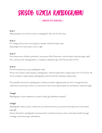 SPOSÓB UŻYCIA RAPIDOGRAPHU – KROK PO KROKU - Krok 1 Wlej specjalny tusz do zbiorniczka w rapidografie. Max. do 1/2 zbiornika. Krok 2 Do małego zbiorniczka na samej górze zakrętki wlej kilka kropel wody. Zapobiegnie ona wyschnięciu tuszu w igle. Krok 3 Na zmatowionym blokiem polerskim i przemytym Nail Cleanerem kolorze lakieru hybrydowego, bądź żelu, wykonaj wzór rapidographem, a następnie zabezpiecz go Hard Top lub żelem finish. Krok 4 Po skończonej pracy umyj rapidograph wodą. W tym celu wykręć część piszącą z rapidographu i włóż do pojemnika z ciepłą wodą na ok 5-10 minut. Na koniec przepłucz część piszącą rapidographu pod strumieniem bieżącej, ciepłej wody. W przypadku stosowania rapidographu na klasyczny lakier najlepiej wykonać wzór na drugi dzień (po całkowitym wyschnięciu koloru, w przeciwnym razie można doprowadzić do uszkodzenia i zapchania igły). Uwaga! Rapidograph nie jest napełniony tuszem (należy go dodatkowo zakupić). Uwaga! Rapidograph należy czyścić codziennie, po zakończeniu pracy, ponieważ zaschnięty tusz może zatkać jego igłę. Mocne dociskanie rapidographu do powierzchni na której tworzymy wzór, może doprowadzić do jego trwałego, mechanicznego uszkodzenia. Sprawdź instrukcję użytkowania oraz czyszczenia Rapidographu. KLIKNIJ TUTAJ Nie odpowiadamy za uszkodzenia powstałe w wyniku nieumiejętnego użytkowania produktu. Uważaj, aby nie zanieczyścić końcówki lakierem, akrylem, żelem. Maluj zawsze po zmatowionej i odtłuszczonej powierzchni. Czyść Rapidograph codziennie po skończonej pracy. Jeśli igła jest całkowicie zapchana możesz dodać odrobinę płynu do mycia naczyń do zbiornika z wodą, w którym namaczamy część piszącą. NeoNail życzy powodzenia oraz miłej pracy!