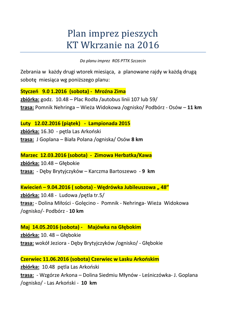 Plan imprez pieszych KT Wkrzanie na 2016 Do planu imprez ROS PTTK Szczecin Zebrania w każdy drugi wtorek miesiąca, a planowane rajdy w każdą drugą sobotę miesiąca wg poniższego planu: Styczeo 9.0 1.2016 (sobota) - Mroźna Zima zbiórka: godz. 10.48 – Plac Rodła /autobus linii 107 lub 59/ trasa: Pomnik Nehringa – Wieża Widokowa /ognisko/ Podbórz - Osów – 11 km Luty 12.02.2016 (piątek) - Lampionada 2015 zbiórka: 16.30 - pętla Las Arkooski trasa: J Goplana – Biała Polana /ogniska/ Osów 8 km Marzec 12.03.2016 (sobota) - Zimowa Herbatka/Kawa zbiórka: 10.48 – Głębokie trasa: - Dęby Brytyjczyków – Karczma Bartoszewo - 9 km Kwiecieo – 9.04.2016 ( sobota) - Wędrówka Jubileuszowa „ 48” zbiórka: 10.48 - Ludowa /pętla tr.5/ trasa: - Dolina Miłości - Golęcino - Pomnik - Nehringa- Wieża Widokowa /ognisko/- Podbórz - 10 km Maj 14.05.2016 (sobota) - Majówka na Głębokim zbiórka: 10. 48 – Głębokie trasa: wokół Jeziora - Dęby Brytyjczyków /ognisko/ - Głębokie Czerwiec 11.06.2016 (sobota) Czerwiec w Lasku Arkooskim zbiórka: 10.48 pętla Las Arkooski trasa: - Wzgórze Arkona – Dolina Siedmiu Młynów - Leśniczówka- J. Goplana /ognisko/ - Las Arkooski - 10 km Lipiec 9.07.2016 (sobota) - Letnia Wędrówka po Puszczy Wkrzaoskiej zbiórka: 10.48 Plac Rodła /107/ trasa: Przęsocin – Welecka Góra - Polana Harcerska /ognisko/ - Głębokie -10 km Sierpieo 13.08.2016 (sobota) Pełnia Lata zbiórka: 10.48 pętla Kołłątaja /51/ trasa: Osów - Podbórz – pomnik Sportowców – Wieża Widokowa /ognisko/ Stołczyn - 8 km Wrzesieo 10.09.2016 (sobota) Rajd Jeżynowy zbiórka: 10.48 – pętla Kołłątaja trasa: Skolwin /PKP/ -Przęsocin – Wieża /ognisko/- Podbórz – 10 km Październik 8.10.2016 (sobota) - To już Jesieo zbiórka: 10.48 Gocław trasa: Wieża Bismarcka – Gocław /pomnik/- Wysoki Staw - Głaz Bukowski – Wieża Widokowa /ognisko/ 10 km Listopad – 12.11.2016 (sobota) Złota Jesieo zbiórka: 10.48 Las Arkooski trasa: Wzgórze Arkona – Polana Harcerska- Syrenie Stawy - Polana Czerwona /ognisko/ 10 km Grudzieo –10.12.2016 (sobota) Jutro Zima zbiórka: 10.48 – pomnik Jana Pawła II trasa: - Różanka – Leśniczówka Biała – Polana Sportowa /ognisko/ - Głębokie – 9 km