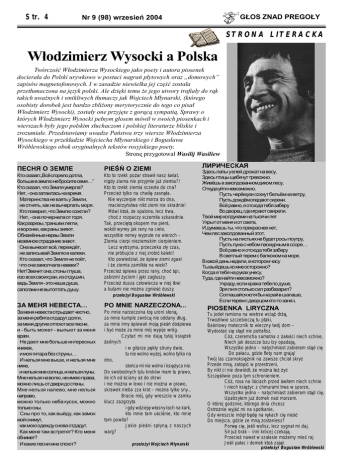 Str. 4 GŁOS ZNAD PREGOŁY Nr 9 (98) wrzesień 2004 STRONA LITERACKA Włodzimierz Wysocki a Polska Twórczość Włodzimierza Wysockiego jako poety i autora piosenek docierała do Polski urywkowo w postaci nagrań płytowych oraz „domowych” zapisów magnetofonowych. I w zasadzie niewielka jej część została przetłumaczona na język polski. Ale dzięki temu że jego utwory trafiały do rąk takich uważnych i wnikliwych tłumaczy jak Wojciech Młynarski, (którego osobisty dorobek jest bardzo zbliżony merytorycznie do tego co pisał Włodzimierz Wysocki), zostały one przyjęte z gorącą sympatią. Sprawy o których Włodzimierz Wysocki pełnym głosem mówił w swoich piosenkach i wierszach były jego polskim słuchaczom i polskiej literaturze bliskie i zrozumiałe. Przedstawiamy uwadze Państwa trzy wiersze Włodzimierza Wysockiego w przekładzie Wojciecha Młynarskiego i Bogusława Wróblewskiego obok oryginalnych tekstów rosyjskiego poety. Stronę przygotował Wasilij Wasiliew ПЕСНЯ О ЗЕМЛЕ PIEŚŃ O ZIEMI Кто сказал:„Всёсгорело дотла, больше в землю небросите семя…” Кто сказал, что Земля умерла? Нет, - она затаилась на время. Материнства не взять у Земли, не отнять, как не вычерпать моря. Кто поверил, что Землю сожгли? Нет, - она почернела от горя. Как разрезы,траншеи легли, и воронки, как раны зияют. Обнажённые нервы Земли неземное страдание знают. Она вынесет всё, переждёт, не записывай Землю в калеки. Кто сказал, что Земля не поёт, что она замолчала навеки? Нет! Звенит она, стоны глуша, изо всехсвоих ран, из отдушин, ведь Земля - это наша душа, сапогами не вытоптать душу. Kto to rzekł: pożar strawił nasz świat, nigdy ziarna nie przyjmie już ziemia?! Kto to rzekł: ziemia sczezła do cna? Przecież tylko na chwilę zasnęła. Nie wyczerpie nikt morza do dna, macierzyństwa nikt ziemi nie skradnie! Mówi ktoś, że spalona, lecz trwa, choć z rozpaczy sczerniła szkaradnie. Tak, przeciętą okopem ma pierś, wokół wyrwy jak rany na ciele, wszystkie nerwy wyprute na wierzch – Ziemia cierpi nieziemskim cierpieniem. Lecz wytrzyma, przeczeka zły czas, nie próbujcie z niej zrobić kaleki! Kto powiedział, że śpiew ziemi zgasł i że ziemia zamilkła na wieki? Przecież śpiewa przez rany, choć śpi, zabrzmi życiem i jęki zagłuszy. Przecież dusza człowiecza w niej tkwi a butami nie można zgnieść duszy. przełożył Bogusław Wróblewski ЗА МЕНЯ НЕВЕСТА… PO MNIE NARZECZONA... За меня невеста отрыдает честно, за меня ребята отдадут долги, за меня другие отпоют все песни, и - быть может - выпьют за меня враги. Не дают мне больше интересных книжек, и моя гитара без струны… И нельзя мне выше, и нельзя мне ниже, и нельзя мне солнца, и нельзя луны. Мне нельзя на волю, не имею права, можно лишь от двери до стены. Мне нельзя налево, мне нельзя направо, можно только неба кусок, можно только сны. Сны про то, как выйду, как замок мой снимут, как мою одежду снова отдадут. Как меня там встретят? Кто меня обнимет? И какие песни мне споют? Po mnie narzeczona łzę uroni słoną, za mnie kumple zwrócą nie oddany dług, za mnie inny śpiewak moją pieśń dośpiewa i być może za mnie mój wypije wróg. Czytać mi nie dają tutaj książek żadnych i w gitarze pękły struny dwie, tu nie wolno wyżej, wolno tylko na dno, słońca mi nie wolno i księżyca nie. Do swobodnych tylu kroków mam tu prawo, ile ich od ściany aż do drzwi i nie można w lewo i nie można w prawo, skrawek nieba zza krat – można tylko sny... Bracie mój, gdy wreszcie w zamku klucz zazgrzyta i gdy wdzieję własny łach na kark, kto mnie tam uściśnie, kto mnie tam powita? Jakie pieśni spłyną z naszych warg? przełożył Wojciech Młynarski ЛИРИЧЕСКАЯ Здесь лапы уелей дрожат на весу, Здесь птицы щебечут тревожно. Живёшь в заколдованном диком лесу, Откуда уйти невозможно. Пусть черёмухи сохнут бельём на ветру, Пусть дождёмопадают сирени. Всё равно, я отсюда тебя заберу Во дворец, где играют свирели. Твой мир колдунами на тысячи лет Укрыт от меня и от света, И думаешь ты, что прекраснее нет, Чем лес заколдованный этот. Пусть на листьяхне будет росы поутру, Пусть луна с небом пасмурным в ссоре… Всё равно я отсюда тебя заберу В светлый терем с балконом на море. В какой день недели, в котором часу Ты выйдешь ко мне осторожно? Когда я тебя на руках унесу, Туда, где найти невозможно? Украду, если кража тебе по душе, Зря ли я столько сил разбазарил? Соглашайся хотя бы на рай в шалаше, Если терем с дв