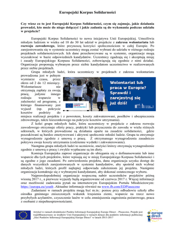 Europejski Korpus Solidarności Czy wiesz co to jest Europejski Korpus Solidarności, czym się zajmuje, jakie działania prowadzi, kto moŜe do niego dołączyć i jakie zadania są do wykonania podczas udziału w projekcie? Europejski Korpus Solidarności to nowa inicjatywa Unii Europejskiej. UmoŜliwia młodym ludziom w wieku od 18 do 30 lat udział w projekcie z zakresu wolontariatu lub rozwoju zawodowego, które przynoszą korzyści społecznościom w całej Europie. Po zarejestrowaniu się w systemie uczestnicy mogą zostać wybrani do udziału w róŜnego rodzaju projektach solidarnościowych. Ich dane przechowywane są w systemie, organizacje mogą wyszukiwać w bazie odpowiednich kandydatów. Uczestnicy zgadzają się i akceptują misję i zasady Europejskiego Korpusu Solidarności, zobowiązują się zgodnie z nimi działać. Organizacje proponują wybranym przez siebie kandydatom uczestnictwo w realizowanych przez siebie projektach. Grupa młodych ludzi, która uczestniczy w projektach z zakresu wolontariatu prowadzona jest w pełnym wymiarze czasu, przez okres od 2 do 12 miesięcy. Wolontariusze nie otrzymują zapłaty za swoją pracę, jedynie innego rodzaju wsparcie w zaleŜności od programu, z którego finansowany jest wyjazd (np. pokrycie kosztów podróŜy do miejsca realizacji projektu i z powrotem, koszty zakwaterowani, posiłków i ubezpieczenia zdrowotnego, takŜe kieszonkowego na pokrycie kosztów utrzymania). Z kolei grupa młodych ludzi, która uczestniczy w projekcie z zakresu rozwoju zawodowego otrzymuje oferty pracy, praktyki lub przyuczenia do zawodu w wielu róŜnych sektorach, w których prowadzone są działania oparte na zasadzie solidarności, gdzie poszukiwani są bardzo zmotywowani i aktywni społecznie młodzi ludzie. Grupa ta otrzymuje wynagrodzenie zgodnie z umową o pracę. Z otrzymanego wynagrodzenia zasadniczo pokrywa swoje koszty utrzymania (codzienne wydatki i zakwaterowanie). Następna grupa młodych ludzi to uczniowie, staŜyści którzy otrzymują wynagrodzenie zgodnie z umową o pracę i zwykle wypłacane są im diety. Komisja Europejska zaprosi organizacje do ubiegania się o dofinansowanie lub inne wsparcie dla tych projektów, które wpisują się w misję Europejskiego Korpusu Solidarności i są zgodne z jego zasadami. Po zatwierdzeniu projektu, dana organizacja uzyska dostęp do danych wszystkich zarejestrowanych w systemie kandydatów, aby spośród nich wybrać młodych ludzi, których profil najlepiej odpowiada załoŜeniom jej projektu. Następnie organizacja kontaktuje się z wybranymi kandydatami, aby dokonać ostatecznego wyboru. Najprawdopodobniej organizacje rozpoczną nabór uczestników projektów późną wiosną 2017 r., a pierwsze wyjazdy będą organizowane od czerwca 2017 r. Więcej informacji oraz moŜliwość zadawania pytań na internetowym Europejskim Portalu MłodzieŜowym: https://europa.eu/youth .Aktualne informacje równieŜ na www.fb.com/EDPiaseczno Zadaniami w ramach projektu mogą być m.in.: pomoc przy odbudowie szkoły albo ośrodka gminnego zniszczonych wskutek trzęsienia ziemi, wsparcie na rzecz nowo przybyłych azylantów, czyszczenie lasów w celu zmniejszenia zagroŜenia poŜarowego, praca z osobami z niepełnosprawnościami. Artykuł w ramach działalności Punktu Informacji Europejskiej Europe Direct – Piaseczno. Projekt jest współfinansowany ze środków Unii Europejskiej w ramach dotacji dla punktów informacji publicznej „Sieć Punktów Informacji Europejskiej Europe Direct” w latach 2013-2017