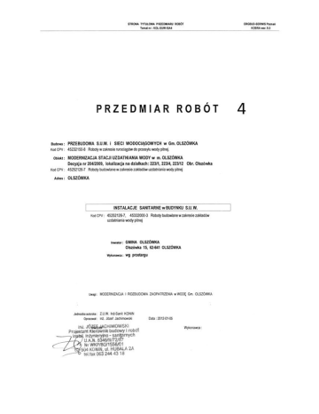 PRZEDMIAR ROBÓT Temat nr : KOL-SUW-ISA4 ORGBUD-SERWIS Poznań KOBRA wer. 9.5 INSTALACJE SANITARNE w BUDYNKU S.U.W. Budowa : PRZEBUDOWA S.U.W. i SIECI WODOCIĄGOWYCH w Gm. OLSZÓWKA Obiekt : MODERNIZACJA STACJI UZDATNIANIA WODY w m. OLSZÓWKA Decyzja nr 204/2009, lokalizacja na działkach: 223/1, 223/4, 223/12 Obr. Olszówka Adres : OLSZÓWKA Lp. Str: 1 Podstawa kalkulacji / opis pozycji Ilość Jedn. miary OGÓLNA CHARAKTERYSTYKA WYKONANIA INSTALACJI SANITARNYCH w BUDYNKU S.U.W. 1. Demontaż istniejacych instalacji sanitarnych w budynku S.U.W. 2. Montaż nowej instalacji sanitarnej w budynku po modernizacji. Kod CPV : 45332000-3 A DEMONTAŻ ISTNIEJĄCEJ INSTALACJI SANITARNEJ W BUDYNKU. Numer specyfikacji : ST0.0 Kod CPV : 45111100-9 1 ZAŁ.1 - KNNR 008-0122-01-00 MRRiB [ Wydanie - Warszawa 26.09.2000 r. ] 2,000 szt Demontaż zaworu czerpalnego (wypływowego), o średnicy: 15 - 20 mm Numer specyfikacji : ST0.0 2 ZAŁ.1 - KNNR 008-0225-05-00 MRRiB [ Wydanie - Warszawa 26.09.2000 r. ] 1,000 kpl Demontaż urządzeń sanitarnych: ustępu z miską porcelanową lub żeliwną Numer specyfikacji : ST0.0 3 ZAŁ.1 - KNNR 008-0225-03-00 MRRiB [ Wydanie - Warszawa 26.09.2000 r. ] 1,000 kpl Demontaż urządzeń sanitarnych: umywalki porcelanowej Numer specyfikacji : ST0.0 4 ZAŁ.1 - KNNR 008-0222-04-00 MRRiB [ Wydanie - Warszawa 26.09.2000 r. ] 12,000 m Demontaż rurociągu żeliwnego kanalizacyjnego, na ścianach budynku, o średnicy: 50 - 100 mm Numer specyfikacji : ST0.0 5 ZAŁ.1 - KNNR 008-0222-01-00 MRRiB [ Wydanie - Warszawa 26.09.2000 r. ] 11,000 m Demontaż rurociągu żeliwnego kanalizacyjnego, w wykopie, o średnicy: 50 - 100 mm Numer specyfikacji : ST0.0 6 ZAŁ.1 - KNNR 008-0108-01-00 MRRiB [ Wydanie - Warszawa 26.09.2000 r. ] 14,000 m Demontaż rurociągu stalowego ocynkowanego, na ścianie, o średnicy: 15 - 20 mm Numer specyfikacji : ST0.0 B INSTALACJE WENTYLACYJNE w BUDYNKU S.U.W. Numer specyfikacji : ST0.0 Kod CPV : 45331200-8 7 KNR 401-0333-03-00 IZOiEPB ORGBUD W-wa [ Wydanie - Warszawa 1988 r.z uwzgl.BI do 9/96 ] 2,000 szt Przebicie otworów o powierzchni do 0,05 m2, w ścianach z cegieł na zaprawie wapiennej, o grubości: 1 1/2 cegły Numer specyfikacji : ST0.0 Kod CPV : 45331200-8 8 KNR 217-0201-02-00 IZOiEPB ORGBUD W-wa [ Wydanie - Warszawa 1987 r.z uwzgl.BI do 6/92 ] 2,000 szt Montaż wentylatorów promieniowych Basic 300, Danfoss Numer specyfikacji : ST0.0 Kod CPV : 45331200-8 9 217-0201-02-10 1,000 szt Montaż wentylatorów promieniowych TH - 500 Numer specyfikacji : ST0.0 Kod CPV : 45331200-8 10 KNR 217-0152-02-00 IZOiEPB ORGBUD W-wa [ Wydanie - Warszawa 1987 r.z uwzgl.BI do 6/92 ] Wywietrzaki dachowe cylindryczne o średnicy: ponad 100 do 200 mm Numer specyfikacji : ST0.0 Kod CPV : 45331200-8 1,000 szt PRZEDMIAR ROBÓT Temat nr : KOL-SUW-ISA4 ORGBUD-SERWIS Poznań KOBRA wer. 9.5 INSTALACJE SANITARNE w BUDYNKU S.U.W. B. INSTALACJE WENTYLACYJNE w BUDYNKU S.U.W. Str: 2 Lp. Podstawa kalkulacji / opis pozycji 11 KNR 217-0152-03-00 IZOiEPB ORGBUD W-wa [ Wydanie - Warszawa 1987 r.z uwzgl.BI do 6/92 ] Ilość Jedn. miary 2,000 szt Wywietrzaki dachowe cylindryczne o średnicy: ponad 200 do 315 mm Numer specyfikacji : ST0.0 Kod CPV : 45331200-8 12 KNR 217-0147-01-00 IZOiEPB ORGBUD W-wa [ Wydanie - Warszawa 1987 r.z uwzgl.BI do 6/92 ] 1,000 szt Czerpnie ścienne kołowe typu B, o średnicy: do 315 mm Numer specyfikacji : ST0.0 Kod CPV : 45331200-8 13 KNR 217-0137-01-01 IZOiEPB ORGBUD W-wa [ Wydanie - Warszawa 1987 r.z uwzgl.BI do 6/92 ] 2,000 szt Kratki wentylacyjne typu A/I, do przewodów murowanych, o obwodzie: do 1000 mm Numer specyfikacji : ST0.0 Kod CPV : 45331200-8 C INSTALACJE WODNO - -KANALIZACYJNE- nowe. Numer specyfikacji : ST0.0 Kod CPV : 45332000-3 14 KNR 013-0126-02-00 IGM Warszawa [ Wyd.IGM Warszawa-Olsztyn 1996 r. ] 17,000 m Rurociągi z rur PVC ( do wody zimnej ) łączone metodą klejenia na ścianach budynków niemieszkalnych, przy średnicy zewnętrznej rurociągu: 25 mm Numer specyfikacji : ST0.0 15 ZAŁ.1 - KNNR 004-0116-02-00 MRRiB [ Wydanie - Warszawa 26.09.2000 r. ] 3,000 szt Dodatki za podejścia dopływowe do zaworów czerpalnych, baterii, mieszaczy, hydrantów itp., o połączeniu sztywnym, w rurociągach z tworzyw sztucznych, o średnicy zewnętrznej: 25 mm - rurociągi z PVC Numer specyfikacji : ST0.0 16 KNR 013-0126-01-00 IGM Warszawa [ Wyd.IGM Warszawa-Olsztyn 1996 r. ] 23,000 m Rurociągi z rur PVC ( do wody zimnej ) łączone metodą klejenia na ścianach budynków niemieszkalnych, przy średnicy zewnętrznej rurociągu: 20 mm Numer specyfikacji : ST0.0 17 ZAŁ.1 - KNNR 004-0116-01-00 MRRiB [ Wydanie - Warszawa 26.09.2000 r. ] 11,000 szt Dodatki za podejścia dopływowe do zaworów czerpalnych, baterii, mieszaczy, hydrantów itp., o połączeniu sztywnym, w rurociągach z tworzyw sztucznych, o średnicy zewnętrznej: 20 mm - rurociągi z PVC Numer specyfikacji : ST0.0 18 ZAŁ.1 - KNNR 001-0305-01-00 MRRiB [ Wydanie - Warszawa 26.09.2000 r. ] 10,100 m3 Wykopy liniowe lub jamiste ze skarpami,o szerokości dna do 1,5 m i głębokości do 1,5 m, w gruncie: kat. I-II, przy złoż.urobku po jednej str.wykopu Numer specyfikacji : ST0.0 19 ZAŁ.1 - KNNR 001-0318-01-00 MRRiB [ Wydanie - Warszawa 26.09.2000 r. ] 10,100 m3 Zasypywanie wykopów o szer. 0,8-2,5 m, o ścianach pionowych, przy głęb.wykopu do 1,5 m, warstwami grub. 20 cm, z zagęszczeniem ręcznym, w gruncie: kat. I-III Numer specyfikacji : ST0.0 20 ZAŁ.1 - KNNR 003-0305-01-00 MRRiB [ Wydanie - Warszawa 26.09.2000 r. ] 0,020 m3 Wykucie, zamurowanie i otynkowanie bruzd w ścianach z cegły na zaprawie wapiennej i cementowowapiennej Numer specyfikacji : ST0.0 21 ZAŁ.1 - KNNR 004-0208-01-00 MRRiB [ Wydanie - Warszawa 26.09.2000 r. ] Rurociągi z rur kanalizacyjnych PVC,o połączeniach wciskowych,mocowane na ścianach w budynkach niemieszkalnych, o średnicy: 50 mm Numer specyfikacji : ST0.0 2,000 m PRZEDMIAR ROBÓT Temat nr : KOL-SUW-ISA4 ORGBUD-SERWIS Poznań KOBRA wer. 9.5 INSTALACJE SANITARNE w B
