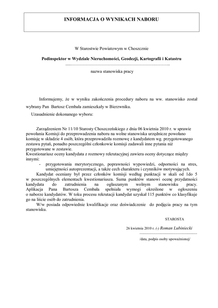 INFORMACJA O WYNIKACH NABORU W Starostwie Powiatowym w Choszcznie Podinspektor w Wydziale Nieruchomości, Geodezji, Kartografii i Katastru .....………………………………………………………….. nazwa stanowiska pracy Informujemy, że w wyniku zakończenia procedury naboru na ww. stanowisko został wybrany Pan Bartosz Cembała zamieszkały w Bierzwniku. Uzasadnienie dokonanego wyboru: Zarządzeniem Nr 11/10 Starosty Choszczeńskiego z dnia 06 kwietnia 2010 r. w sprawie powołania Komisji do przeprowadzenia naboru na wolne stanowiska urzędnicze powołano komisję w składzie 4 osób, która przeprowadziła rozmowę z kandydatem wg. przygotowanego zestawu pytań, ponadto poszczególni członkowie komisji zadawali inne pytania niż przygotowane w zestawie. Kwestionariusz oceny kandydata z rozmowy rekrutacyjnej zawiera oceny dotyczące między innymi: - przygotowania merytorycznego, poprawności wypowiedzi, odporności na stres, umiejętności autoprezentacji, a także cech charakteru i czynników motywujących. Kandydat oceniany był przez członków komisji według punktacji w skali od 1do 5 w poszczególnych elementach kwestionariusza. Suma punktów stanowi ocenę przydatności kandydata do zatrudnienia na ogłaszanym wolnym stanowisku pracy. Aplikacja Pana Bartosza Cembała spełniała wymogi określone w ogłoszeniu o naborze kandydatów. W toku procesu rekrutacji kandydat uzyskał 115 punktów co klasyfikuje go na liście osób do zatrudnienia. W/w posiada odpowiednie kwalifikacje oraz doświadczenie do podjęcia pracy na tym stanowisku. STAROSTA 26 kwietnia 2010 r. (-) Roman Lubiniecki ............................................................... /data, podpis osoby upoważnionej/