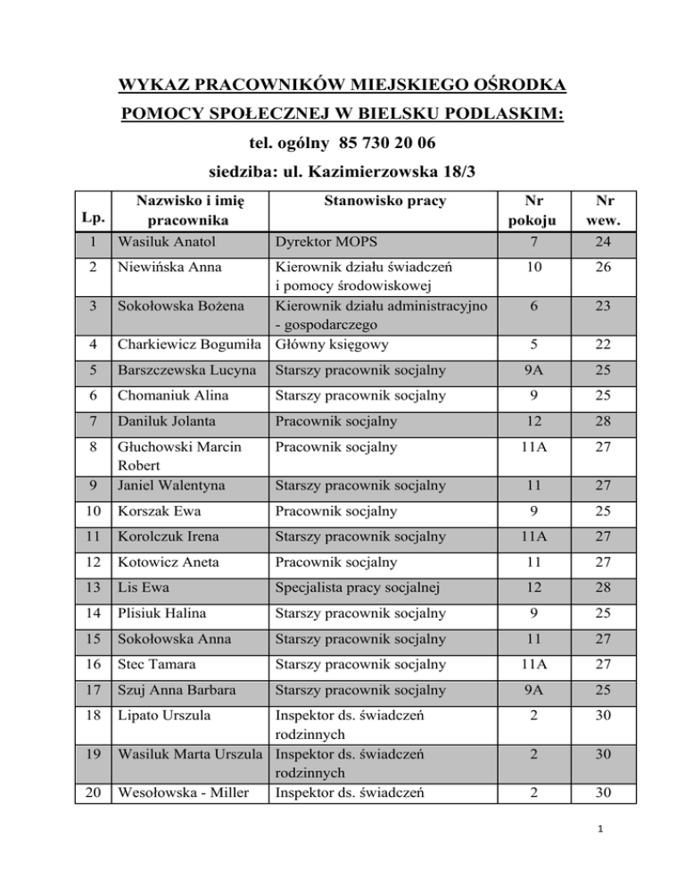 WYKAZ PRACOWNIKÓW MIEJSKIEGO OŚRODKA POMOCY SPOŁECZNEJ W BIELSKU PODLASKIM: tel. ogólny 85 730 20 06 siedziba: ul. Kazimierzowska 18/3 Nazwisko i imię Lp. pracownika 1 Wasiluk Anatol Nr pokoju 7 Nr wew. 24 10 26 6 23 4 Kierownik działu świadczeń i pomocy środowiskowej Sokołowska Bożena Kierownik działu administracyjno - gospodarczego Charkiewicz Bogumiła Główny księgowy 5 22 5 Barszczewska Lucyna Starszy pracownik socjalny 9A 25 6 Chomaniuk Alina Starszy pracownik socjalny 9 25 7 Daniluk Jolanta Pracownik socjalny 12 28 8 Pracownik socjalny 11A 27 9 Głuchowski Marcin Robert Janiel Walentyna Starszy pracownik socjalny 11 27 10 Korszak Ewa Pracownik socjalny 9 25 11 Korolczuk Irena Starszy pracownik socjalny 11A 27 12 Kotowicz Aneta Pracownik socjalny 11 27 13 Lis Ewa Specjalista pracy socjalnej 12 28 14 Plisiuk Halina Starszy pracownik socjalny 9 25 15 Sokołowska Anna Starszy pracownik socjalny 11 27 16 Stec Tamara Starszy pracownik socjalny 11A 27 17 Szuj Anna Barbara Starszy pracownik socjalny 9A 25 18 Lipato Urszula 2 30 2 30 2 30 2 3 19 20 Stanowisko pracy Dyrektor MOPS Niewińska Anna Inspektor ds. świadczeń rodzinnych Wasiluk Marta Urszula Inspektor ds. świadczeń rodzinnych Wesołowska - Miller Inspektor ds. świadczeń 1 21 Alina Tymosiak Zofia rodzinnych Kasjer 22 Iwanicka Maria Konsultant prawnik 23 Golubiewska Elżbieta 24 Kalinowska - Sidoruk Marta Konachowicz Grzegorz Niewiński Marcin Inspektor ds. świadczeń z pomcy społecznej Inspektor ds. świadczeń z pomcy społecznej Inspektor ds. świadczeń z pomcy społecznej Inspektor administracyjno gospodarczy 25 26 5 22 12A 31 13 21 13 21 13 21 13 21 W powyższym wykazie nie są ujęte osoby zatrudnione na stanowisku opiekunki ze względu na charakter wykonywanej pracy (świadczenie usług opiekuńczych w miejscu zamieszkania osób objętych usługami). 2