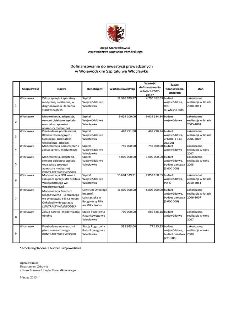 Urząd Marszałkowski Województwa Kujawsko-Pomorskiego Dofinansowanie do inwestycji prowadzonych w Wojewódzkim Szpitalu we Włocławku Miejscowość Nazwa Beneficjent Wartość inwestycji Wartość Źródło dofinansowania finansowaniastan w latach 2007program 2013* 4 790 352,03 budżet zakończone województwa, realizacja w latach RPO 2008-2011 śr. własne jedn. Włocławek Zakup sprzętu i aparatury medycznej niezbędnej w diagnozowaniu i leczeniu stanów nagłych Szpital Wojewódzki we Włocławku 11 566 079,87 Włocławek Modernizacja, adaptacja, remont obiektow szpitala oraz zakup sprzetu i aparatury medycznej Przebudowa pomieszczeń Bloków Operacyjnych Ogólnego i Oddziałów Ginekologii i Urologii Modernizacja pomieszczeń i zakup sprzętu medycznego Szpital Wojewódzki we Włocławku 9 024 100,00 9 019 334,34 budżet województwa zakończone realizacja w latach 2005-2007 Szpital Wojewódzki we Włocławku 488 791,00 zakończone realizacja w latach 2006-2007 Szpital Wojewódzki we Włocławku Szpital Wojewódzki we Włocławku 750 000,00 488 790,34 budżet województwa, ZPORR (1 313 023,00) 750 000,00 budżet województwa zakończone realizacja w latach 2010-2011 1. 2. Włocławek 3. Włocławek 4. Włocławek 5. Włocławek 6. Włocławek 7. Modernizacja, adaptacja, remont obiektow szpitala oraz zakup sprzetu i aparatury medycznej KONTRAKT WOJEWÓDZKI Modernizacja SOR wraz z zakupem sprzętu dla Szpitala Wojewódzkiego we Włocławku POIiŚ Modernizacja Centrum Diagnostyczno - Leczniczego we Włocławku Filii Centrum Onkologii w Bydgoszczy KONTRAKT WOJEWÓDZKI 4 000 000,00 Szpital Wojewódzki we Włocławku 15 684 579,91 2 053 188,55 budżet województwa, POIiŚ Centrum Onkologii im. prof. Łukaszczyka w Bydgoszczy Filia we Włocławku 11 800 000,00 6 800 000,00 budżet zakończone województwa, realizacja w latach budżet państwa 2006-2007 (5 000 000) Włocławek Zakup karetki i modernizacja Stacja Pogotowia obiektu Ratunkowego we Włocławku 700 000,00 Włocławek Przebudowa nawierzchni placu manewrowego KONTRAKT WOJEWÓDZKI 333 643,00 8. 9. * środki wypłacone z budżetu województwa Opracowanie: Departament Zdrowia i Biuro Prasowe Urzędu Marszałkowskiego Marzec 2013 r. zakończone, realizacja w roku 2007 1 000 000,00 budżet zakończone, województwa, realizacja w roku budżet państwa 2008 (3 000 000) Stacja Pogotowia Ratunkowego we Włocławku 680 528,18 budżet województwa zakończone, realizacja w roku 2007 77 195,23 budżet zakończone, województwa, realizacja w roku budżet państwa 2008 (231 586)