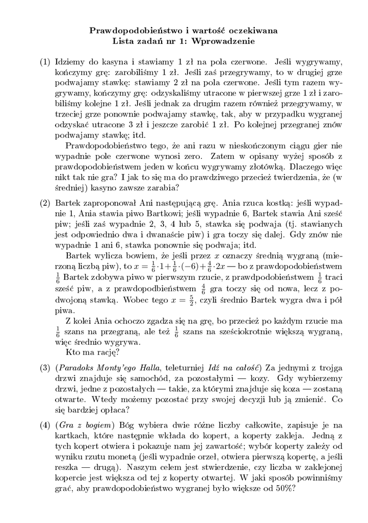 Prawdopodobie«stwo i warto±¢ oczekiwana Lista zada« nr 1: Wprowadzenie (1) Idziemy do kasyna i stawiamy 1 zª na pola czerwone. Je±li wygrywamy, ko«czymy gr¦: zarobili±my 1 zª. Je±li za± przegrywamy, to w drugiej grze podwajamy stawk¦: stawiamy 2 zª na pola czerwone. Je±li tym razem wygrywamy, ko«czymy gr¦: odzyskali±my utracone w pierwszej grze 1 zª i zarobili±my kolejne 1 zª. Je±li jednak za drugim razem równie» przegrywamy, w trzeciej grze ponownie podwajamy stawk¦, tak, aby w przypadku wygranej odzyska¢ utracone 3 zª i jeszcze zarobi¢ 1 zª. Po kolejnej przegranej znów podwajamy stawk¦; itd. Prawdopodobie«stwo tego, »e ani razu w niesko«czonym ci¡gu gier nie wypadnie pole czerwone wynosi zero. Zatem w opisany wy»ej sposób z prawdopodobie«stwem jeden w ko«cu wygrywamy zªotówk¡. Dlaczego wi¦c nikt tak nie gra? I jak to si¦ ma do prawdziwego przecie» twierdzenia, »e (w ±redniej) kasyno zawsze zarabia? (2) Bartek zaproponowaª Ani nast¦puj¡c¡ gr¦. Ania rzuca kostk¡: je±li wypadnie 1, Ania stawia piwo Bartkowi; je±li wypadnie 6, Bartek stawia Ani sze±¢ piw; je±li za± wypadnie 2, 3, 4 lub 5, stawka si¦ podwaja (tj. stawianych jest odpowiednio dwa i dwana±cie piw) i gra toczy si¦ dalej. Gdy znów nie wypadnie 1 ani 6, stawka ponownie si¦ podwaja; itd. Bartek wylicza bowiem, »e je±li przez x oznaczy ±redni¡ wygran¡ (mierzon¡ liczb¡ piw), to x = ·1+ ·(−6)+ ·2x bo z prawdopodobie«stwem Bartek zdobywa piwo w pierwszym rzucie, z prawdpodobie«stwem traci sze±¢ piw, a z prawdopodbie«stwem gra toczy si¦ od nowa, lecz z podwojon¡ stawk¡. Wobec tego x = , czyli ±rednio Bartek wygra dwa i póª piwa. Z kolei Ania ochoczo zgadza si¦ na gr¦, bo przecie» po ka»dym rzucie ma szans na przegran¡, ale te» szans na sze±ciokrotnie wi¦ksz¡ wygran¡, wi¦c ±rednio wygrywa. Kto ma racj¦? (3) ( , teleturniej ) Za jednymi z trojga drzwi znajduje si¦ samochód, za pozostaªymi kozy. Gdy wybierzemy drzwi, jedne z pozostaªych takie, za którymi znajduje si¦ koza zostan¡ otwarte. Wtedy mo»emy pozosta¢ przy swojej decyzji lub j¡ zmieni¢. Co si¦ bardziej opªaca? (4) ( ) Bóg wybiera dwie ró»ne liczby caªkowite, zapisuje je na kartkach, które nast¦pnie wkªada do kopert, a koperty zakleja. Jedn¡ z tych kopert otwiera i pokazuje nam jej zawarto±¢; wybór koperty zale»y od wyniku rzutu monet¡ (je±li wypadnie orzeª, otwiera pierwsz¡ kopert¦, a je±li reszka drug¡). Naszym celem jest stwierdzenie, czy liczba w zaklejonej kopercie jest wi¦ksza od tej z koperty otwartej. W jaki sposób powinni±my gra¢, aby prawdopodobie«stwo wygranej byªo wi¦ksze od 50%? 1 6 1 6 1 6 4 6 5 2 1 6 Paradoks Monty'ego Halla Gra z bogiem 4 6 1 6 Id¹ na caªo±¢ 1 6 (5) ( ) Ania rzucaªa monet¡, a» wypadª orzeª. Zanim to si¦ staªo, reszka wypadªa X razy. Ania wªo»yªa do jednej koperty 3 zª, za± do drugiej 3 zª. Koperty zakleiªa, a nast¦pnie wybraªa losowo (rzucaj¡c monet¡, a jak»e) jedn¡ z nich i wr¦czyªa Bartkowi. Bartek otworzyª j¡ i zobaczyª, ile jest w niej pieni¦dzy. Wtedy Ania wyja±niªa mu, co zrobiªa z kopertami i zapytaªa, czy woli zachowa¢ t¦, któr¡ dostaª, czy wymieni¢ j¡ na drug¡. Co powinien zrobi¢ Bartek? (6) Test na HIV wykonany u osoby zdrowej daje wynik pozytywny w przypadku ok. 15 osób na 1000. Z kolei test wykonany u osoby chorej daje wynik negatywny u przeci¦tnie 1 osoby na 1000. W Polsce mniej wi¦cej jedna osoba na tysi¡c jest chora na HIV. Wybrany losowo Polak zrobiª test i uzyskaª wynik pozytywny. Jakie jest prawdopodobie«stwo, »e jest zaka»ony HIV? (7) ( ) Uniwersytet Kalifornijski w Berkeley zostaª pozwany za dyskryminacj¦ kobiet: w 1973 roku przyj¦to a» 44% kandydatów na studia, lecz zaledwie 35% kandydatek. Gdy zbadano wyniki na poszczególnych wydziaªach, okazaªo si¦ jednak, »e nigdzie kobiety nie byªy (w ten sposób) dyskryminowane, natomiast w wielu przypadkach przyj¦to wi¦kszy odsetek kandydatek ni» kandydatów. Jak to mo»liwe? Aby to zrozumie¢, przeanalizuj dane z wybranych czterech wydziaªów: wydziaª kandydaci przyj¦ci kandydatki przyj¦te A 825 512 108 89 B 560 353 25 17 C 417 138 375 131 D 272 16 341 24 ª¡cznie 2074 1019 849 261 Paradoks dwóch kopert X X+1 Paradoks Simpsona